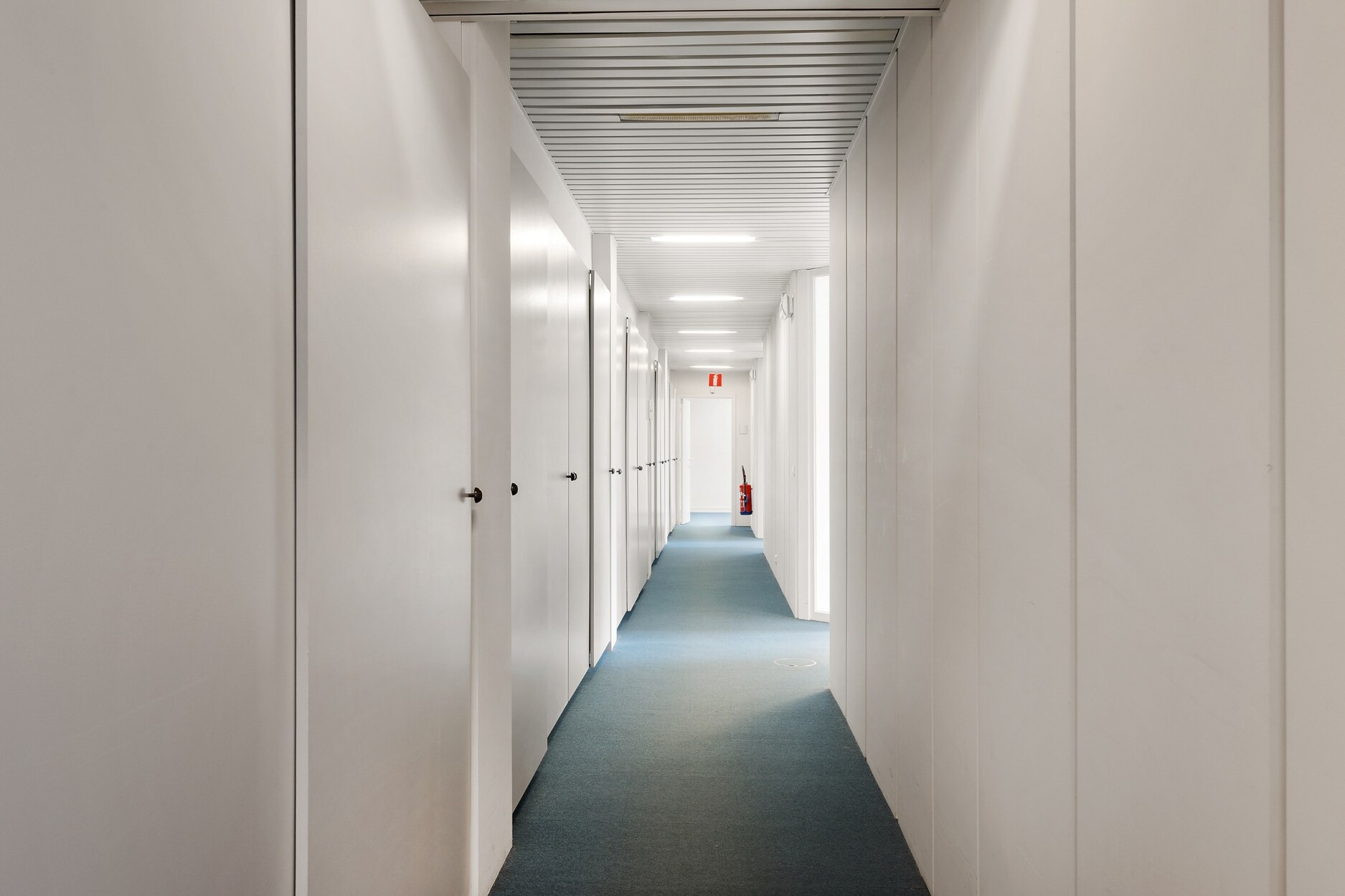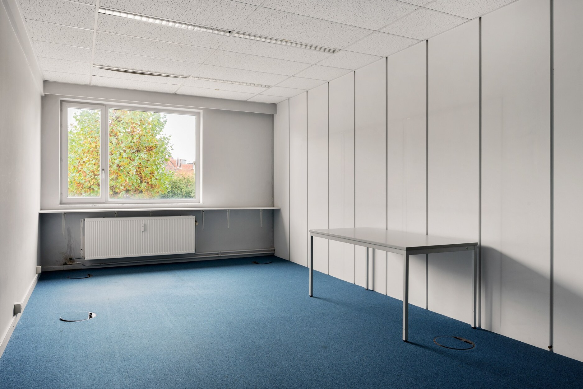 Ruime inkomhal, 2 kantoren aan de voorkant, 2 open kantoorruimtes, wachtruimte en een ruime stockage ruimte. Sanitaire voorziening. Uitgeruste kitchenette. Achteraan een lange gang met ingemaakte kasten, archiefruimte, 8 kantoren en 2 vergaderlokalen. Door valse wanden zijn deze ruimtes perfect moduleerbaar (mogelijkheid creëren eigen indeling).