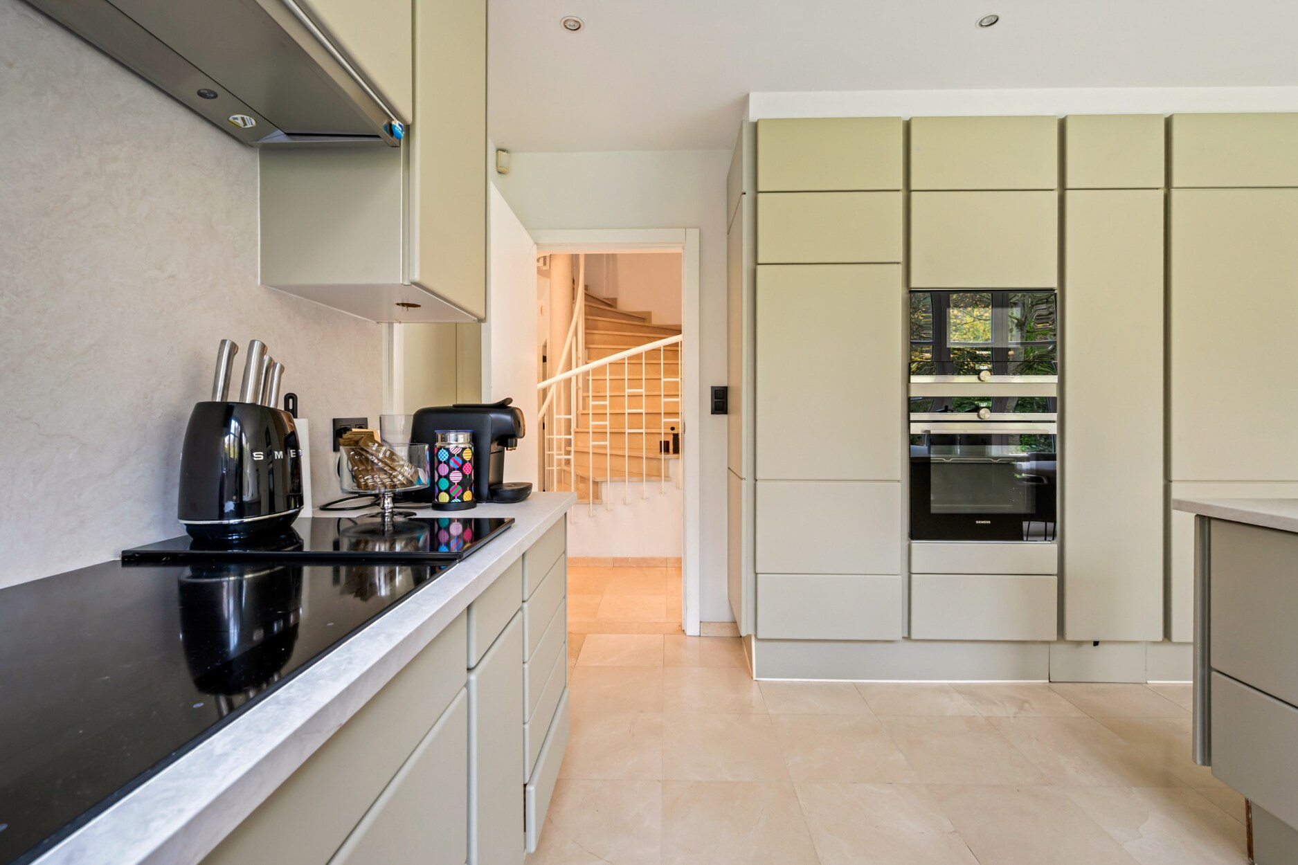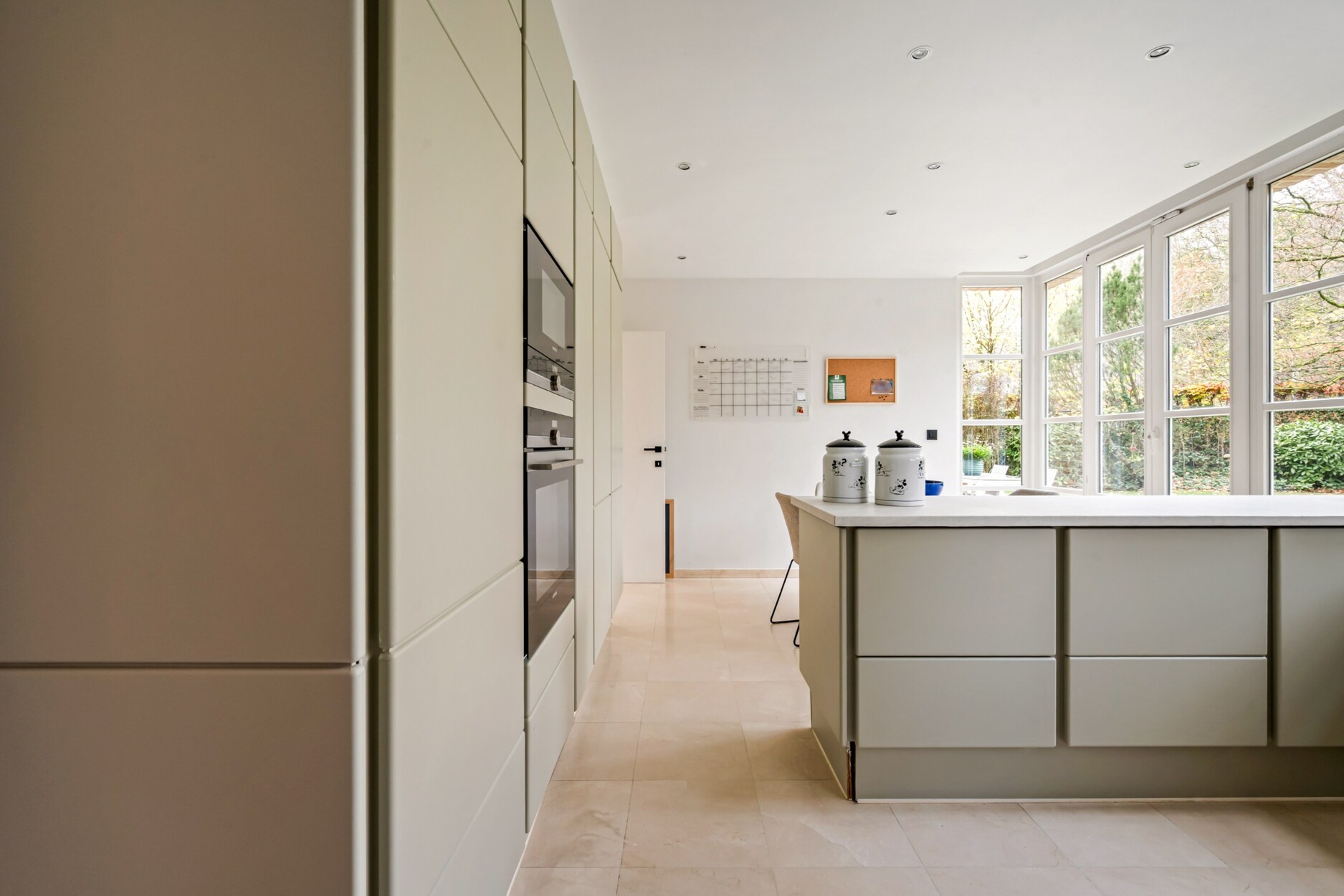 De prachtige leefruimte is smaakvol ingericht en is heel aangenaam vertoeven dankzij de vloerverwarming en open haard. Aansluitend bevindt zich de praktische, volledig uitgeruste keuken met toestellen van A-merken, ideaal voor wie houdt van koken in een stijlvolle, functionele omgeving en geniet dankzij de grote raampartijen van overvloedige lichtinval.