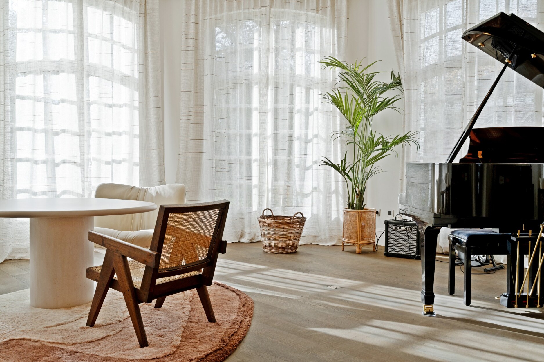 De formele eetkamer straalt grandeur uit met haar hoge plafonds, moulures, dubbele deuren en grote ramen met zicht op de tuin. Aansluitend bevindt zich het stijlvolle salon met brede houten vloeren, verfijnde raambekleding en een indrukwekkende natuurstenen schouwmantel. De aangrenzende muziekkamer met grote erker en vleugelpiano vormt een aparte, lichtrijke zithoek.