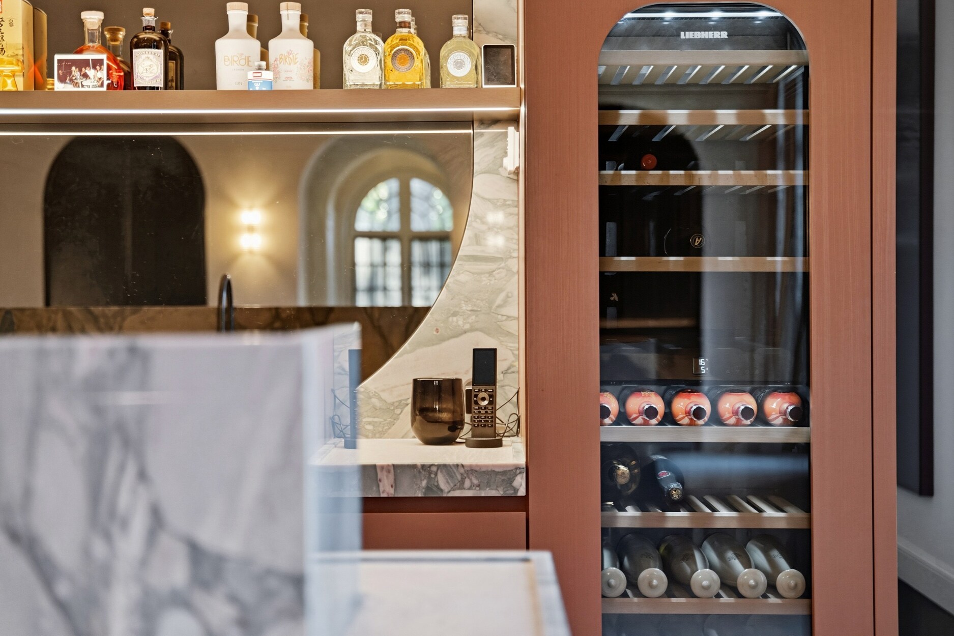 Vanuit de hoofdbouw bereikt men de indrukwekkende leisure-vleugel. De ruime bar en lounge met monumentale houten spanten, hoge plafonds en sculpturale, afgeronde natuurstenen bar doet denken aan een private members club. Maatwerkkasten, verlichte schappen en een wijnklimaatkast versterken de exclusieve uitstraling.