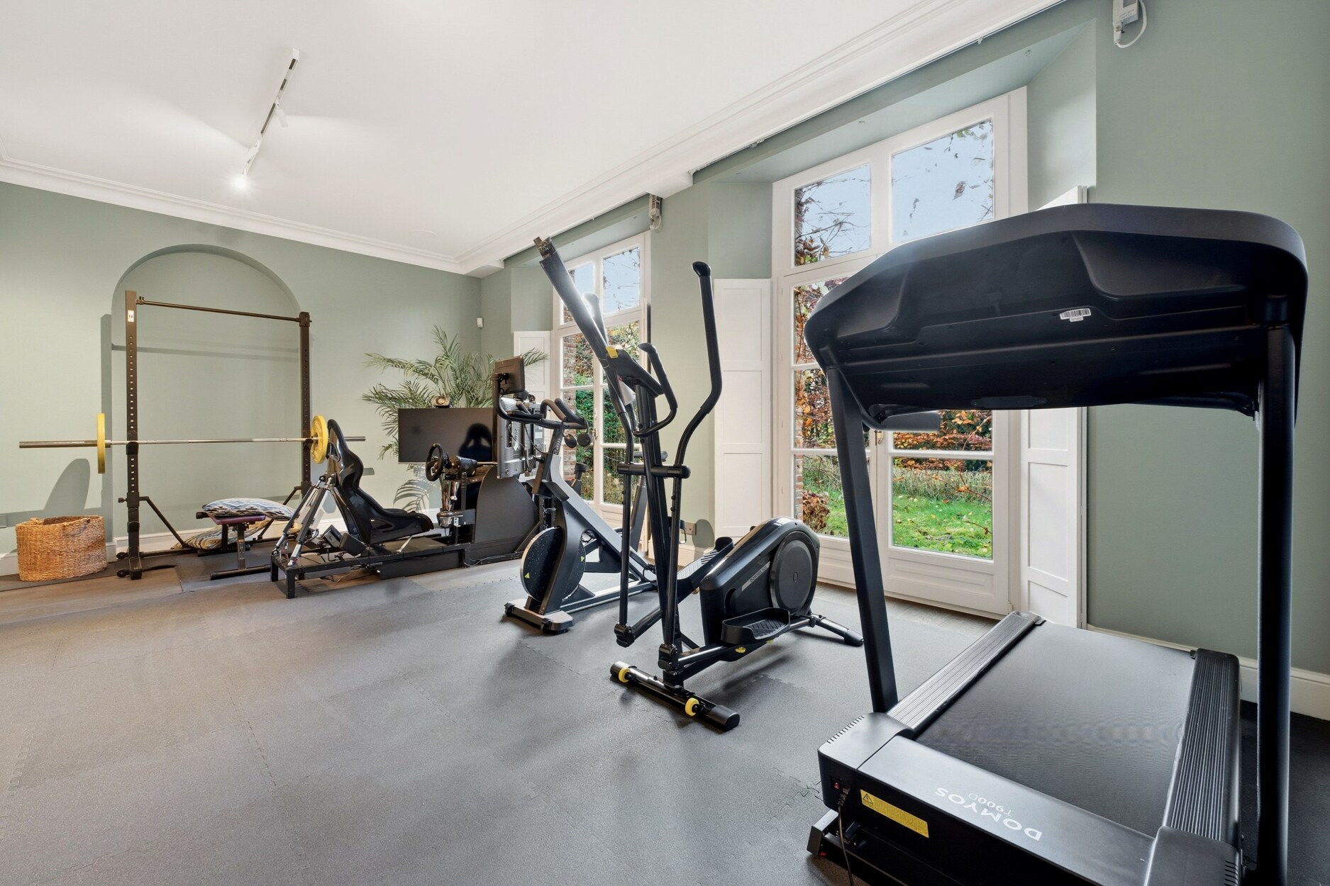 De fitnessruimte is royaal opgezet en uitgerust met professionele toestellen, rubberen sportvloer en grote ramen met zicht op de tuin.