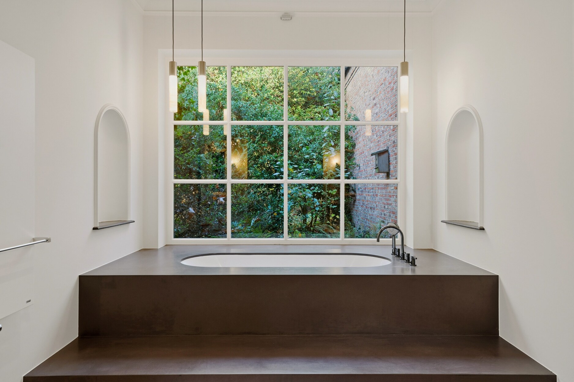 Aansluitend bevindt zich de luxueuze wellness, bestaande uit een authentieke hammam in mozaïek en microtopping, en een stijlvolle sauna in donker thermowood met boogramen die uitkijken op de tuin. Deze ruimte creëert een serene spa-beleving binnen eigen huis.