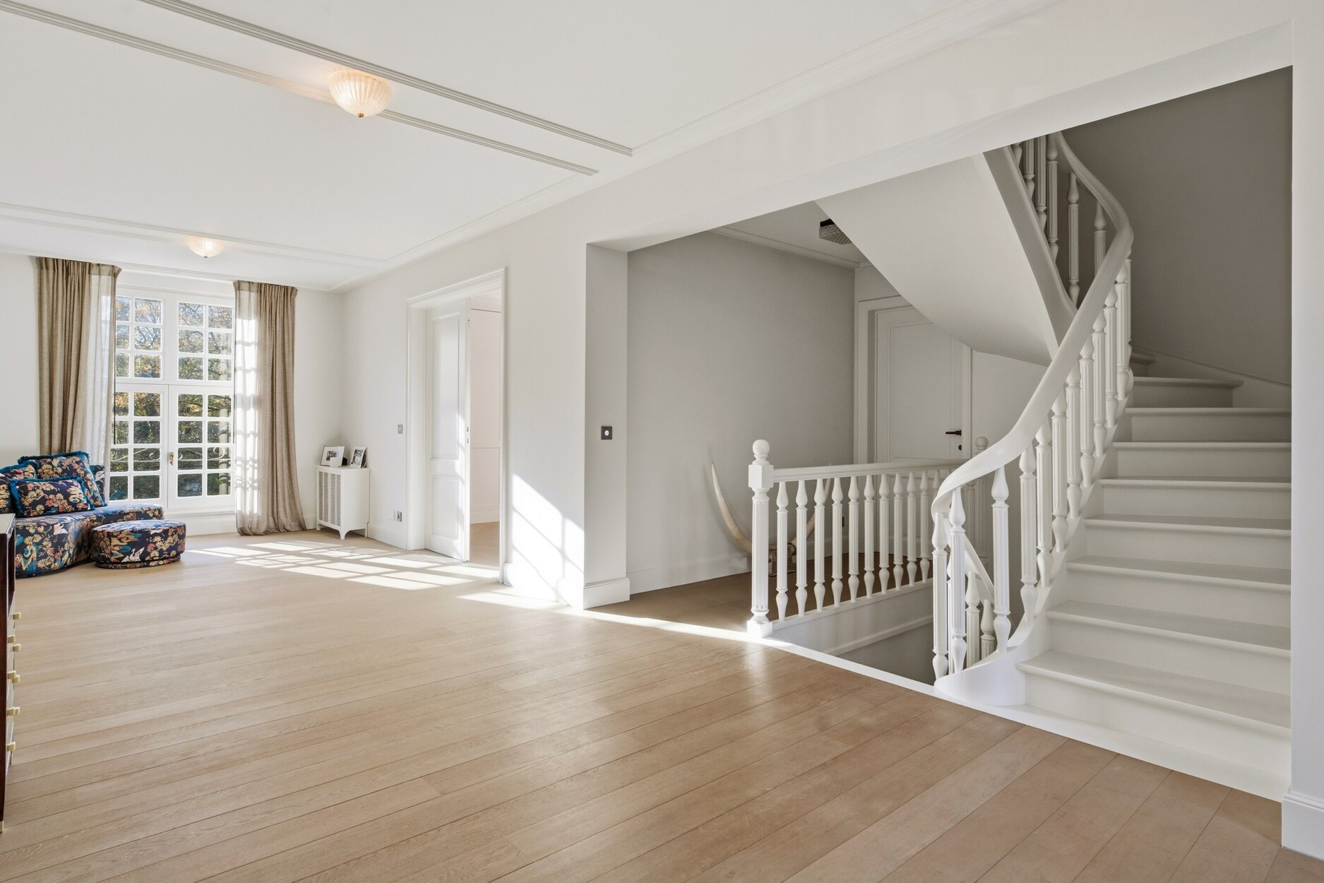 Via de statige inkomhal met unieke visgraatvloer en elegante witgelakte trap betreden we de woning. De hal geniet van prachtige lichtinval dankzij de hoge raampartijen en vormt de centrale as van het huis.