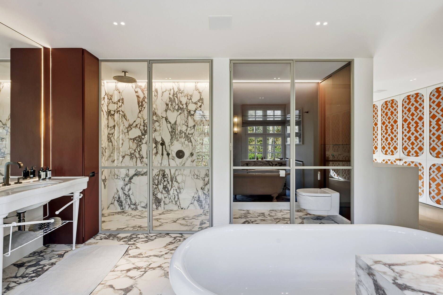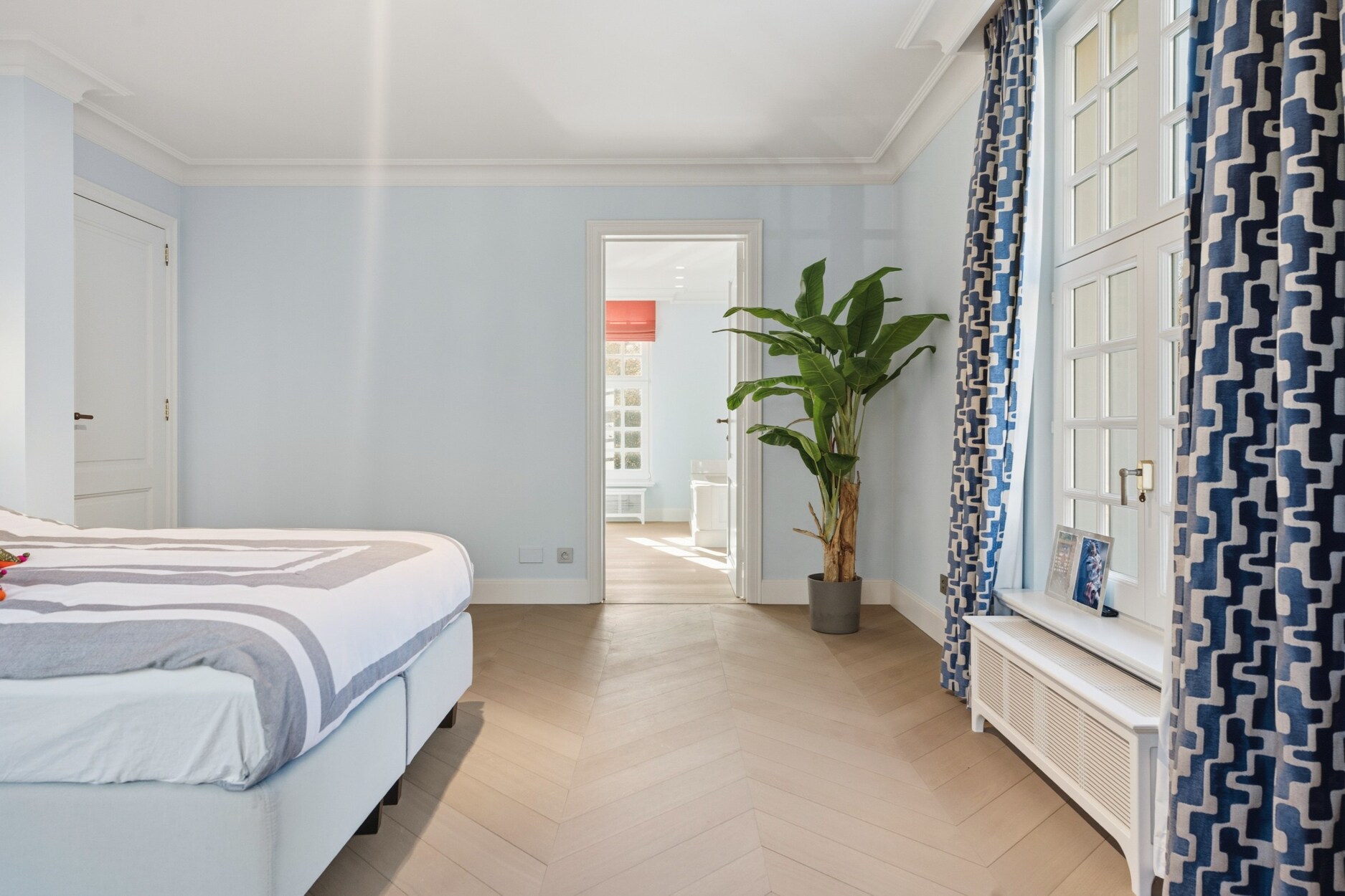 De master suite omvat een ruime slaapkamer met visgraatparket, maatwerkkasten en een indrukwekkende op maat gemaakte dressing met decoratieve grafische panelen. De ensuite badkamer is een absolute eyecatcher, uitgevoerd in rijk marmer en voorzien van een vrijstaand bad, dubbele wastafel, grote spiegels, luxe armaturen en ramen met zicht op het groen.