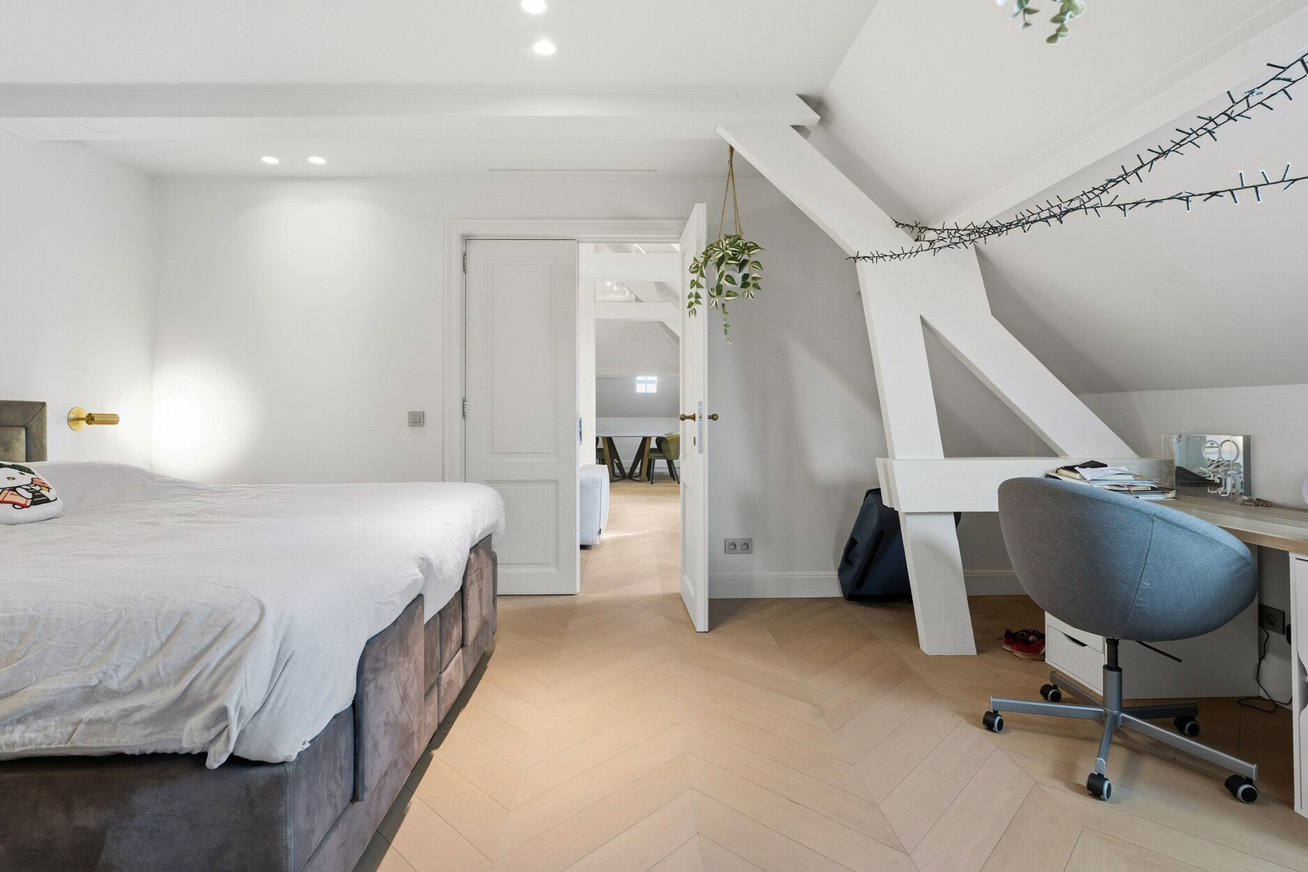 De tweede verdieping werd ingericht als een charmante, volledig autonome suite. Een gezellige TV-hoek met zichtbare houten balken vormt het hart van deze verdieping. Aansluitend bevindt zich een ruime slaapkamer met bureauhoek, een aparte dressing met maatwerkkasten en een moderne badkamer uitgerust met inloopdouche en natuurstenen afwerking. Deze verdieping is ideaal als gastenruimte, tienersuite of private retreat.