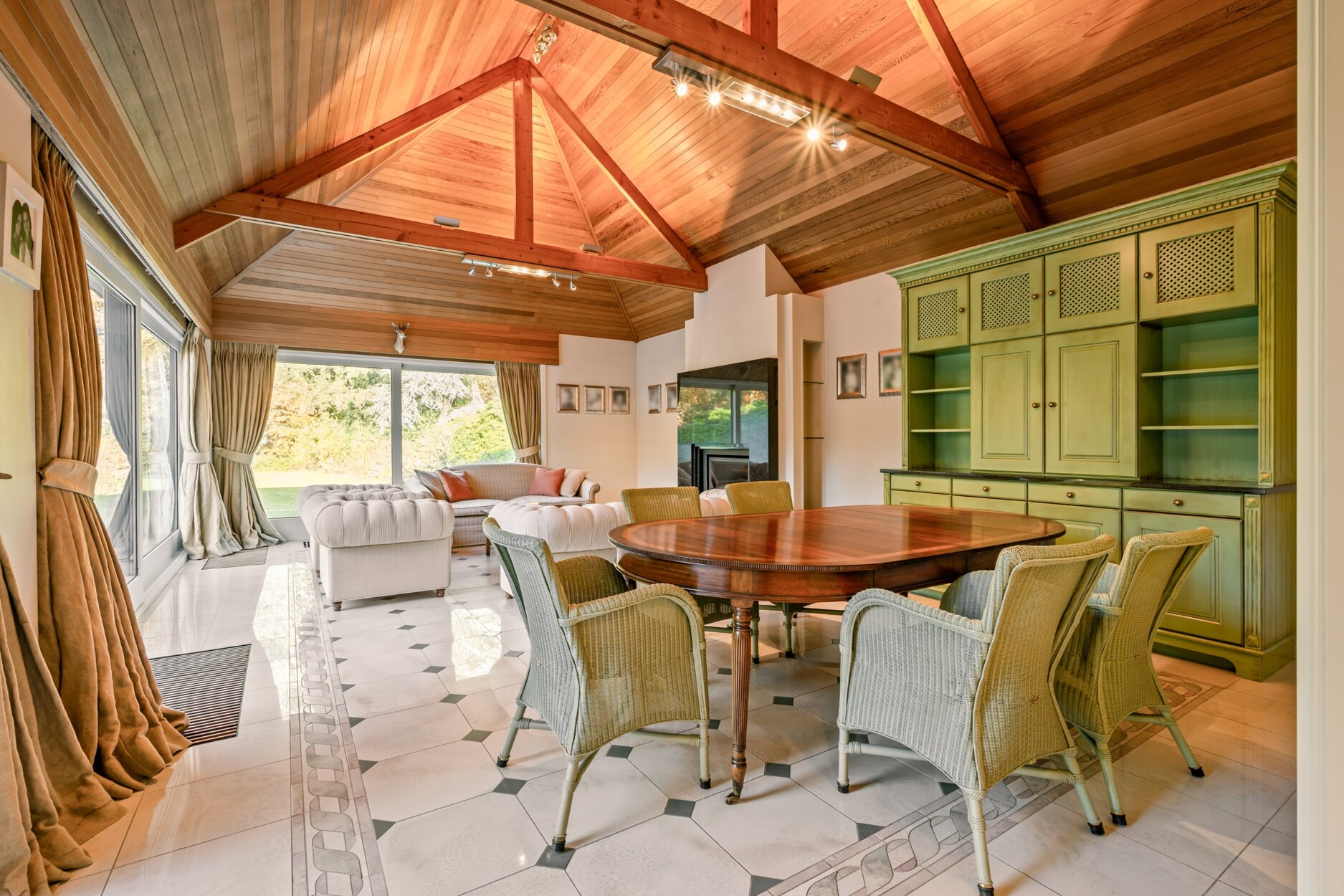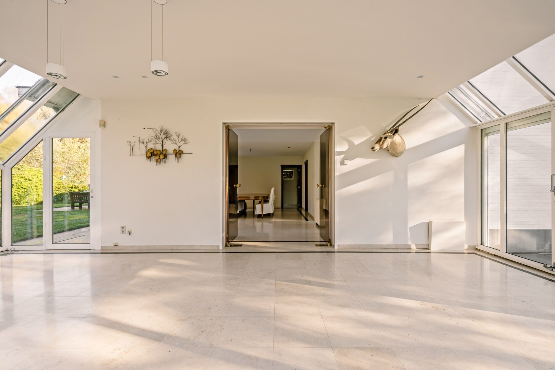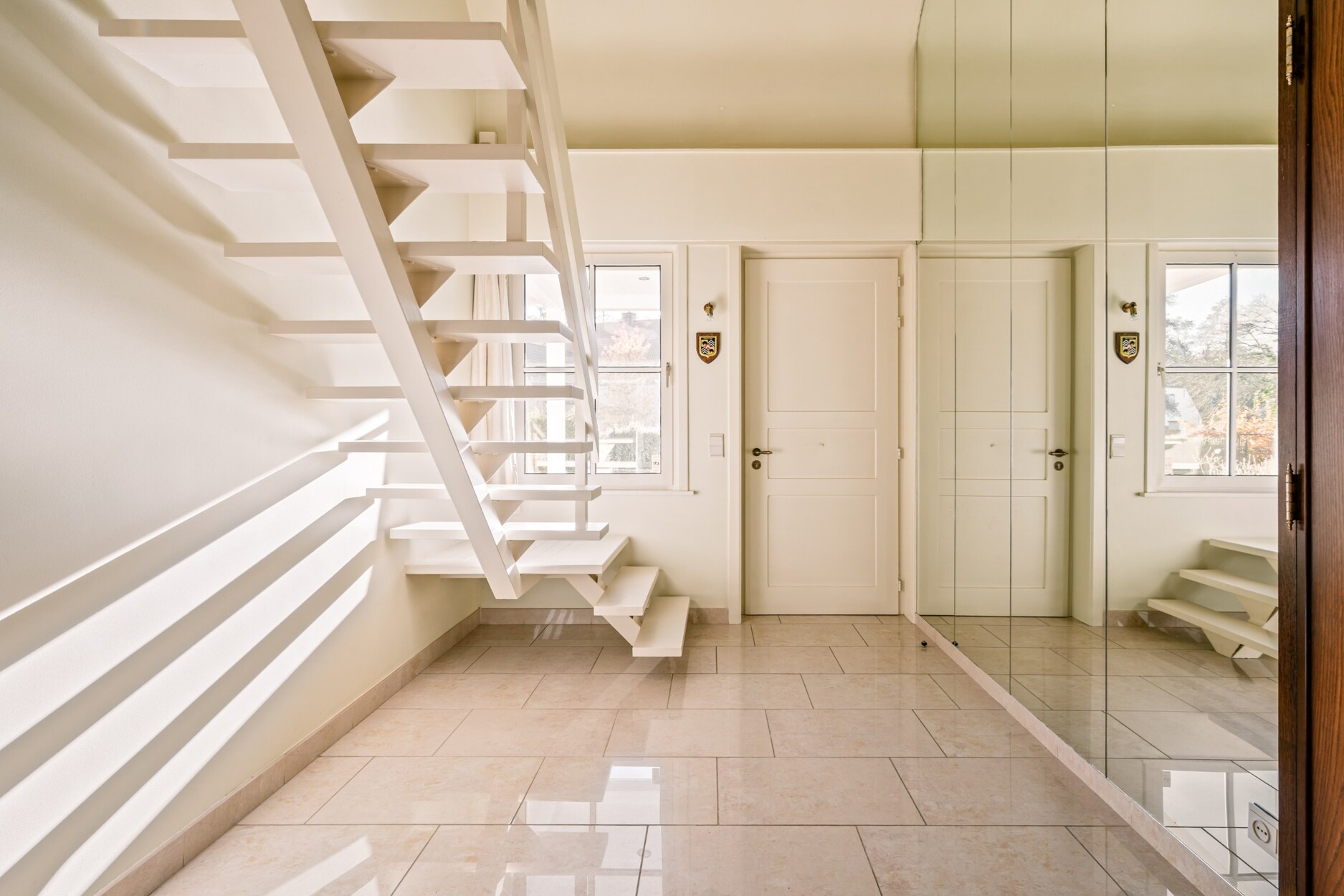 De villa verwelkomt u via een ruime en lichtrijke inkomhal met vestiaire en gastentoilet. Vanuit hier bereikt u de aangename leefruimte met open haard en grote raampartijen, die zorgen voor een prachtig uitzicht op de fraai aangelegde tuin. Aansluitend bevindt zich een sfeervolle leefveranda, volledig omringd door schuiframen en voorzien van automatische zonnescreens, zodat u het hele jaar door geniet van een maximale lichtinval en een harmonieus zicht op het groen.