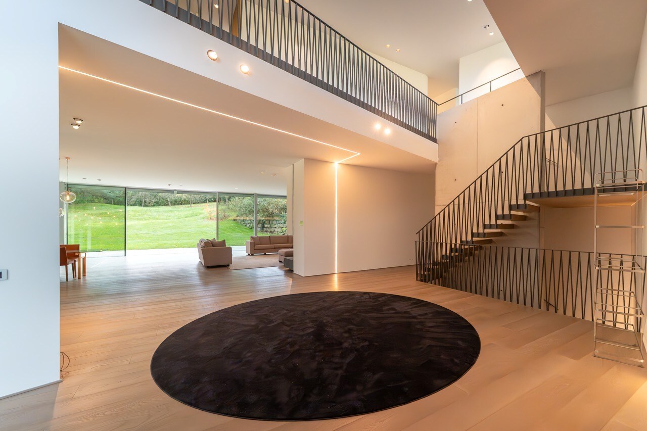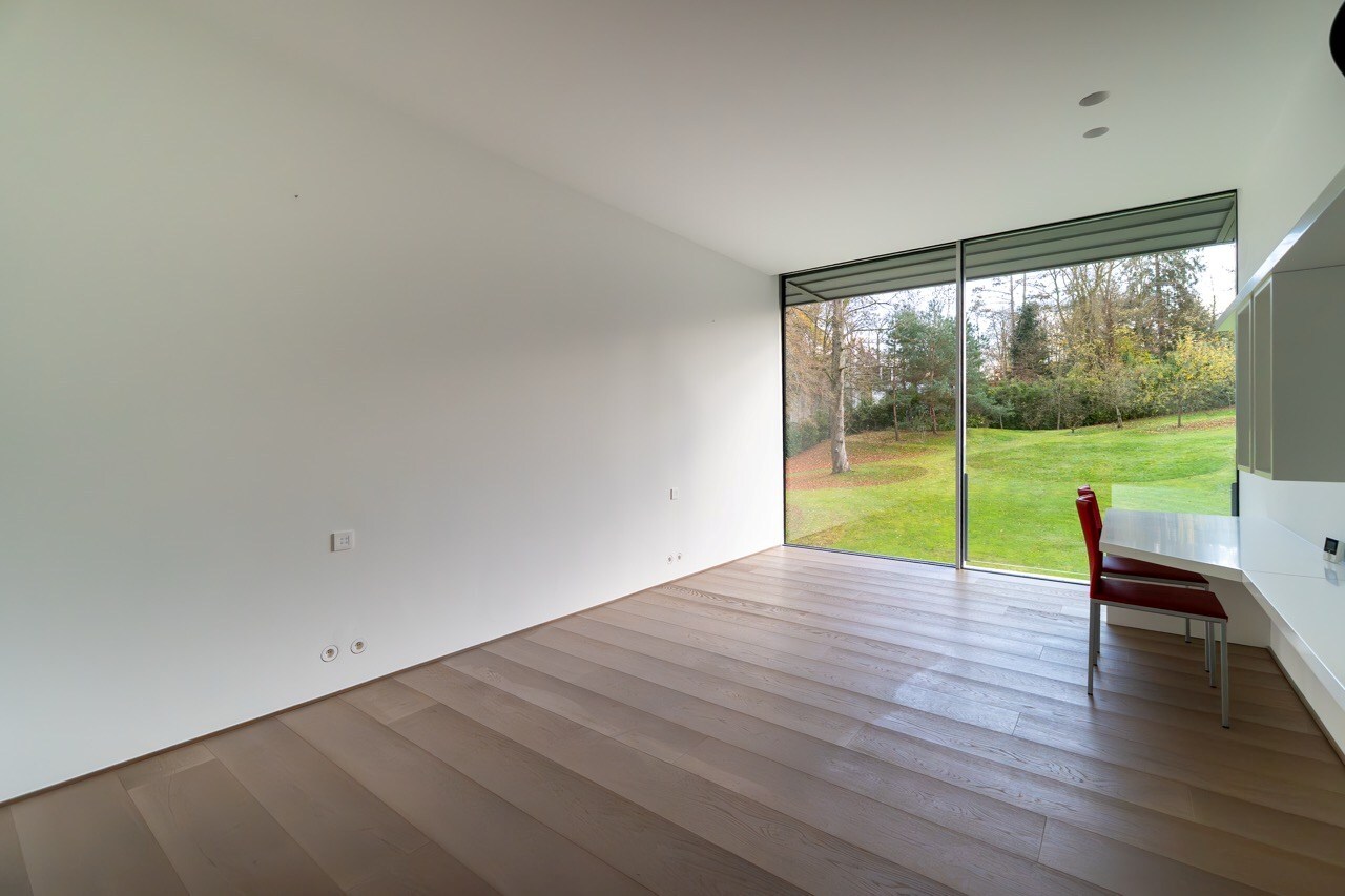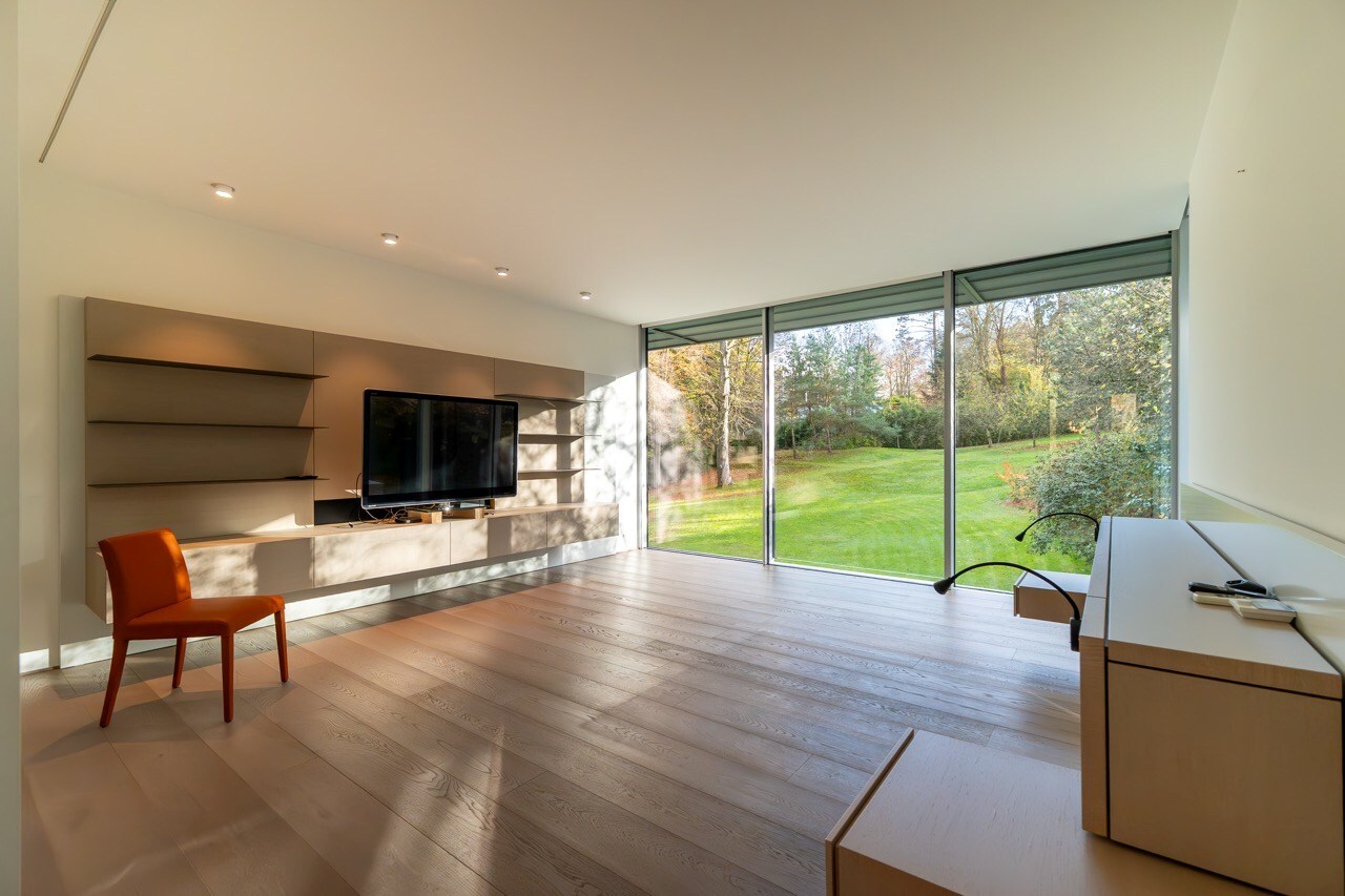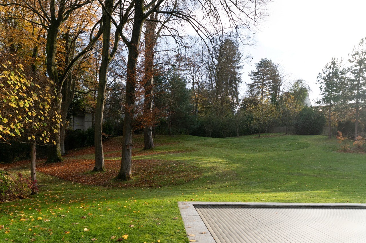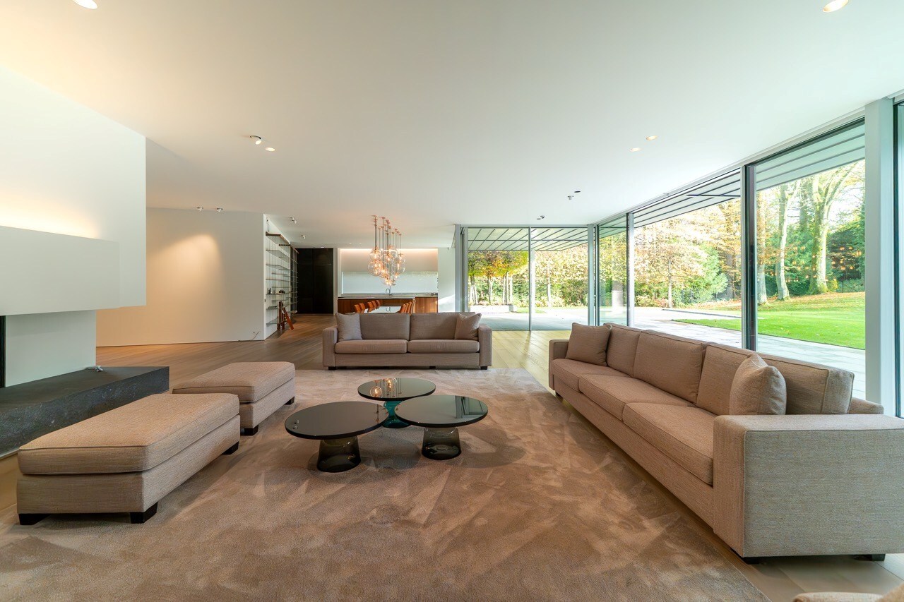 De indrukwekkende inkomhal leidt naar ruime en lichtrijke ontvangstruimten die uitkijken op de tuin, ontworpen door landschapsarchitect Michel Delvosalle. De leefruimten omvatten een eetkamer, een hoofdwoonkamer, een tv-salon, een bureau en een volledig uitgeruste Boffi-keuken met Gaggenau-toestellen, waarin design en functionaliteit harmonieus samenkomen.
