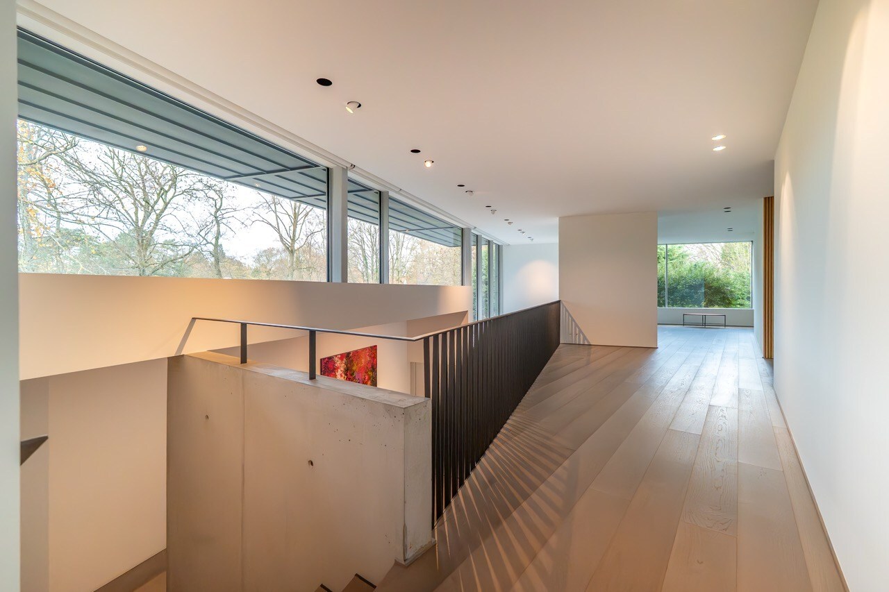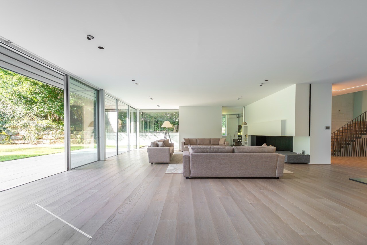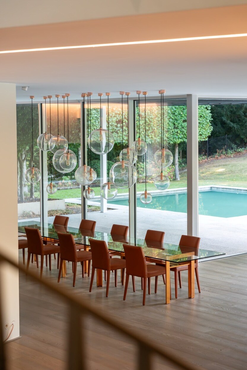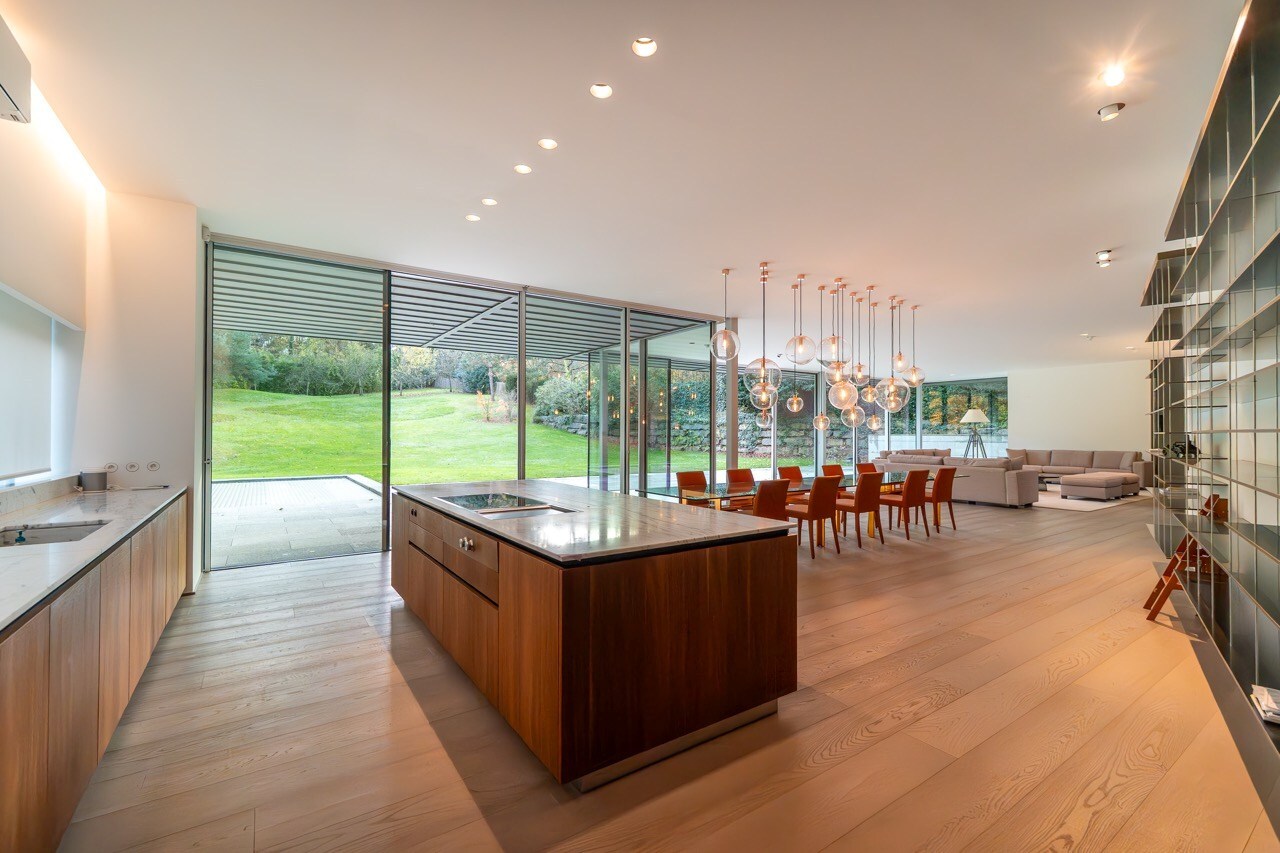 De indrukwekkende inkomhal leidt naar ruime en lichtrijke ontvangstruimten die uitkijken op de tuin, ontworpen door landschapsarchitect Michel Delvosalle. De leefruimten omvatten een eetkamer, een hoofdwoonkamer, een tv-salon, een bureau en een volledig uitgeruste Boffi-keuken met Gaggenau-toestellen, waarin design en functionaliteit harmonieus samenkomen.