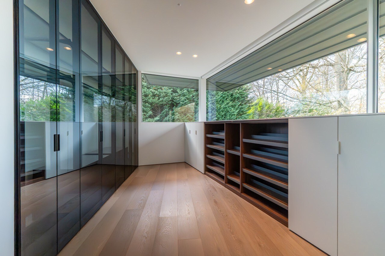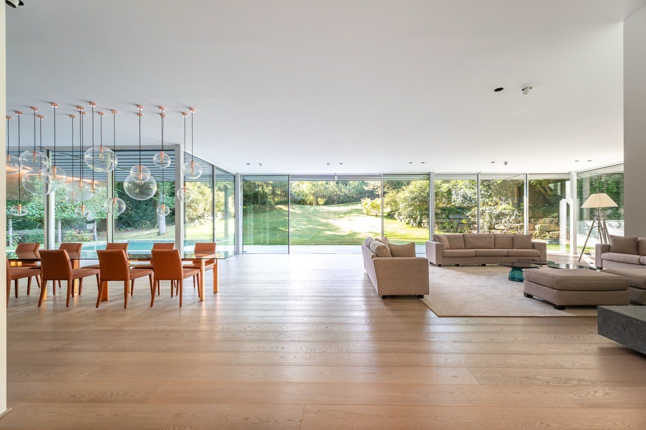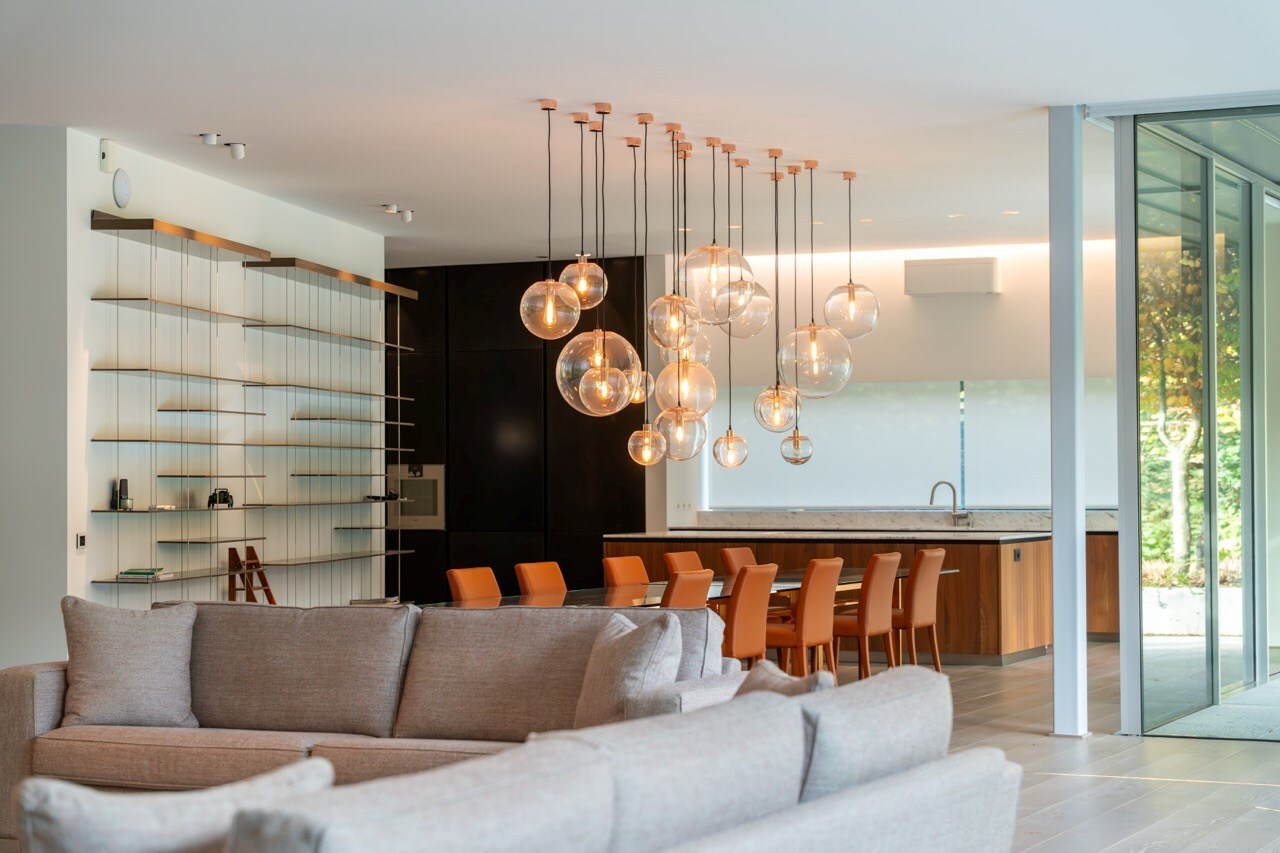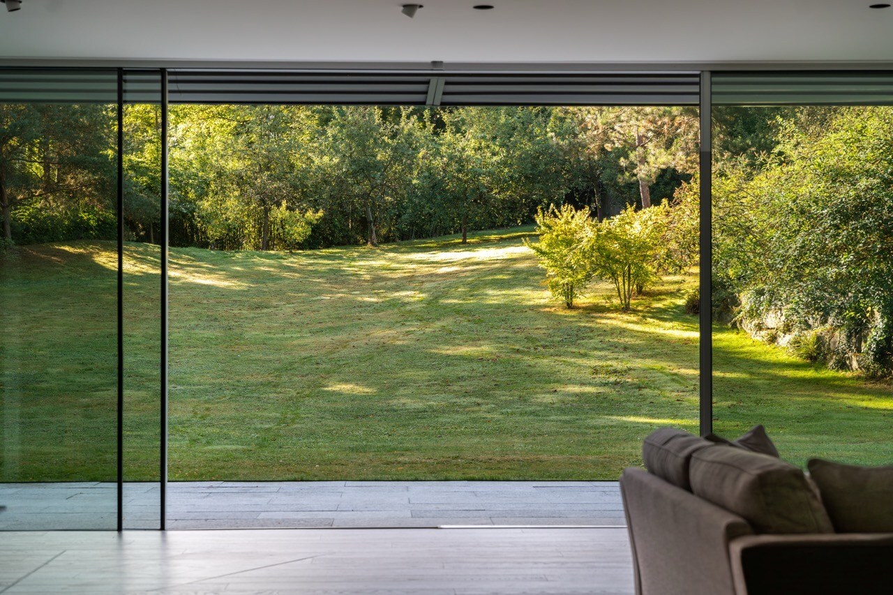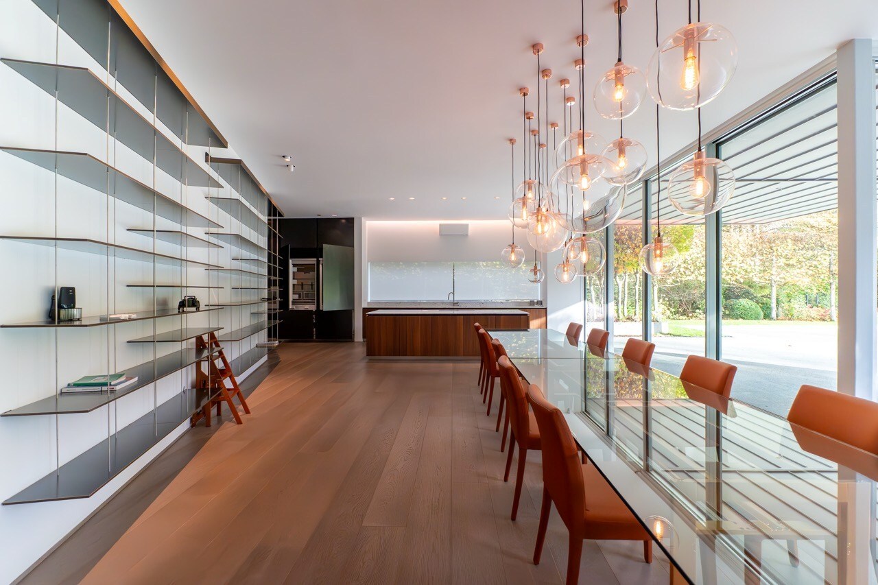De indrukwekkende inkomhal leidt naar ruime en lichtrijke ontvangstruimten die uitkijken op de tuin, ontworpen door landschapsarchitect Michel Delvosalle. De leefruimten omvatten een eetkamer, een hoofdwoonkamer, een tv-salon, een bureau en een volledig uitgeruste Boffi-keuken met Gaggenau-toestellen, waarin design en functionaliteit harmonieus samenkomen.