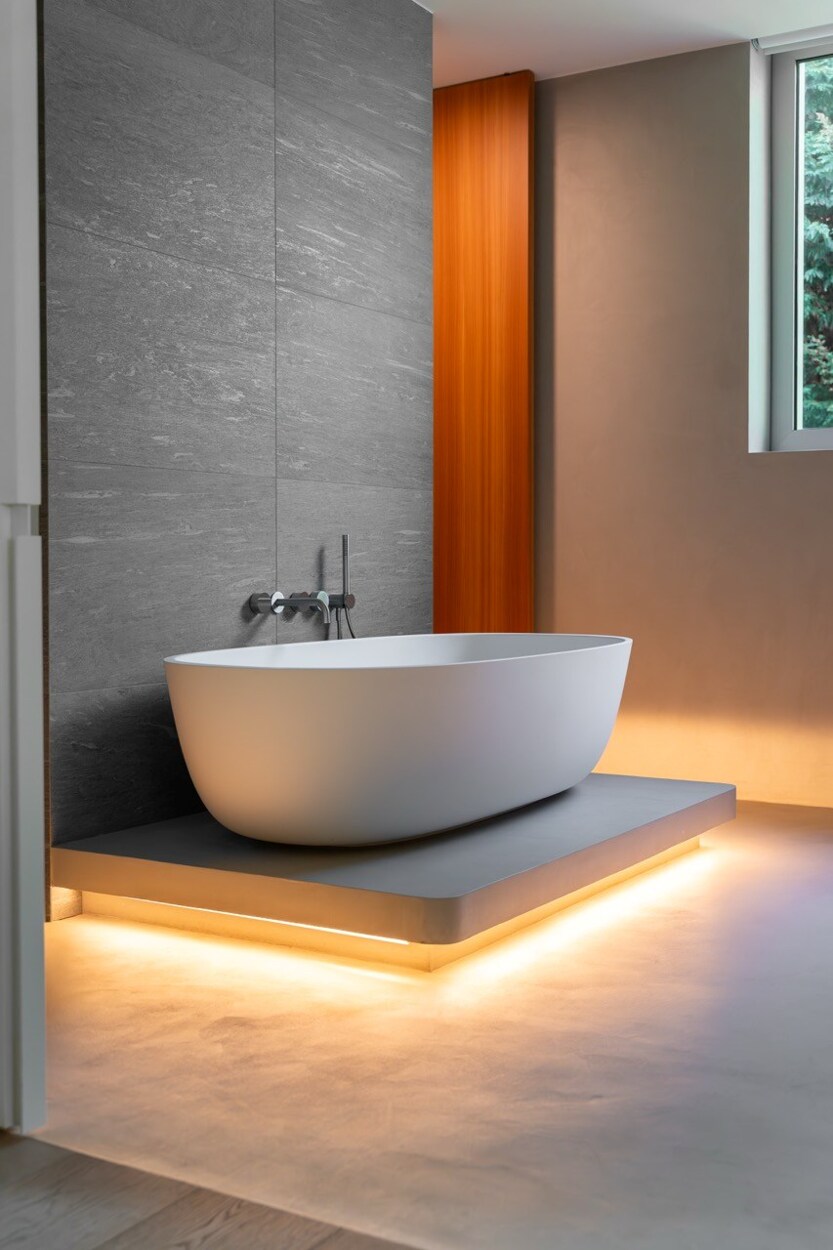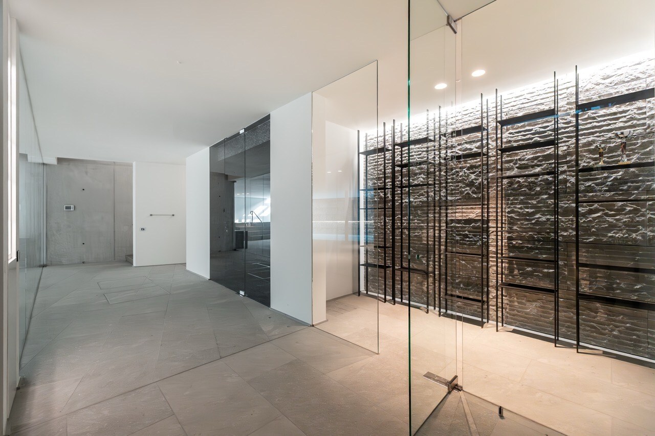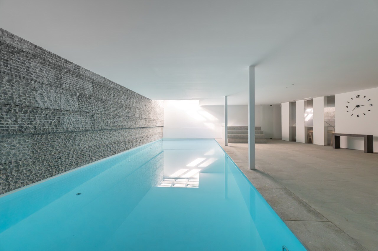 Het souterrain is volledig gewijd aan ontspanning en welzijn, met een binnenzwembad in wit beton, jacuzzi, hammam, fitnessruimte en een aparte conciërgewoning met kitchenette, slaapkamer en douchekamer.