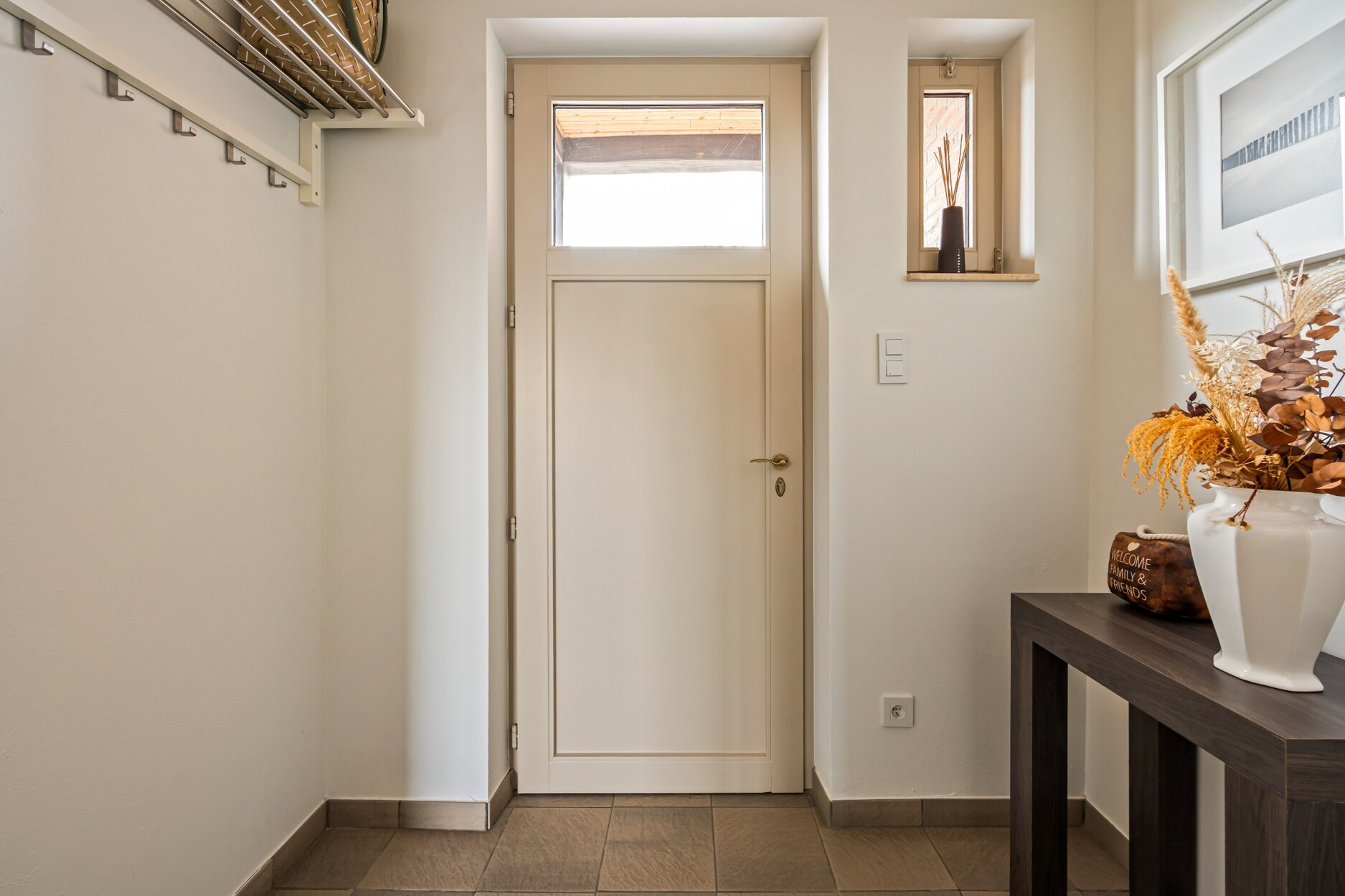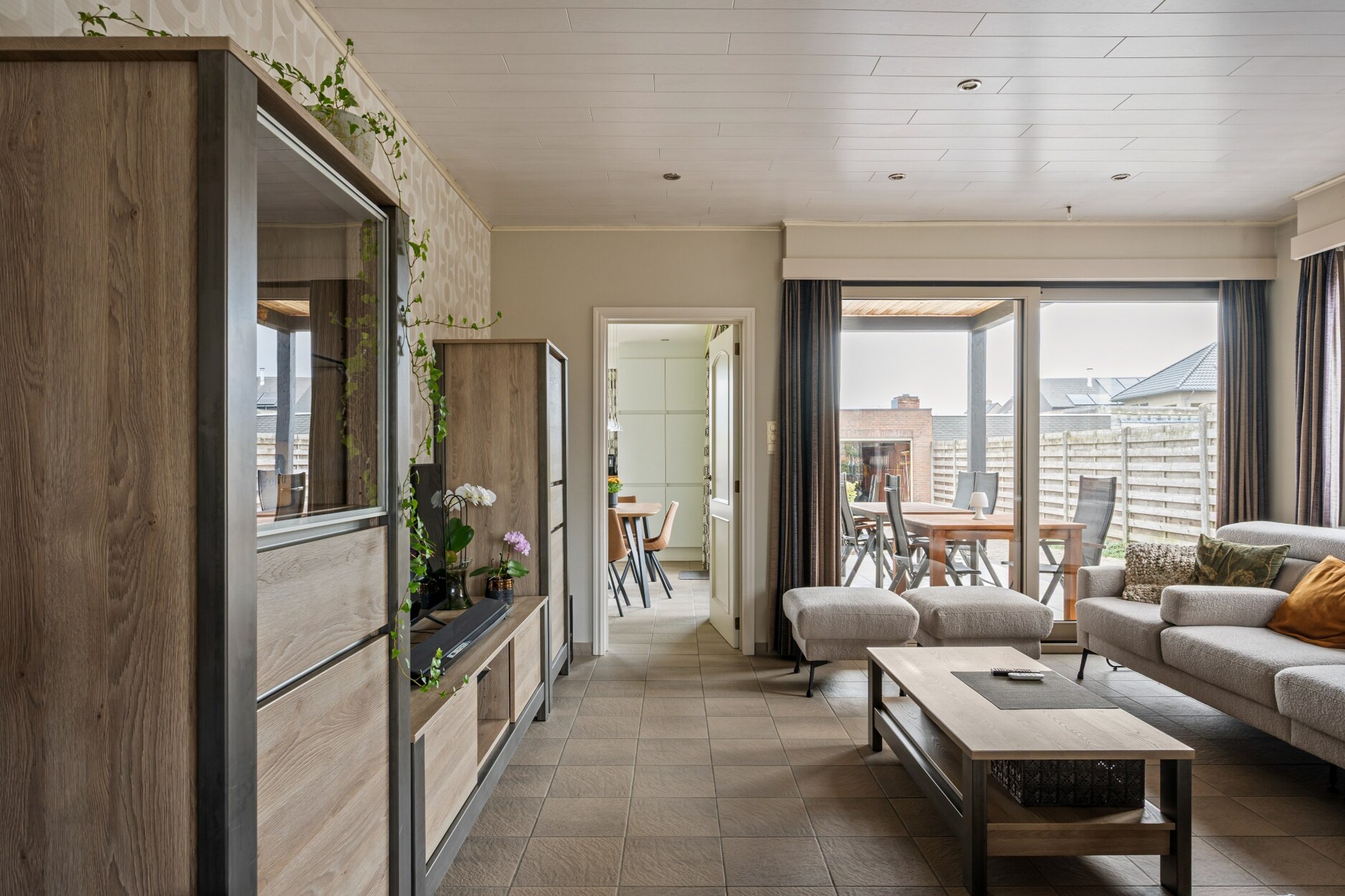 U betreedt de inkomhal van deze woning dewelke rechts toegang biedt tot de woonkamer. De vele raampartijen bieden veel lichtinval.