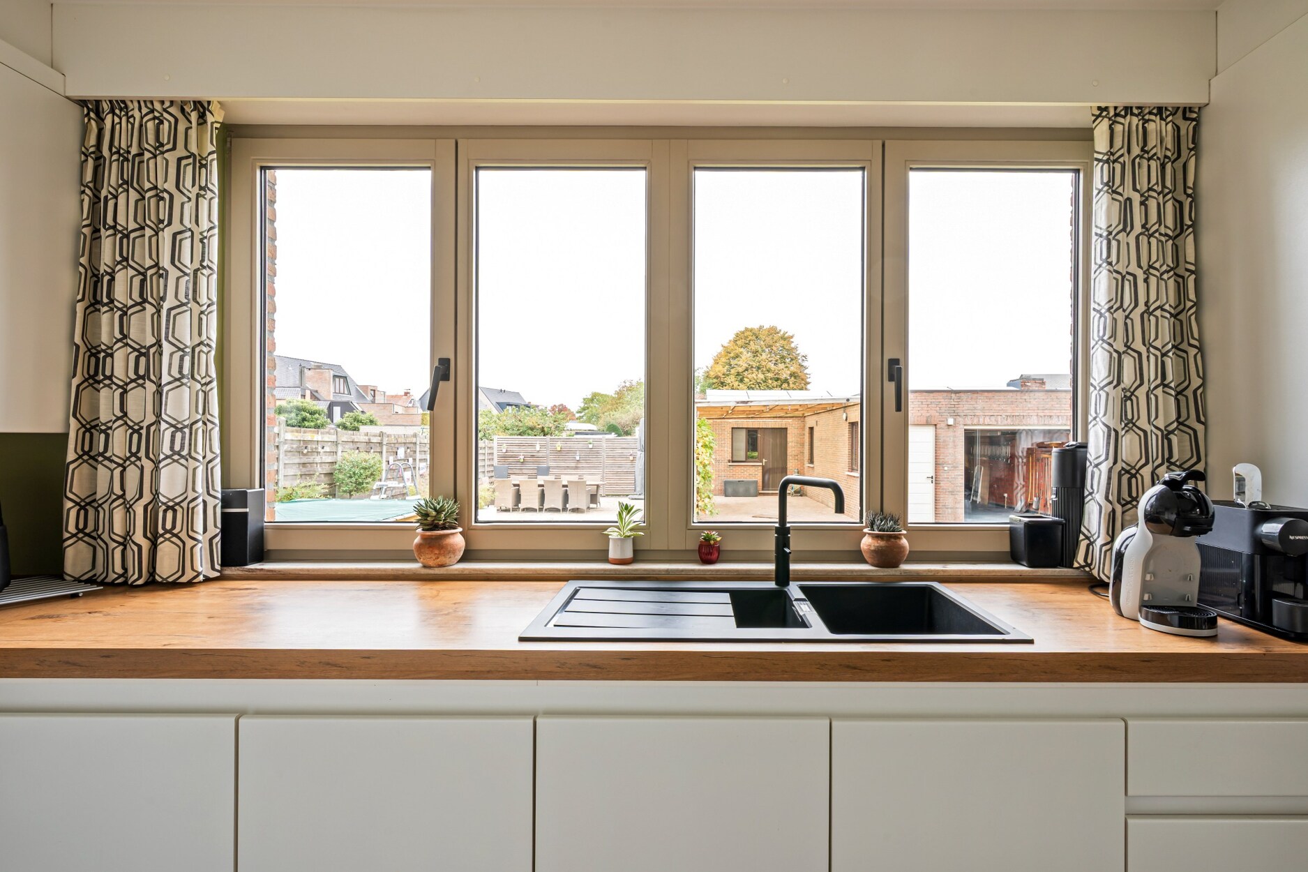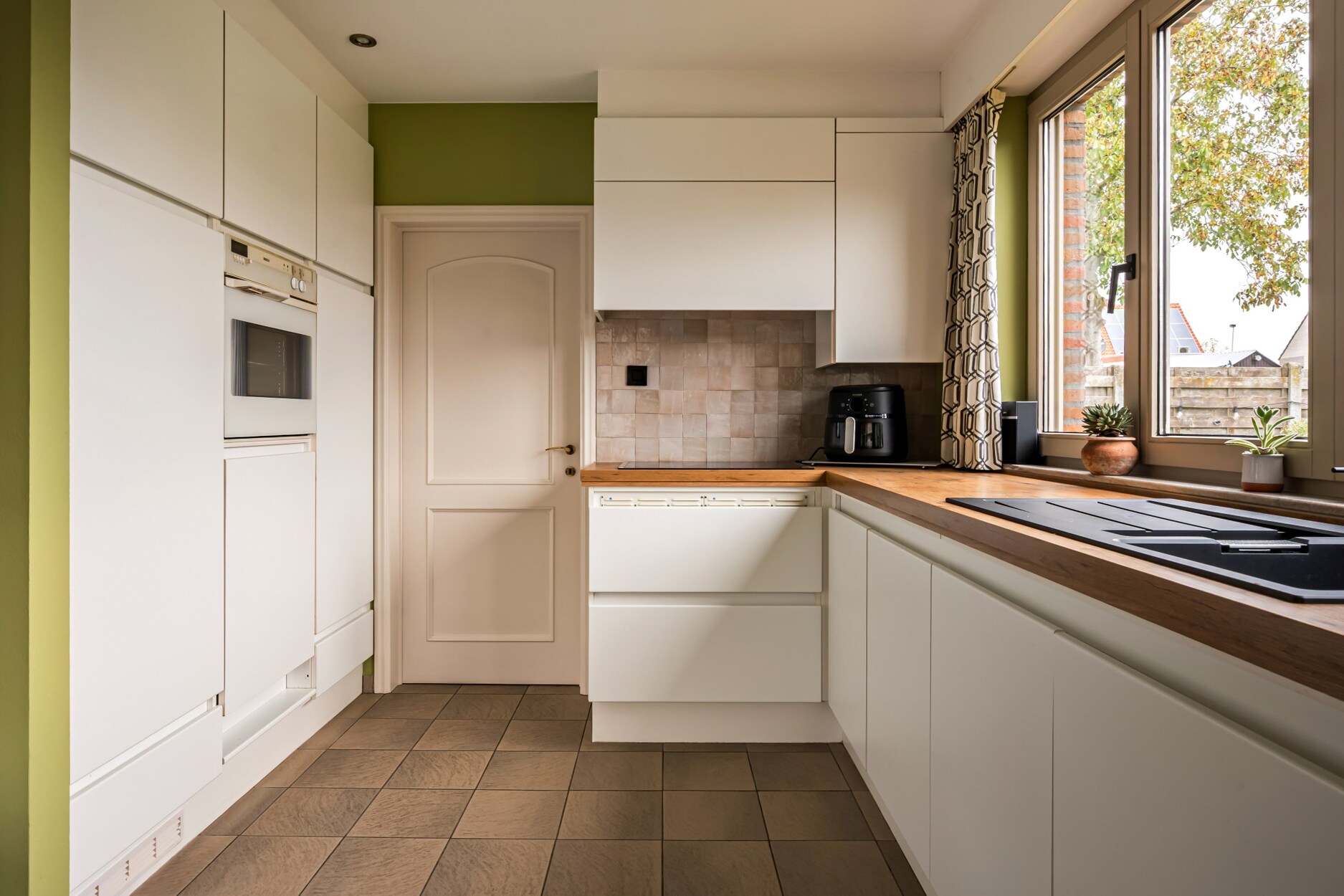 De keuken bevindt zich aanpalend en heeft ook nog een praktische wasruimte met ingemaakte kasten aanpalend. De keuken is ingericht met een recent vernieuwde vaatwas/ inductievuur en Quooker kraan. Koelkast en oven tevens ingebouwd.