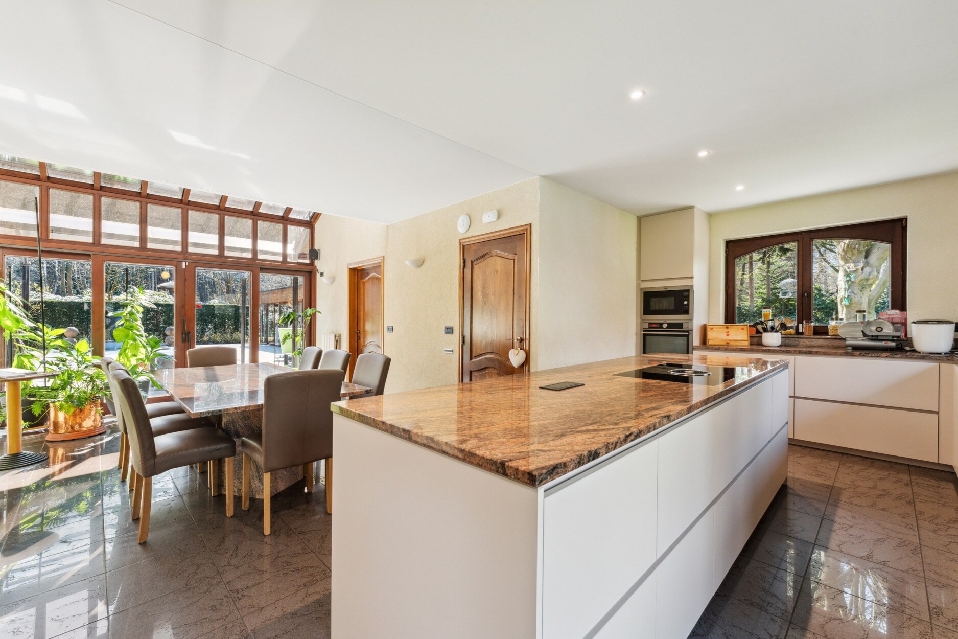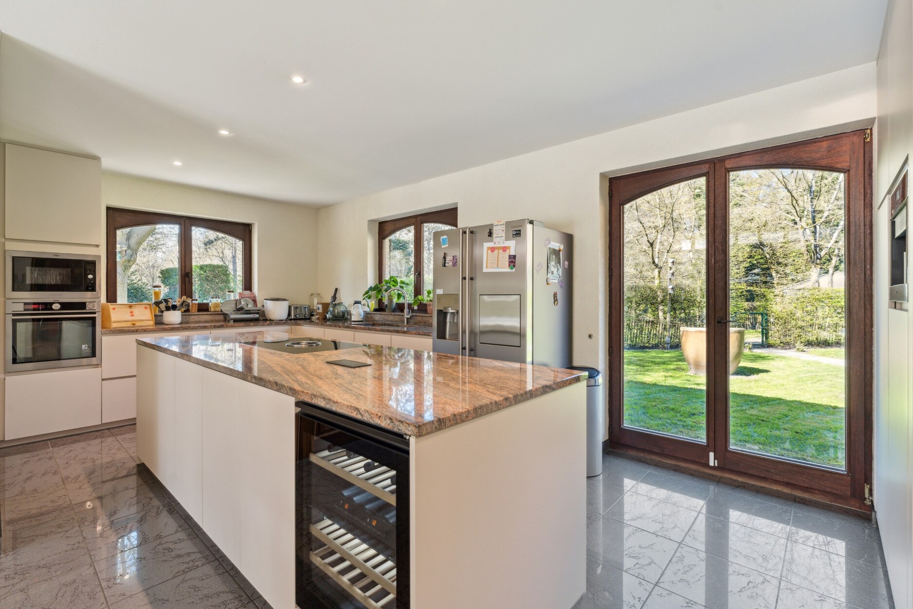 De leefkeuken is volledig uitgerust en beschikt over een kookeiland en ruime ontbijthoek die een prachtig uitzicht op de fraai aangelegde tuin en het uitnodigende zwembad biedt.