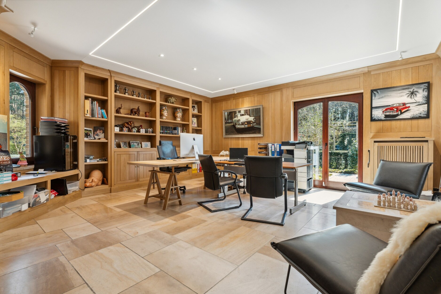 Aansluitend bevindt zich een ruime en stijlvolle bureau met ingebouwde kasten, ideaal als thuiskantoor.