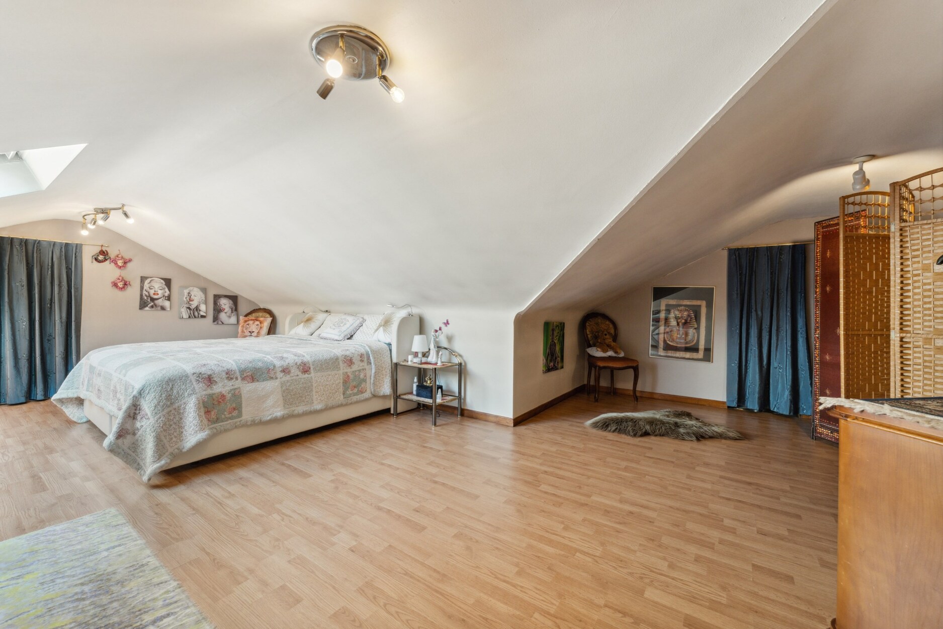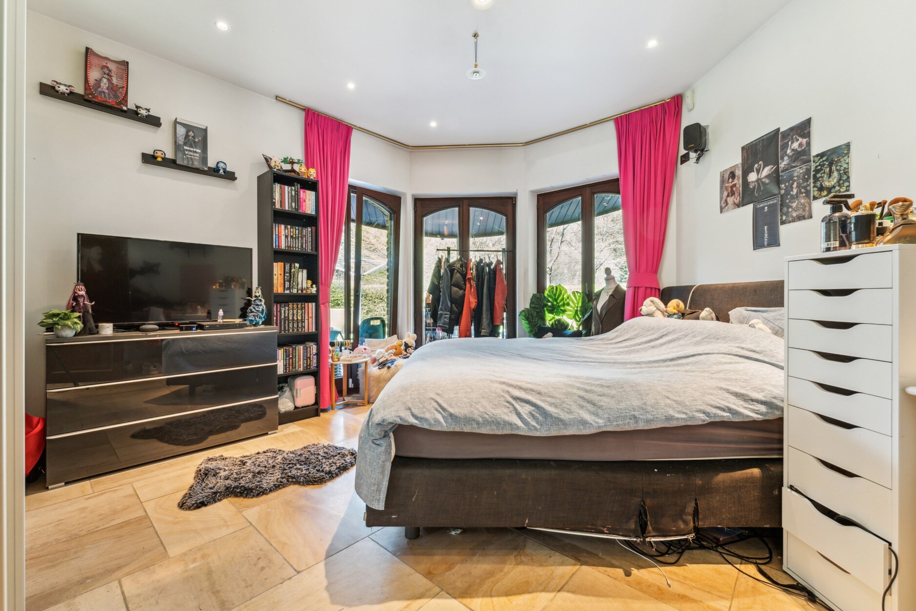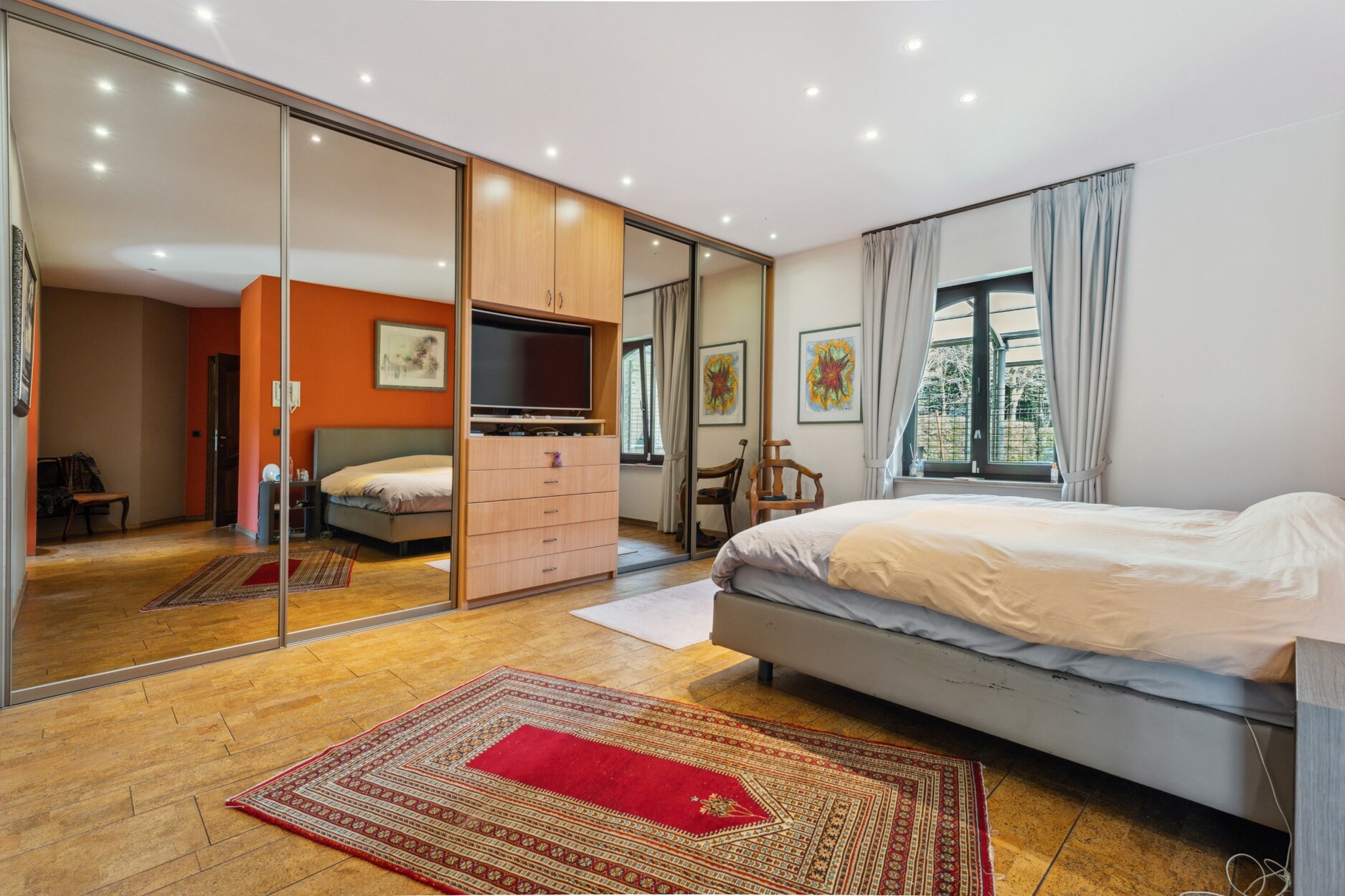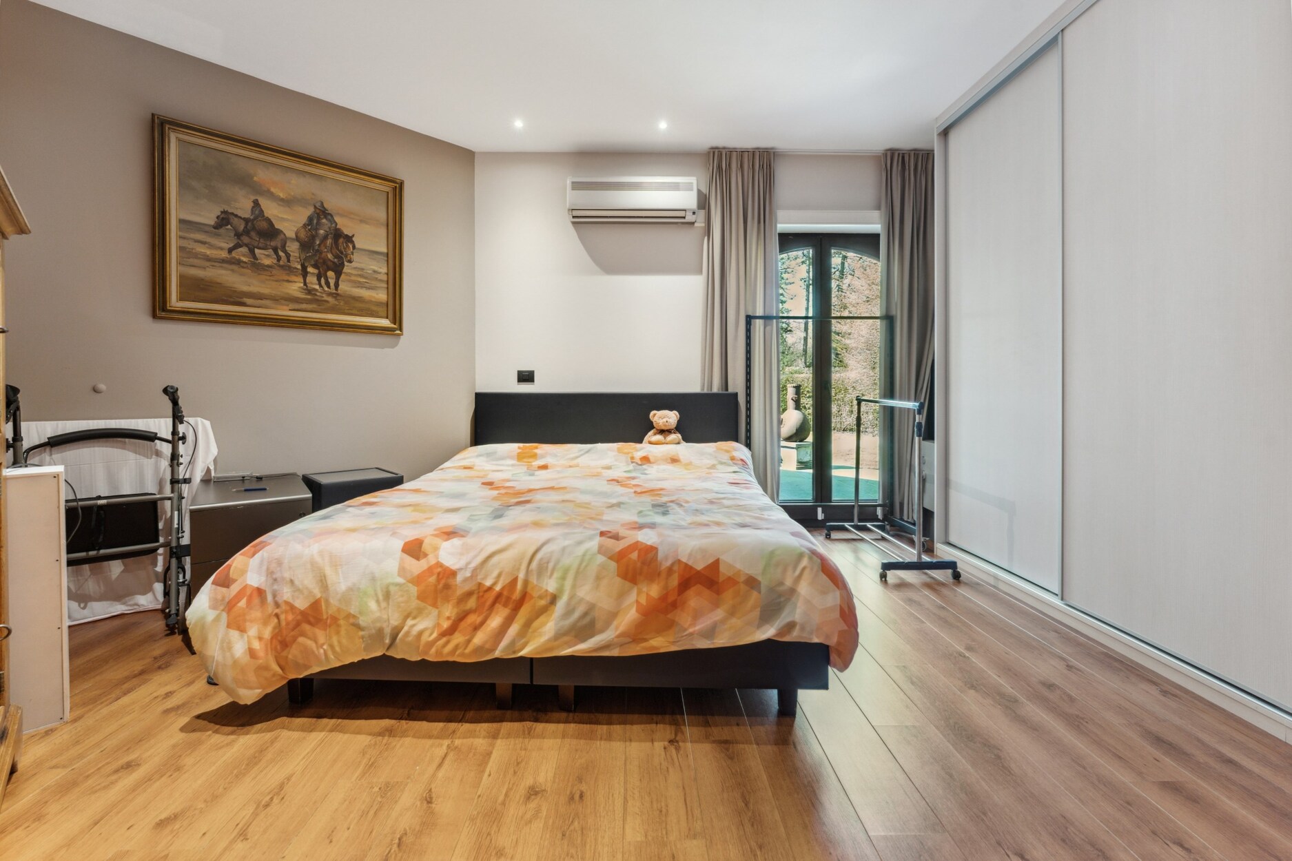 Buiten het gelijkvloers wonen herbergt de villa eveneens een afgewerkte eerste verdieping dewelke ingericht is als studio. Deze aparte studio beschikt over een eigen woonkamer, slaapkamer en badkamer – ideaal voor gasten, een au pair of als extra wooneenheid.