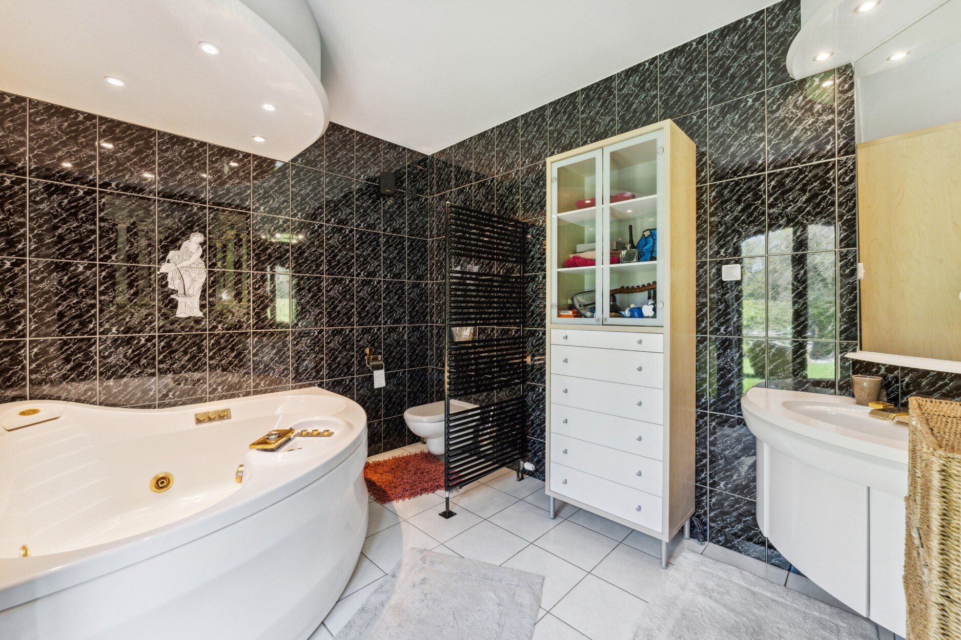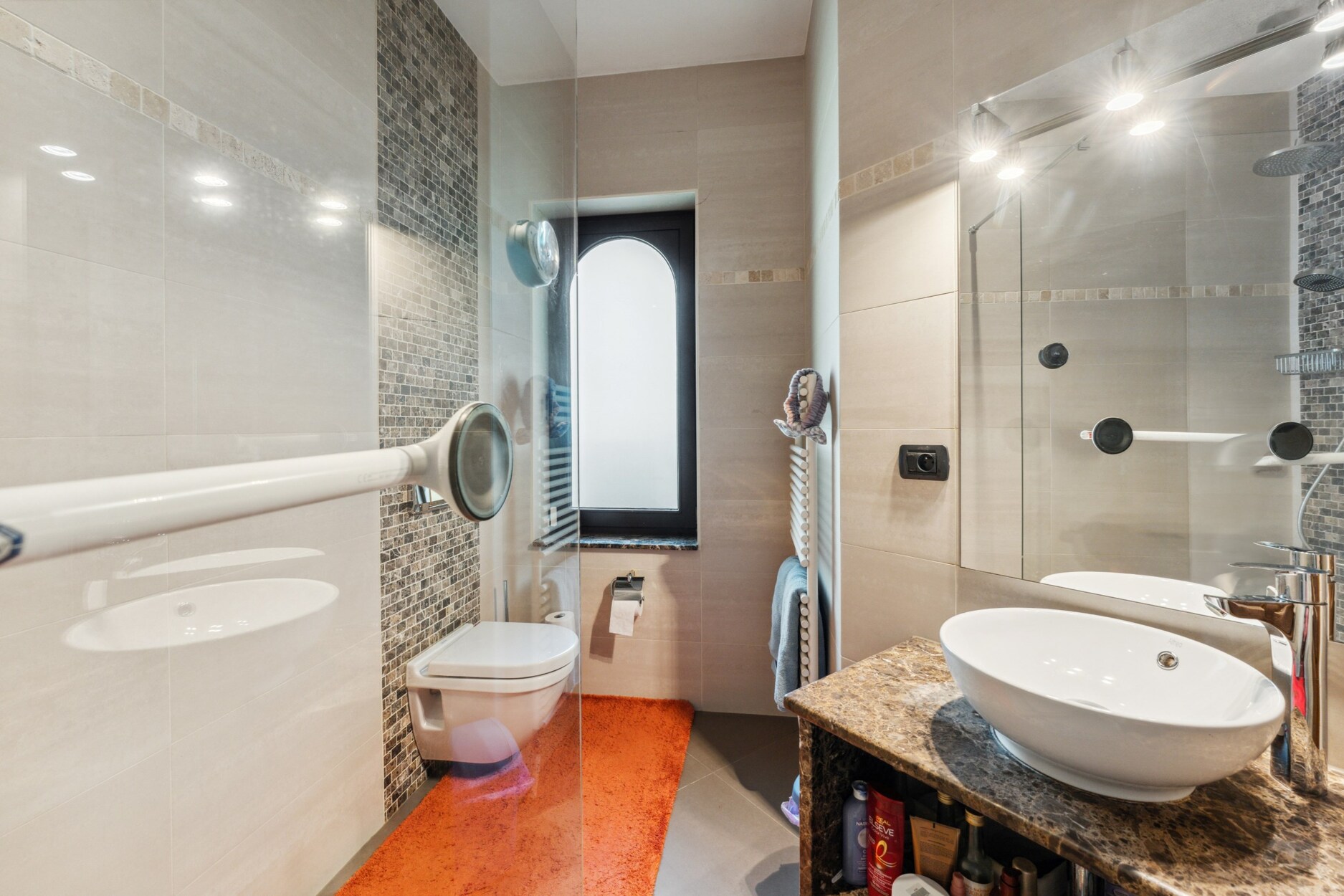 Aan de andere zijde van de woning bevinden zich drie volwaardige slaapkamers en twee badkamers. Twee slaapkamers delen een moderne badkamer met douche, lavabo en toilet. De master bedroom beschikt over een eigen dressing en een ensuite badkamer met bubbelbad, dubbele lavabo en toilet – een ware privé-oase.