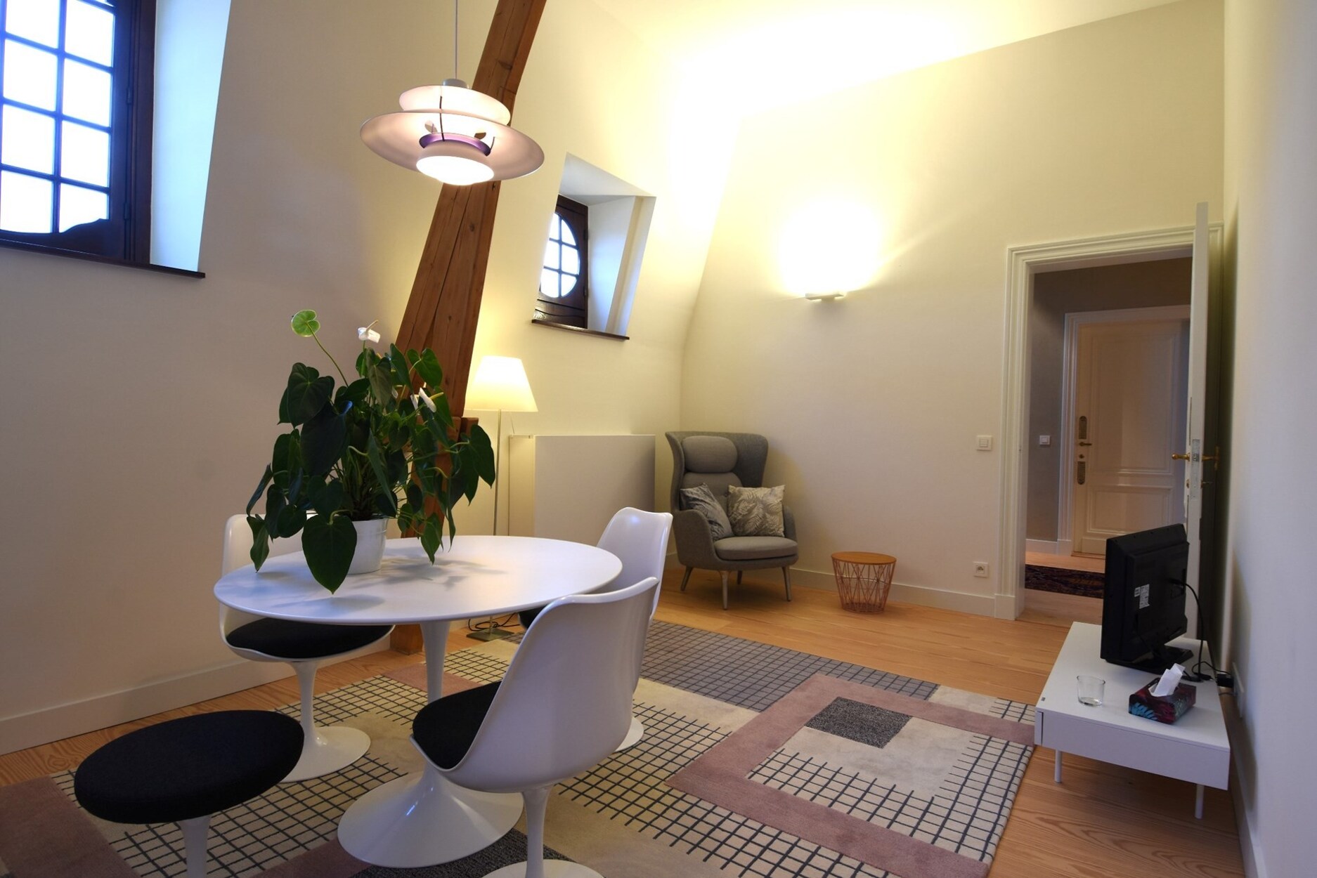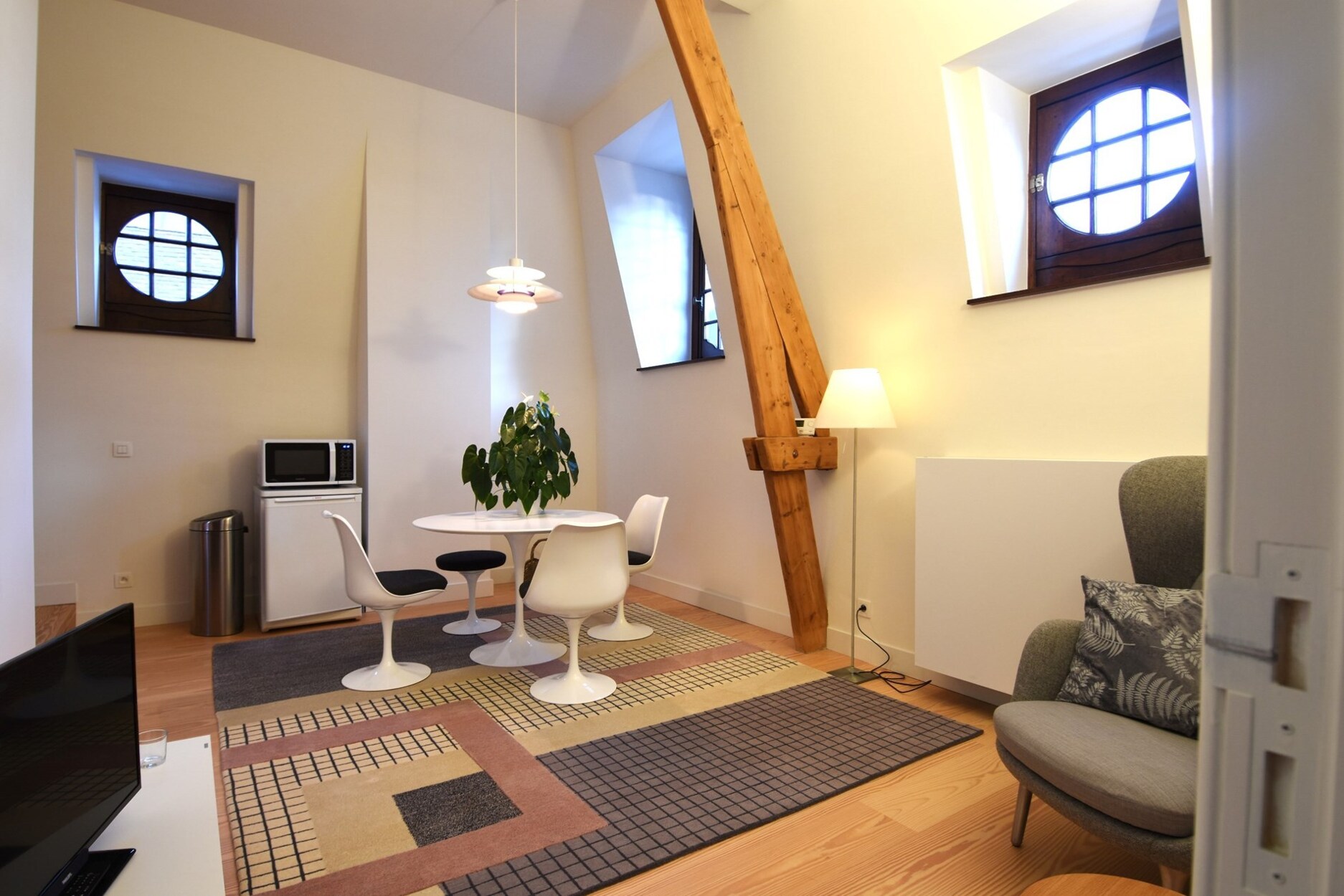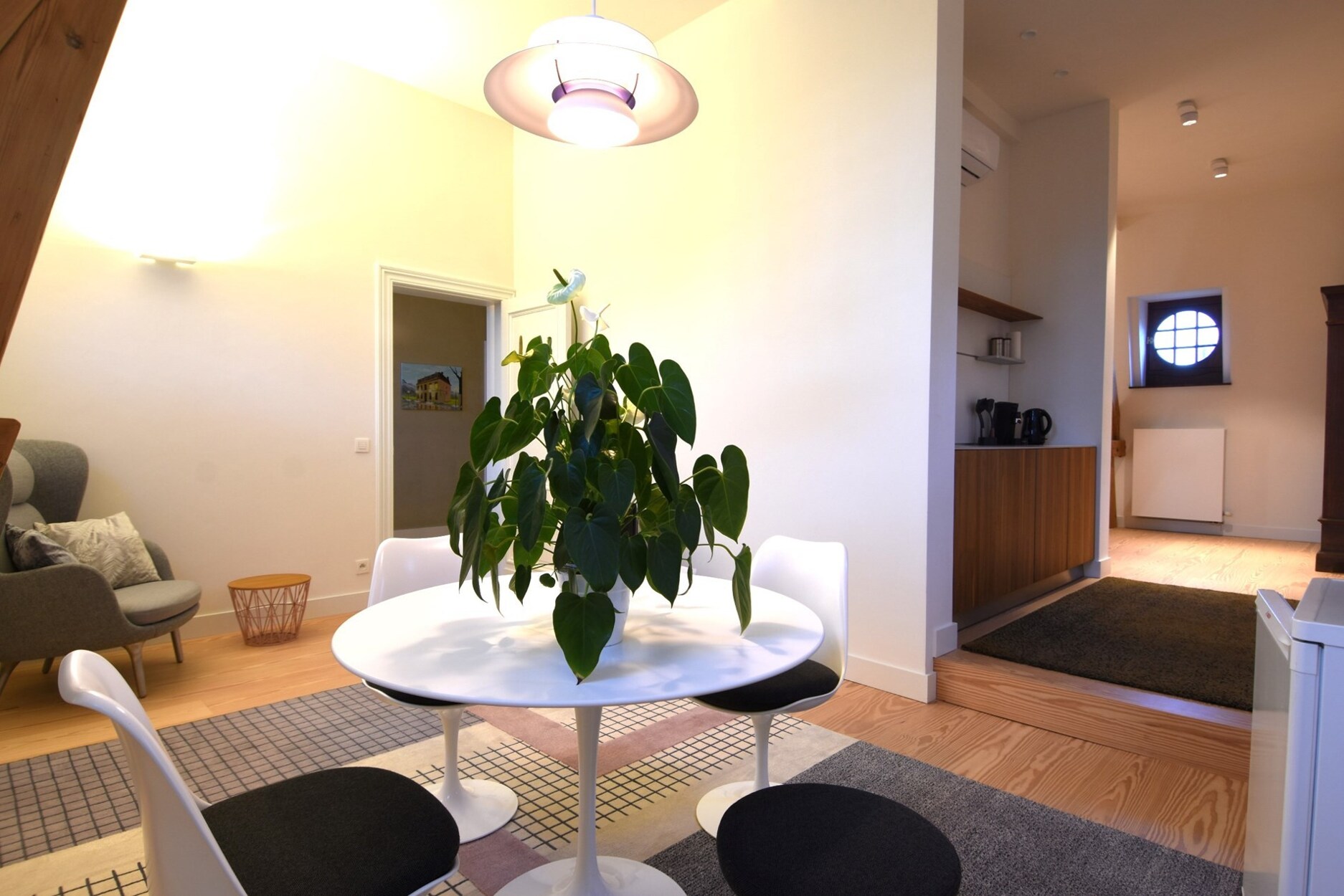 Temidden van de bruisende stad tegenover het Kasteeltje vinden we deze uiterst gezellige en gemeubelde studio van ca. 60m² op de bovenste verdieping van een uniek gerenoveerde woonst.