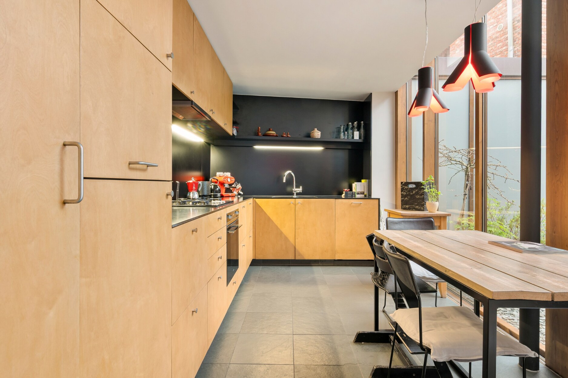 De volledig uitgeruste keuken biedt al het hedendaags comfort en kijkt uit op een onderhoudsvriendelijke patio: een stille stadsoase met een bijzonder mooi zicht op de Heilig Hartkerk. Hier vind je bovendien een praktische buitenberging.