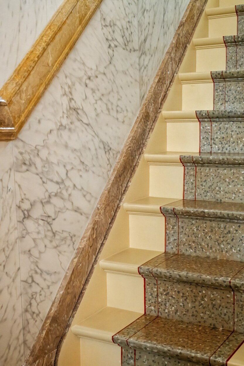 * Trappenhal en inkomhal zijn gecreëerd door experten van de Brusselse School op basis van speciale marmertechnieken alsook hout-marmer- en steenimitatietechnieken. Recent minitieus gerestaureerd door meester-restaurateurs