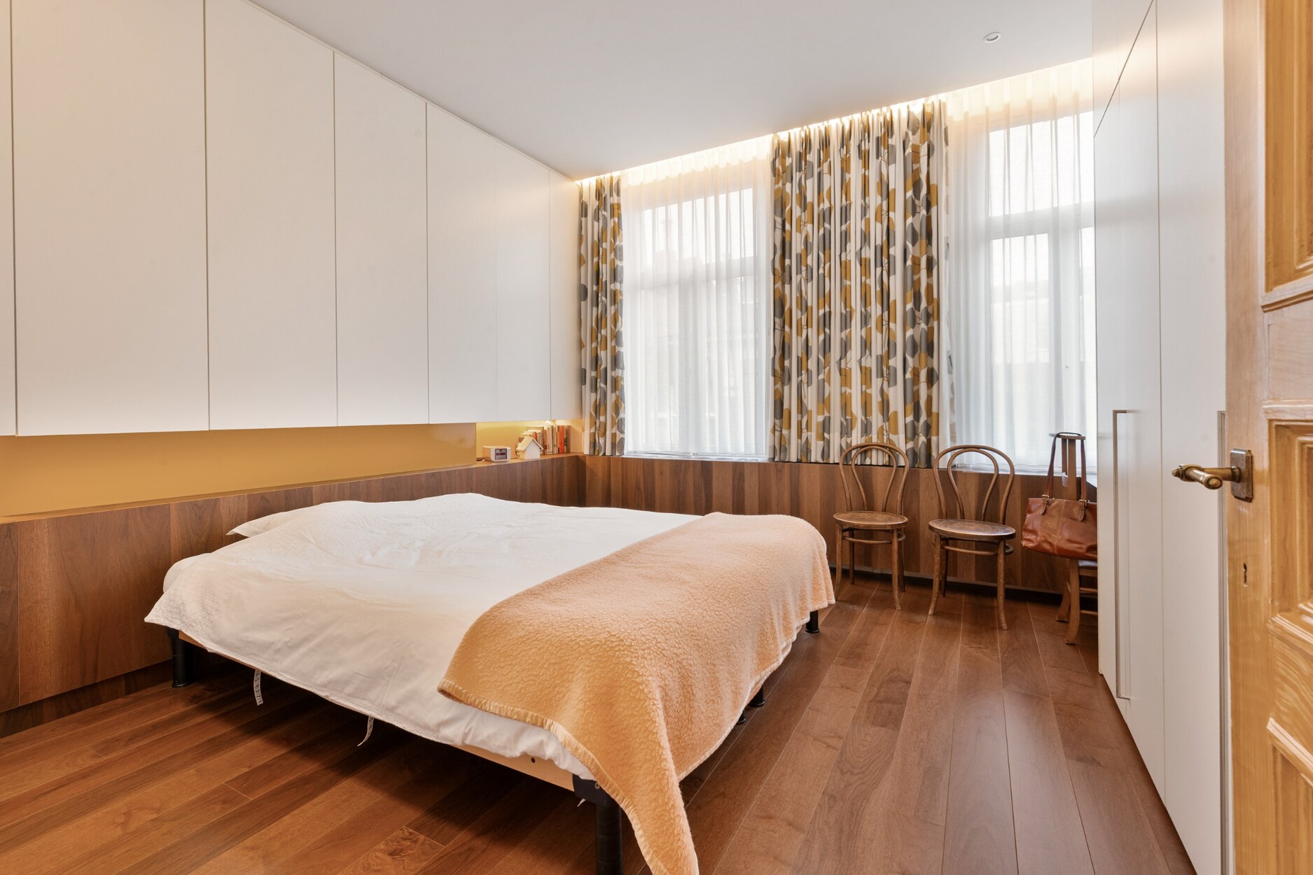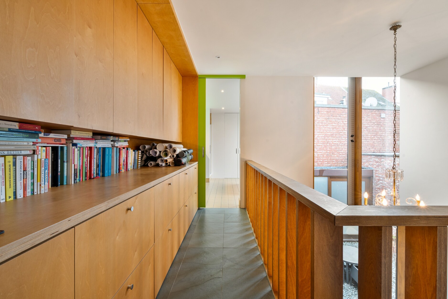 Op de eerste verdieping kom je via een handige overloop met ingemaakte kasten in de badkamer, waar achter schuifdeuren ook plaats voorzien is voor een wasmachine en droogkast. Verder bevinden zich op deze verdieping de masterbedroom en een extra bureau- of slaapkamer, beide uitgerust met ingemaakte kasten. Een bijkomende werkruimte met grote glaspartijen biedt een prachtig doorkijkje naar het hart van de woning.
