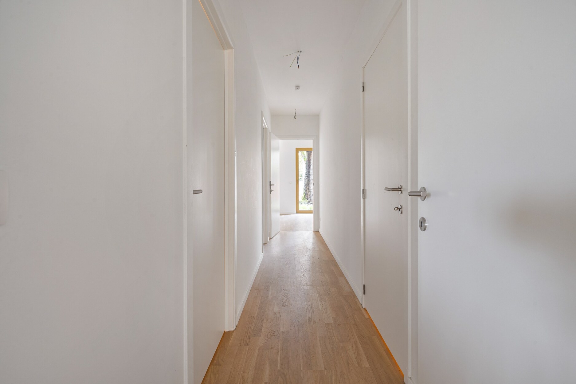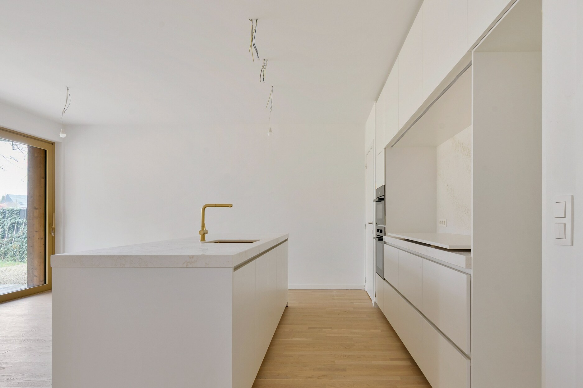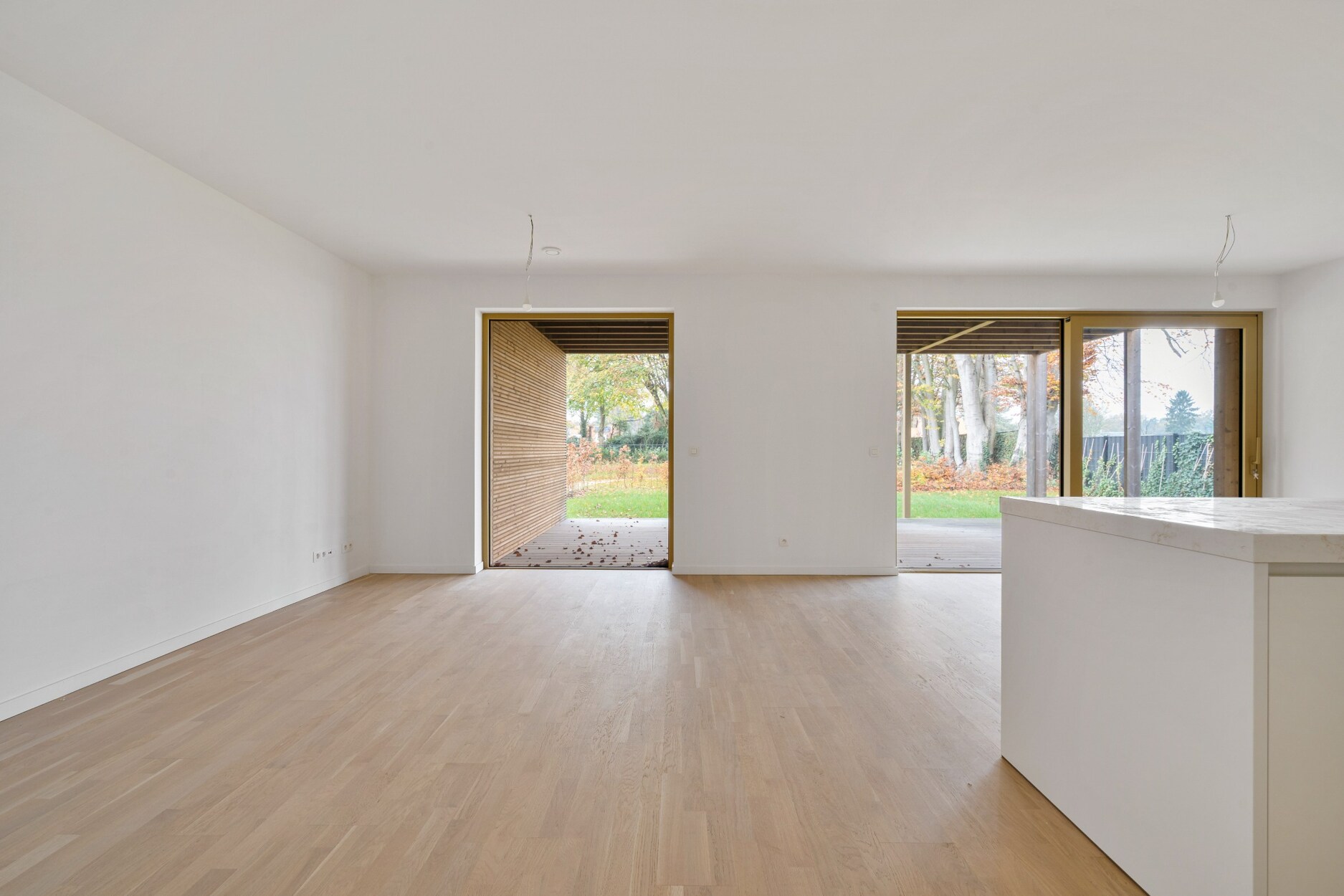 U betreedt het appartement via de inkomhal met apart gastentoilet en vestiaireruimte. De inkomhalwand- en kast worden nog geplaatst. De lichtrijke leefruimte met grote schuiframen biedt een aangename connectie met de tuin. Aansluitend bevindt zich de volledig uitgeruste open keuken. Aanpalend is er een praktische berging en verder ook nog een ruime aparte wasplaats.