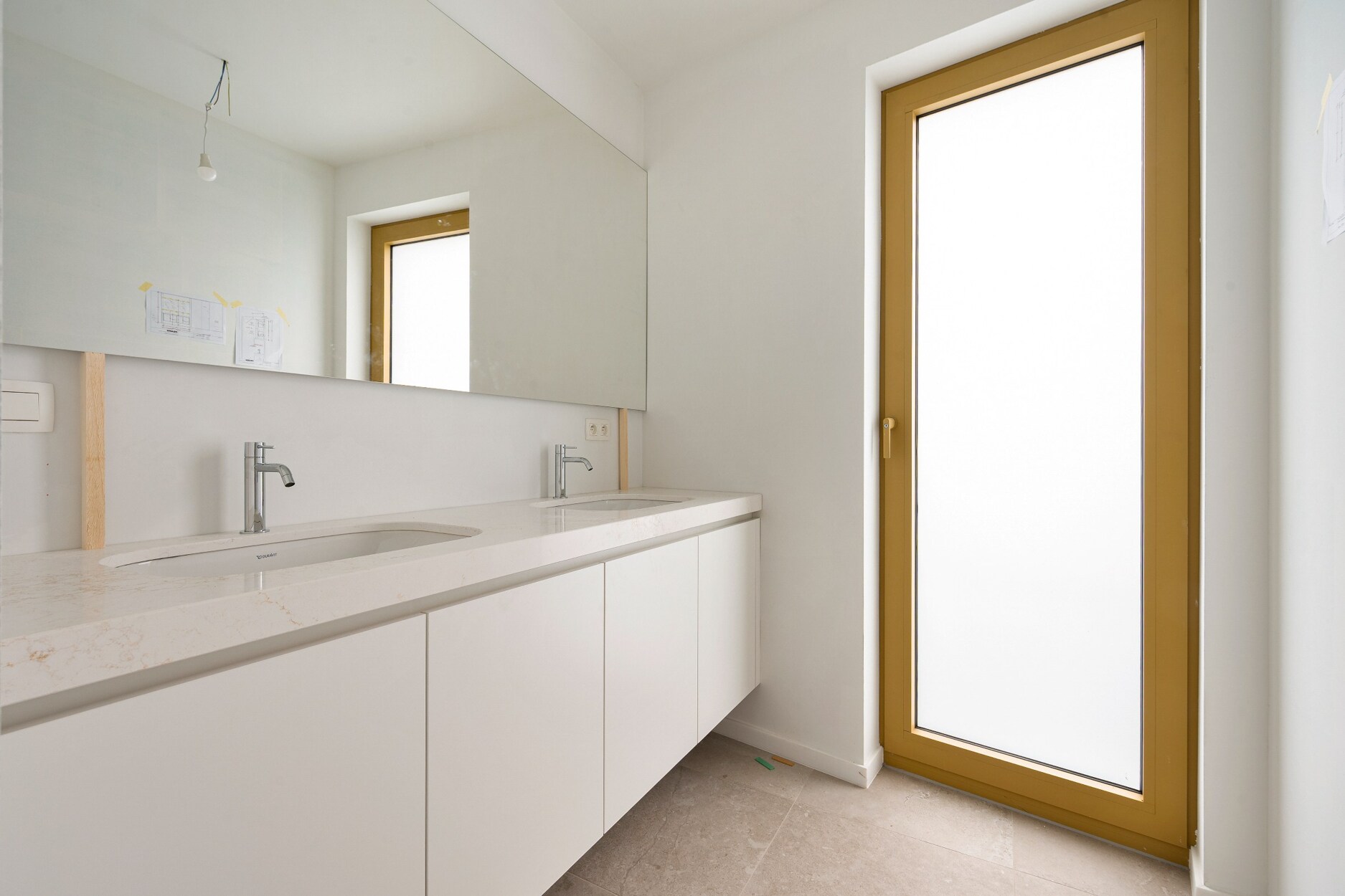 Aan de voorzijde liggen twee volwaardige slaapkamers, beide met toegang tot de privatieve voortuin. De badkamer werd volledig afgewerkt en voorzien van een inloopdouche, dubbele wastafel en toilet.