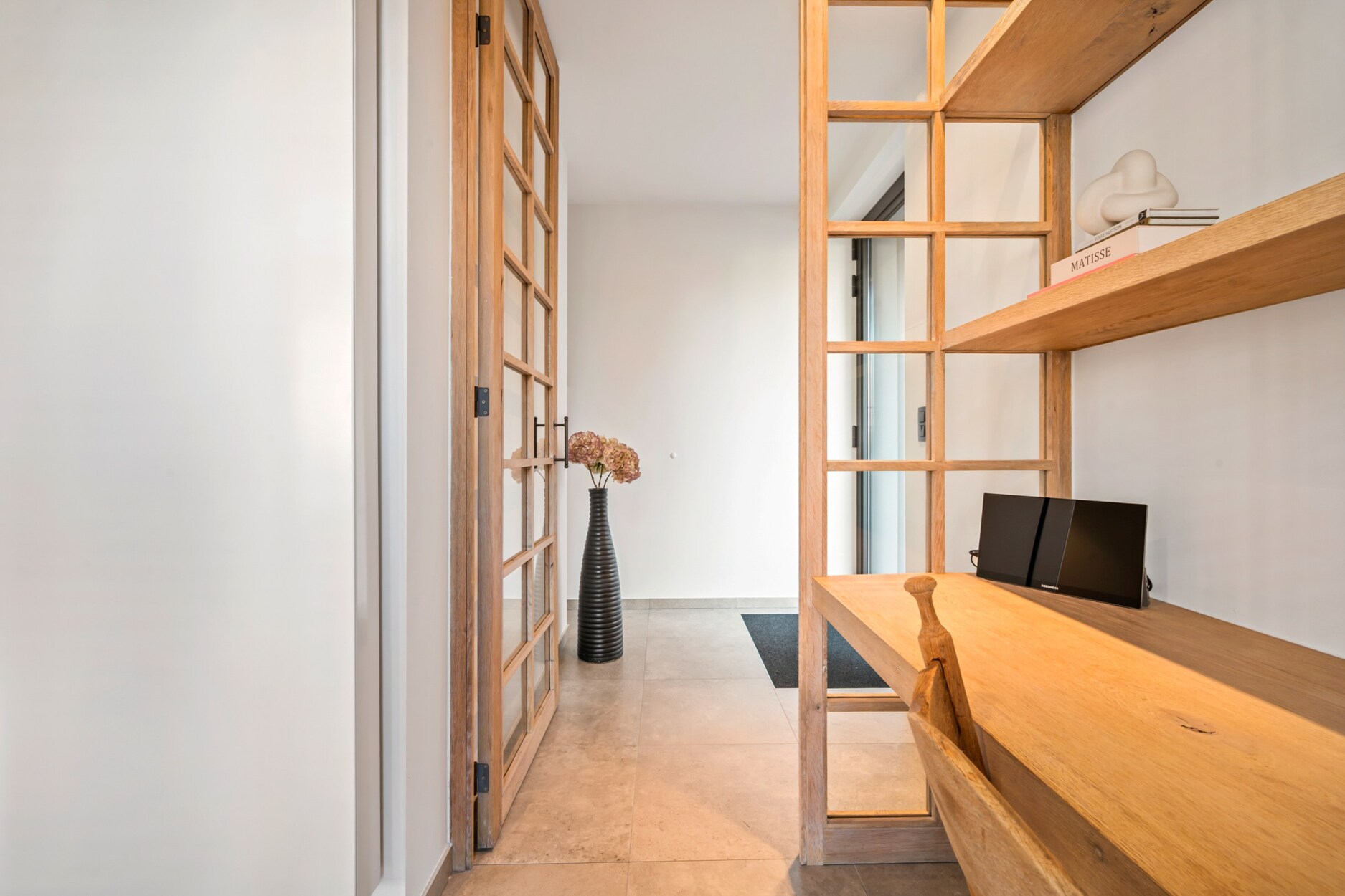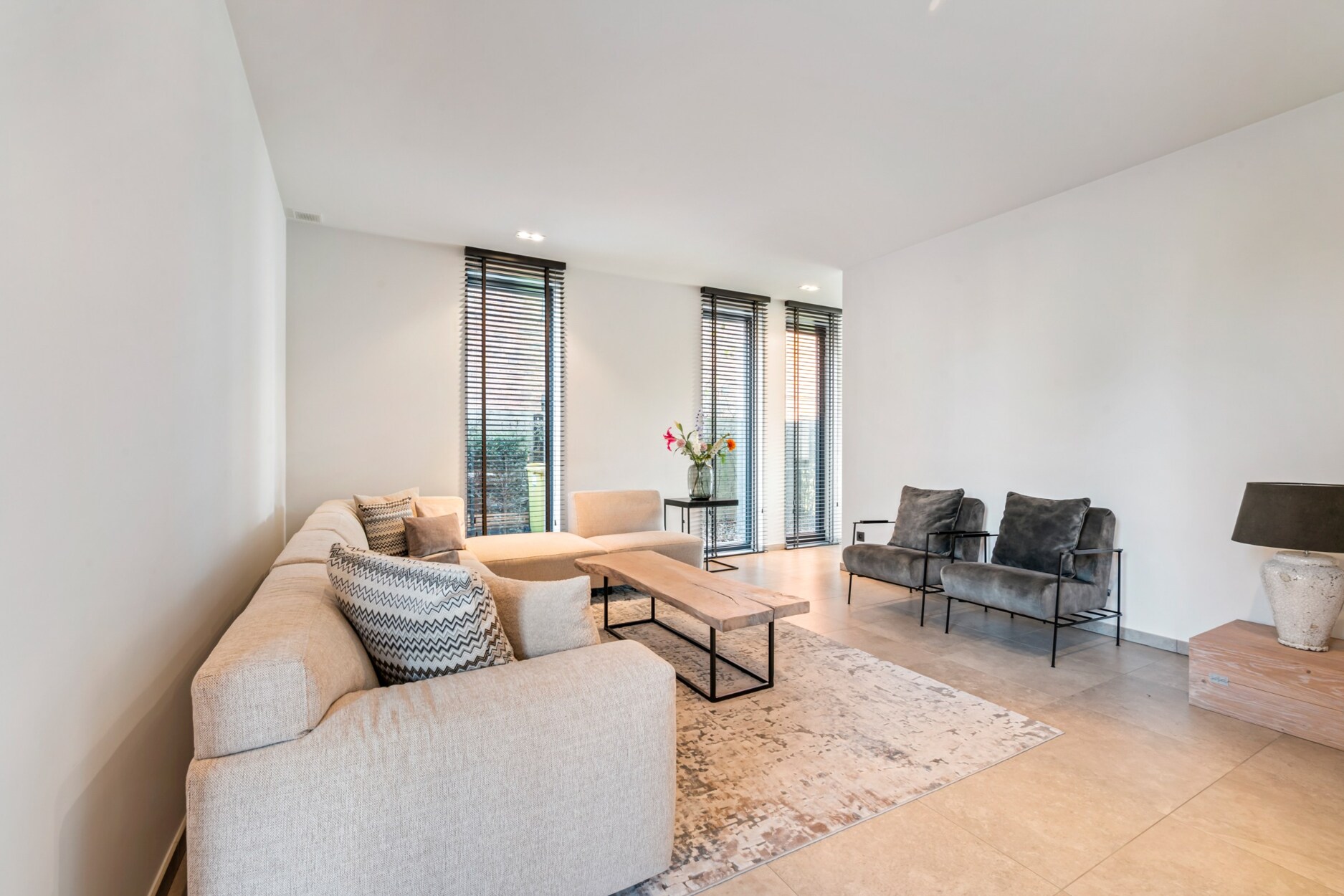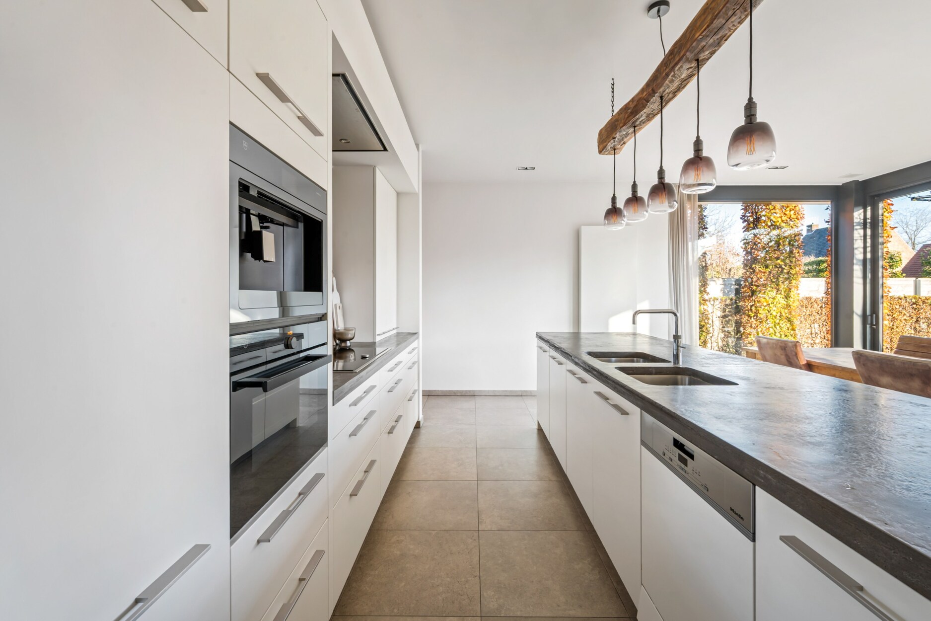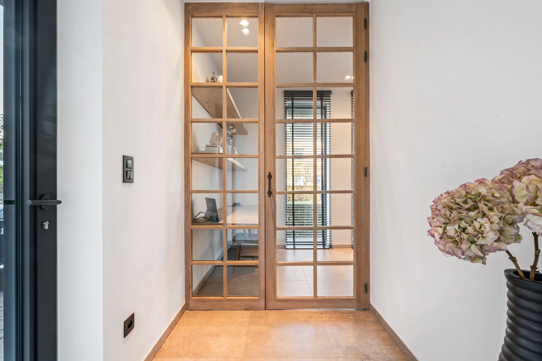 De woning is toegankelijk via de inkomhal met vestiaireruimte. Deze geeft toegang via een dubbele houten deur tot de gezellige woonkamer met op maat gemaakte bureau. De keuken beschikt over een vaatwasmachine, ijskast, ingebouwde koffiemachine, stoomoven en inductievuur. Door de grote glaspartijen geniet u hier van een aangename lichtinval en zicht op de tuin. In de wasplaats geniet u van vele ingemaakte kasten en de mogelijkheid uw machines op hoogte te zetten. Voorts treft u op de gelijkvloerse verdieping een apart toilet en badkamer met inloopdouche en lavabomeubel.
