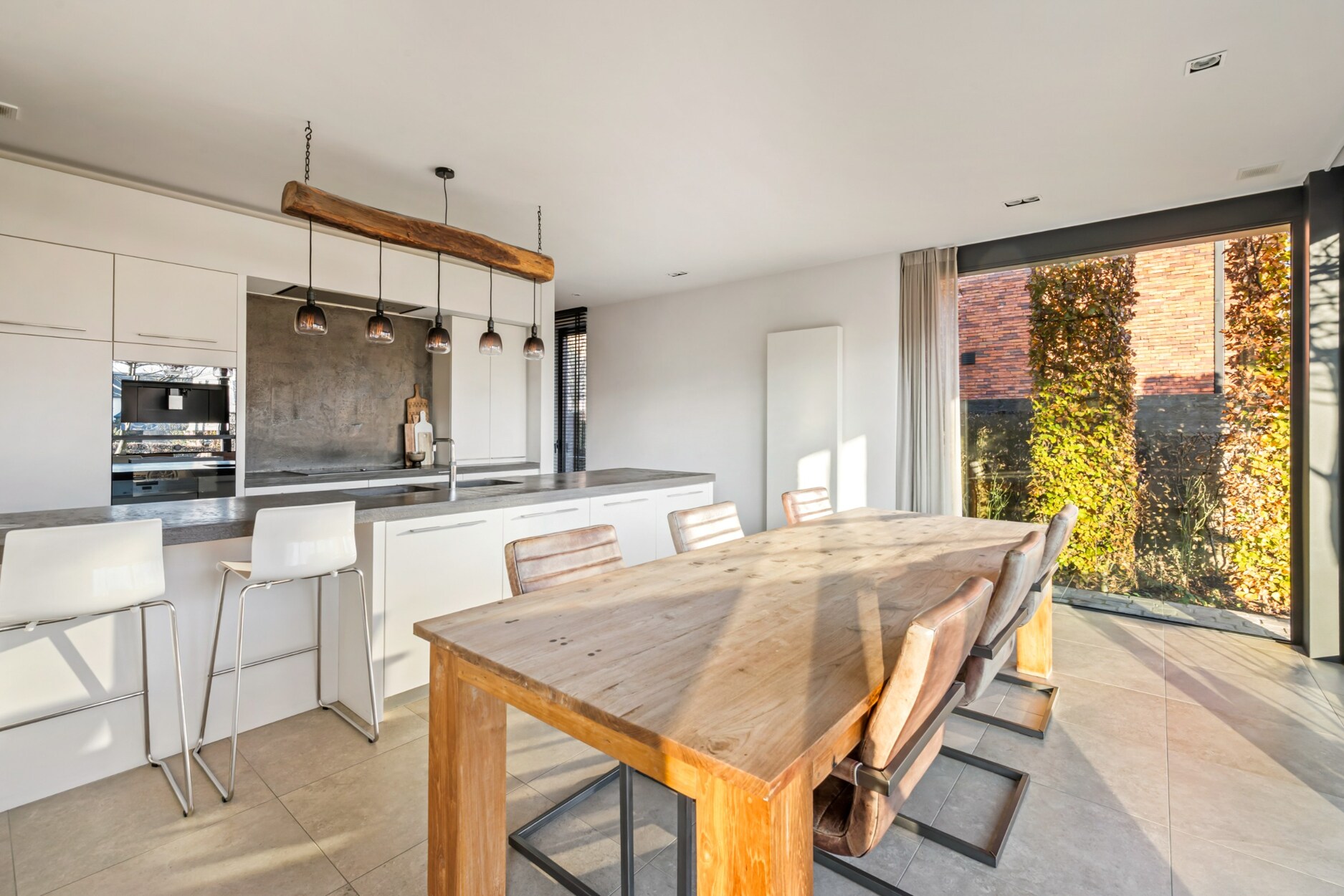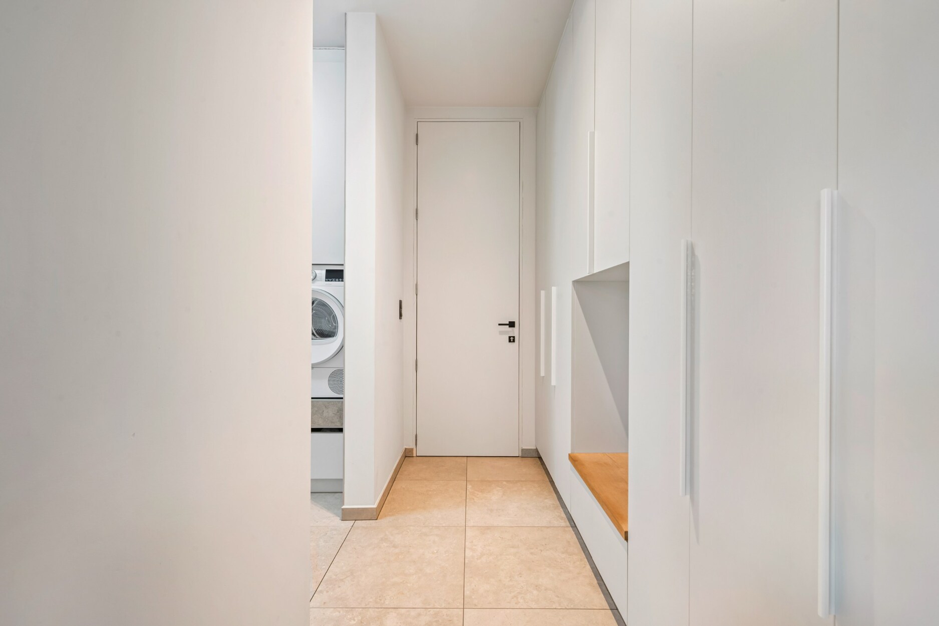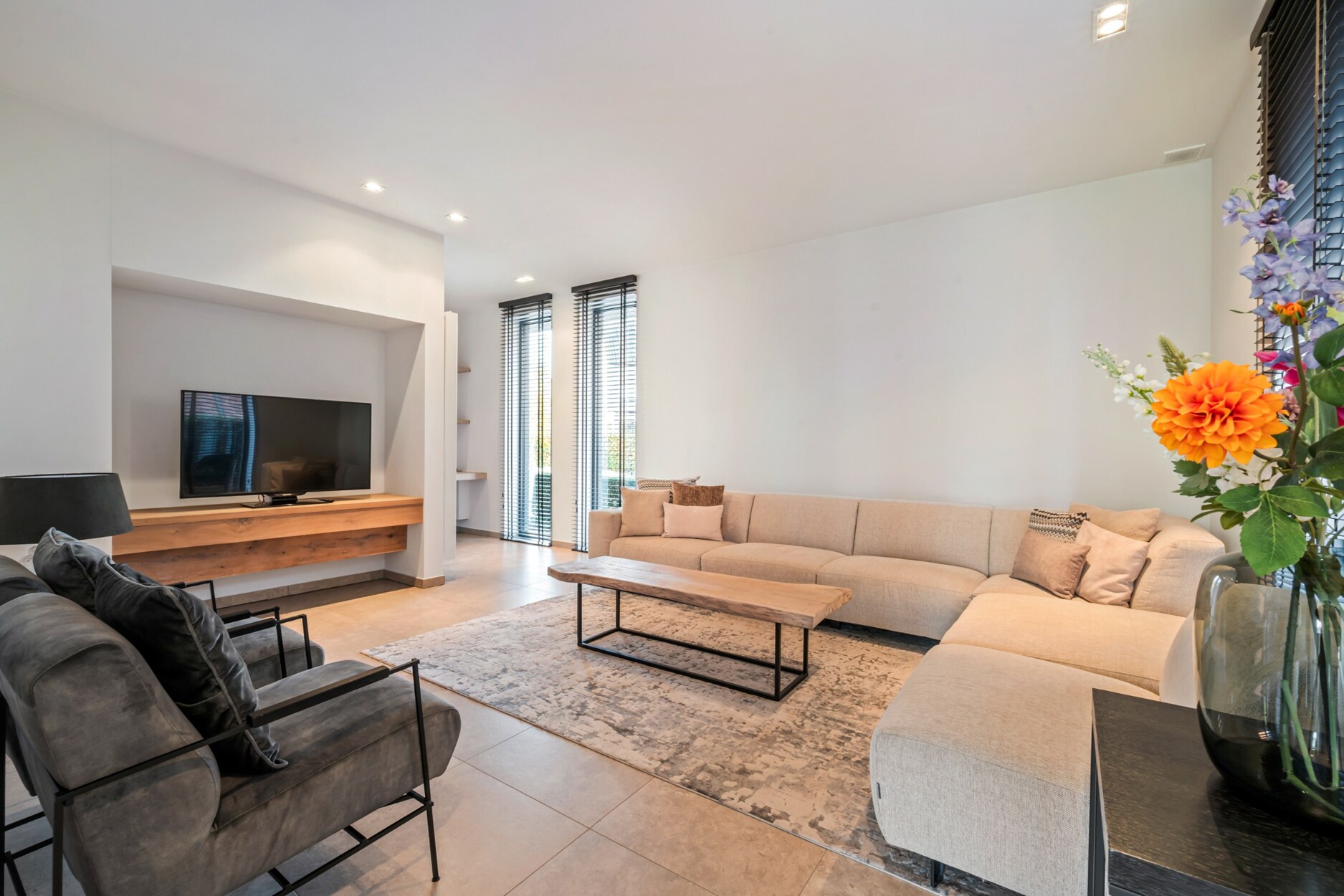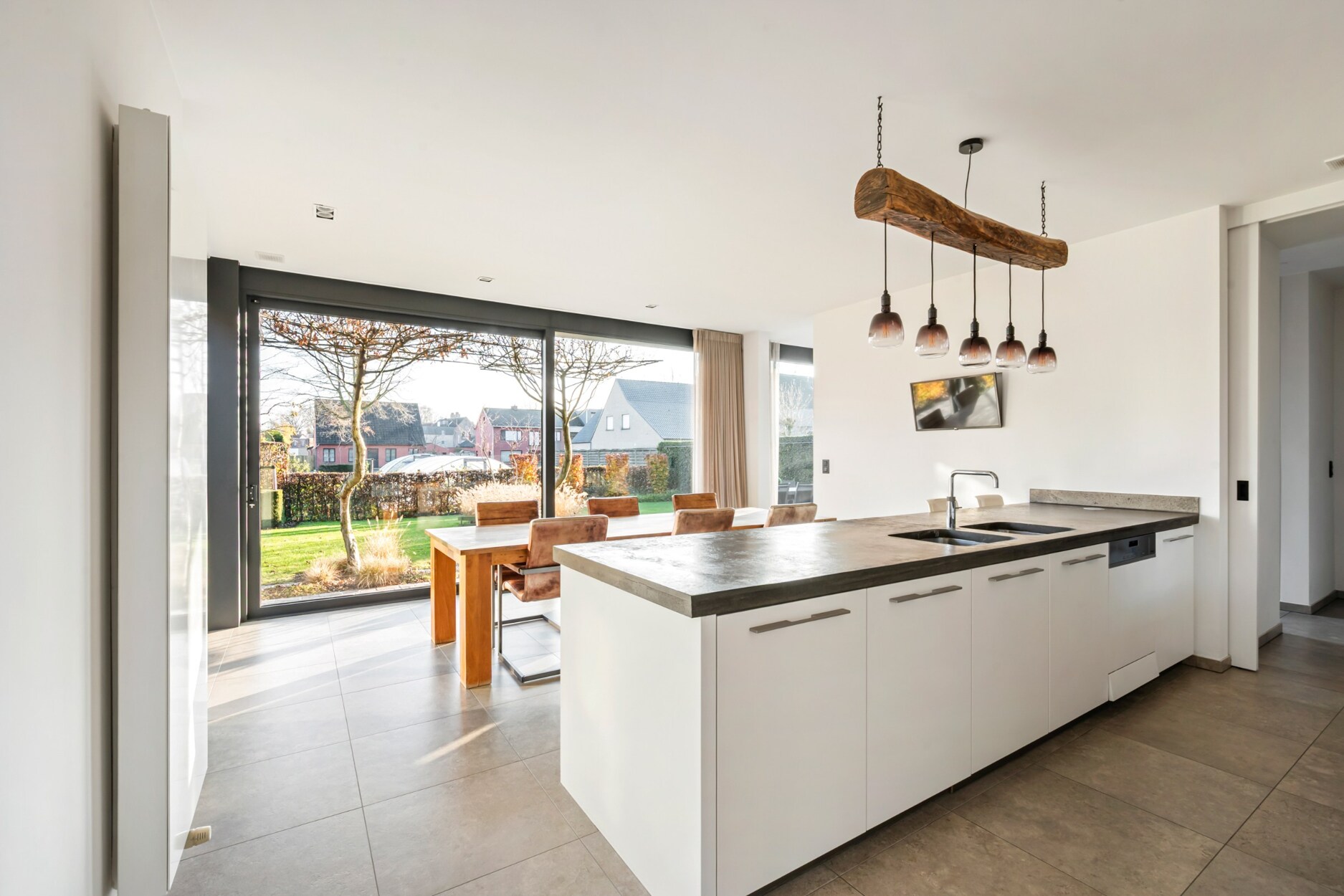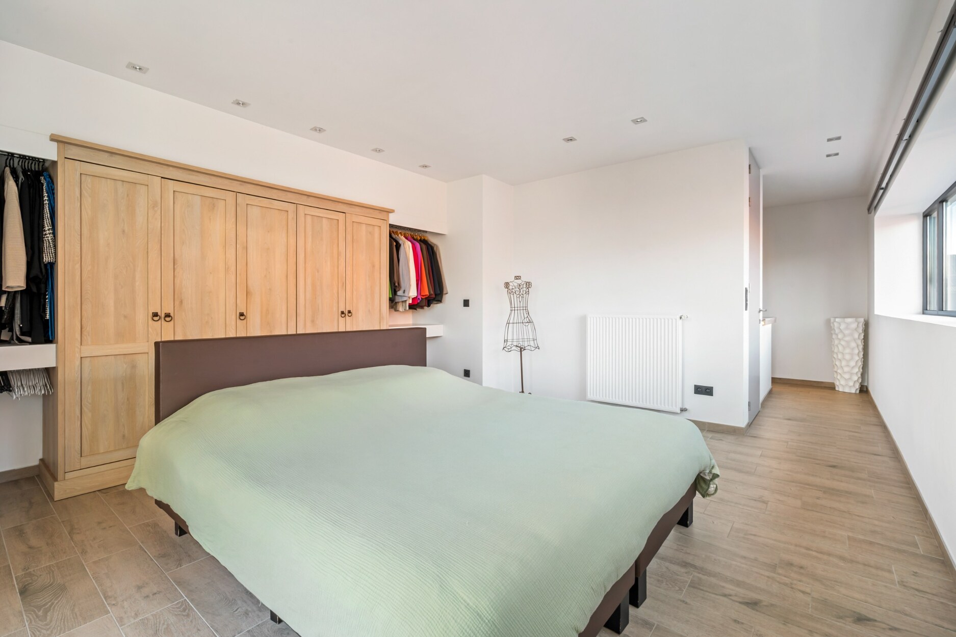 De woning is toegankelijk via de inkomhal met vestiaireruimte. Deze geeft toegang via een dubbele houten deur tot de gezellige woonkamer met op maat gemaakte bureau. De keuken beschikt over een vaatwasmachine, ijskast, ingebouwde koffiemachine, stoomoven en inductievuur. Door de grote glaspartijen geniet u hier van een aangename lichtinval en zicht op de tuin. In de wasplaats geniet u van vele ingemaakte kasten en de mogelijkheid uw machines op hoogte te zetten. Voorts treft u op de gelijkvloerse verdieping een apart toilet en badkamer met inloopdouche en lavabomeubel.