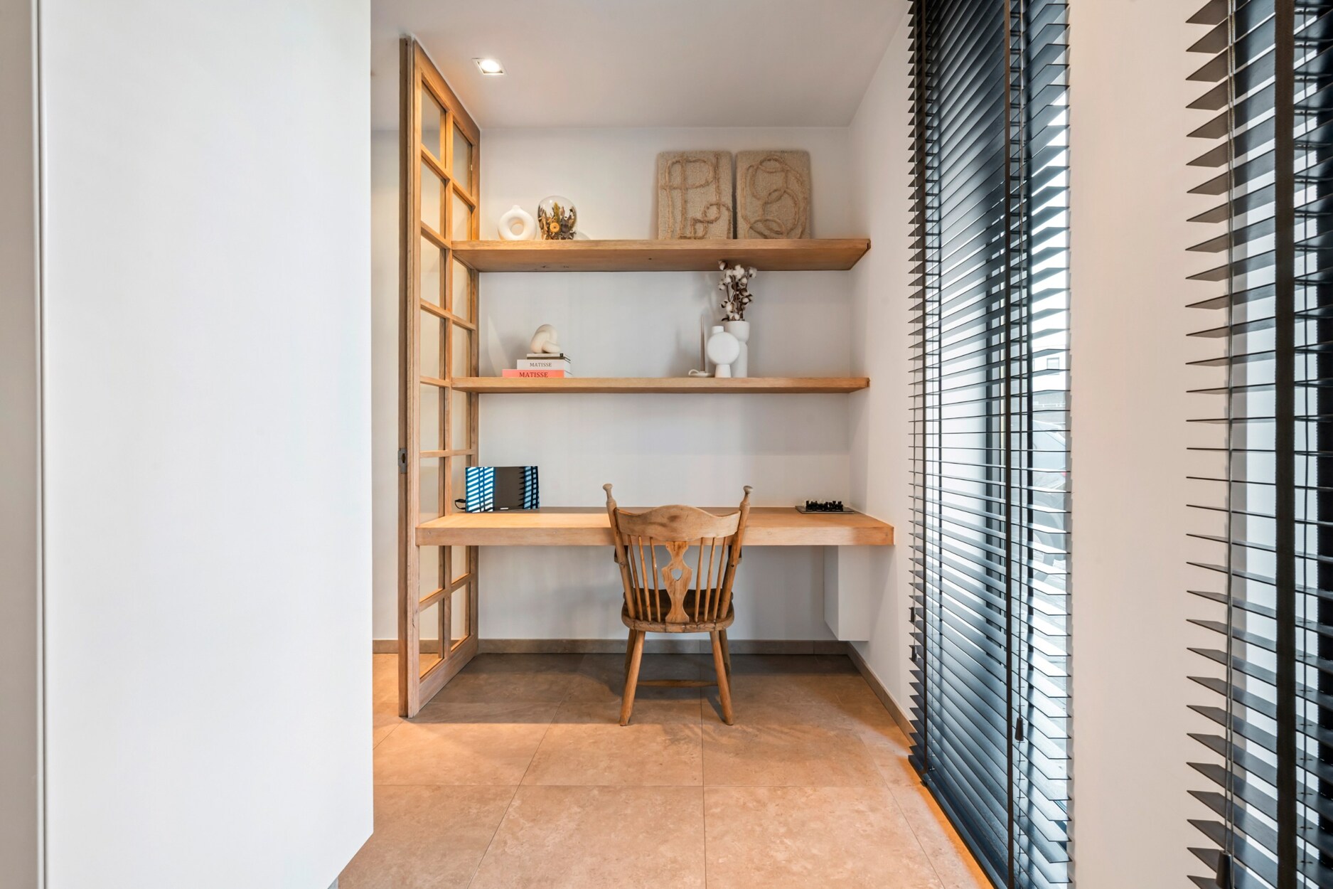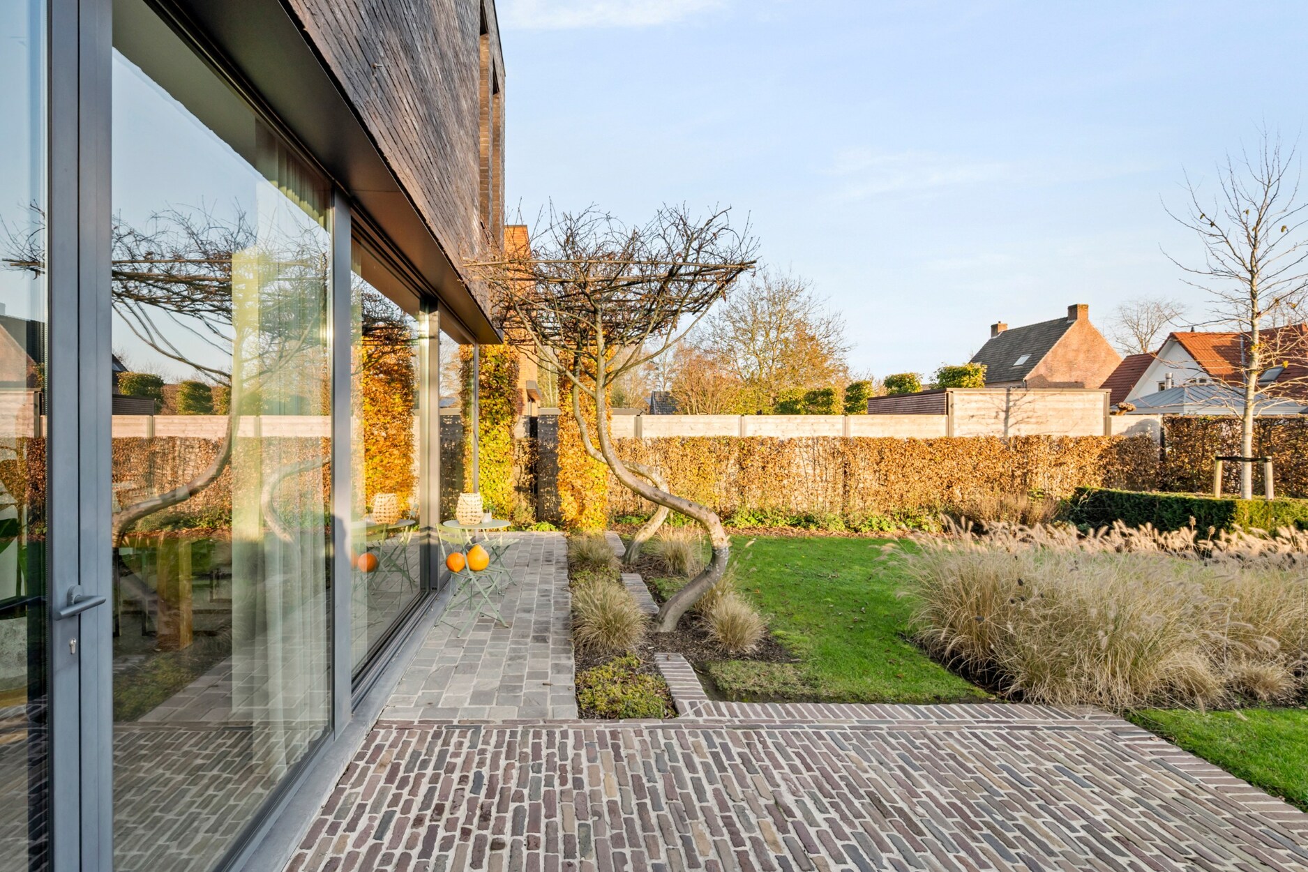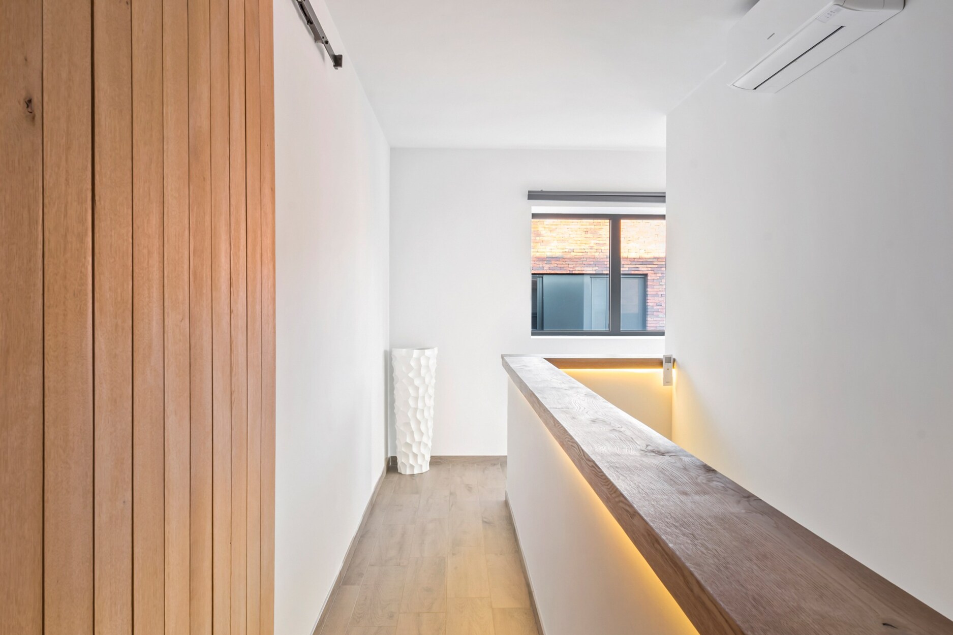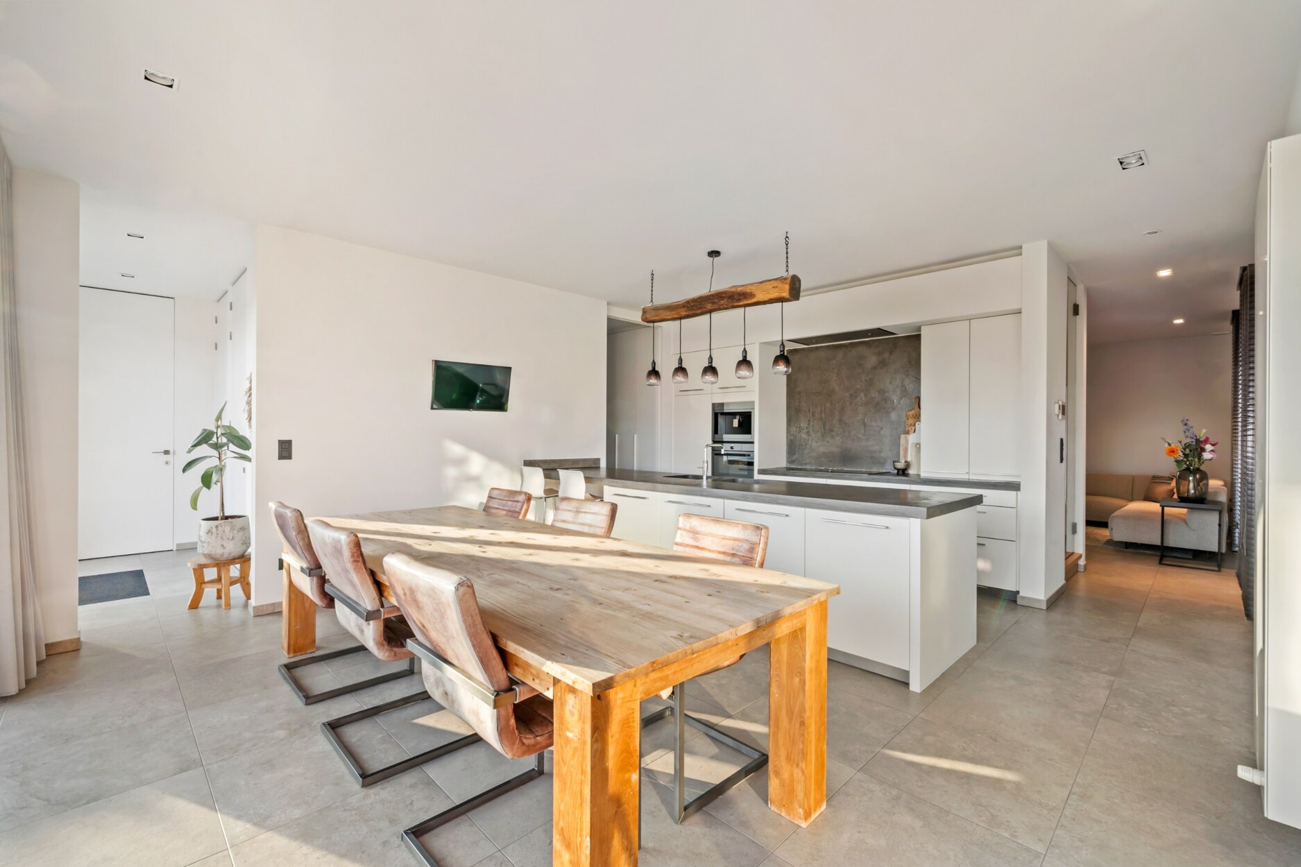 De woning is toegankelijk via de inkomhal met vestiaireruimte. Deze geeft toegang via een dubbele houten deur tot de gezellige woonkamer met op maat gemaakte bureau. De keuken beschikt over een vaatwasmachine, ijskast, ingebouwde koffiemachine, stoomoven en inductievuur. Door de grote glaspartijen geniet u hier van een aangename lichtinval en zicht op de tuin. In de wasplaats geniet u van vele ingemaakte kasten en de mogelijkheid uw machines op hoogte te zetten. Voorts treft u op de gelijkvloerse verdieping een apart toilet en badkamer met inloopdouche en lavabomeubel.