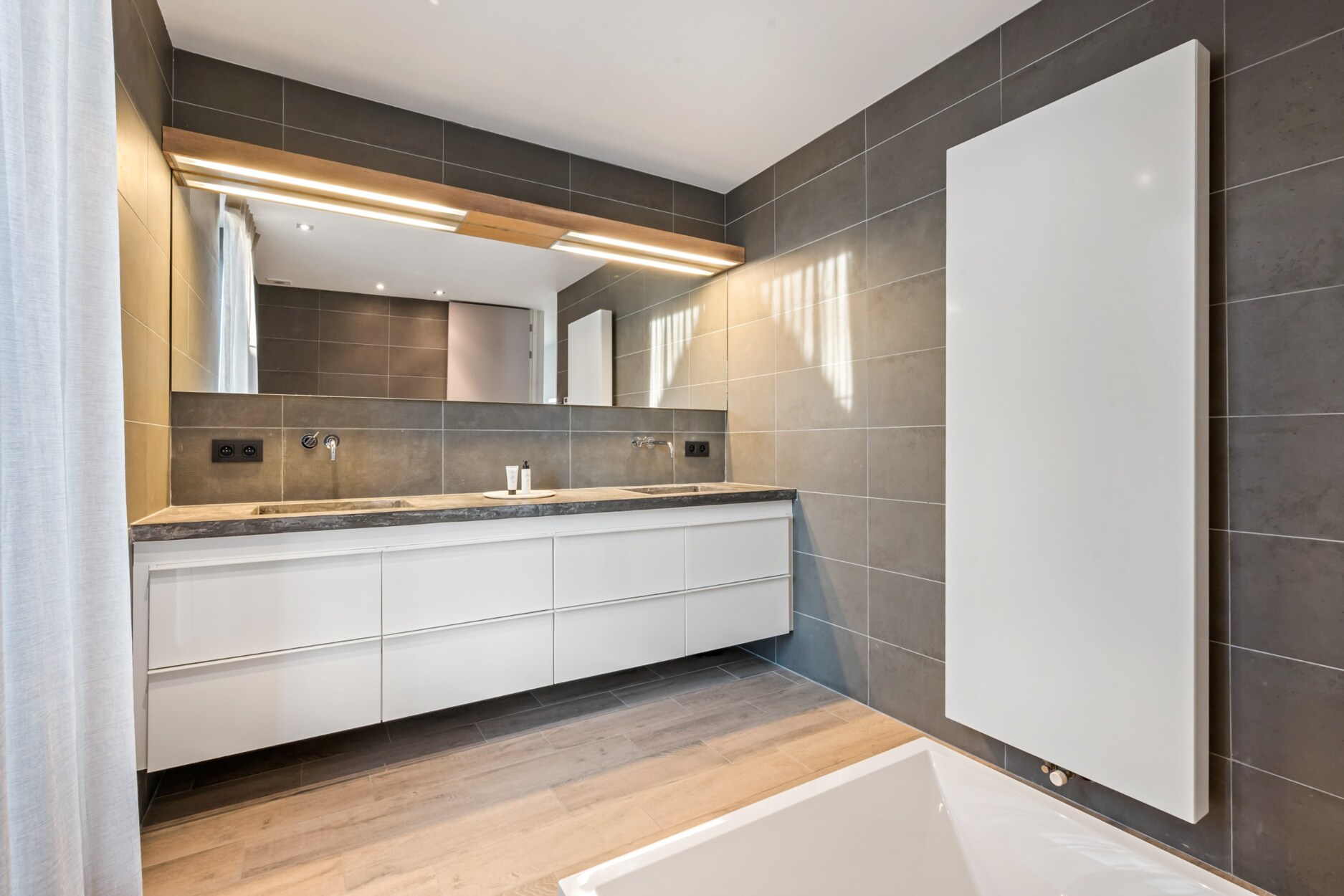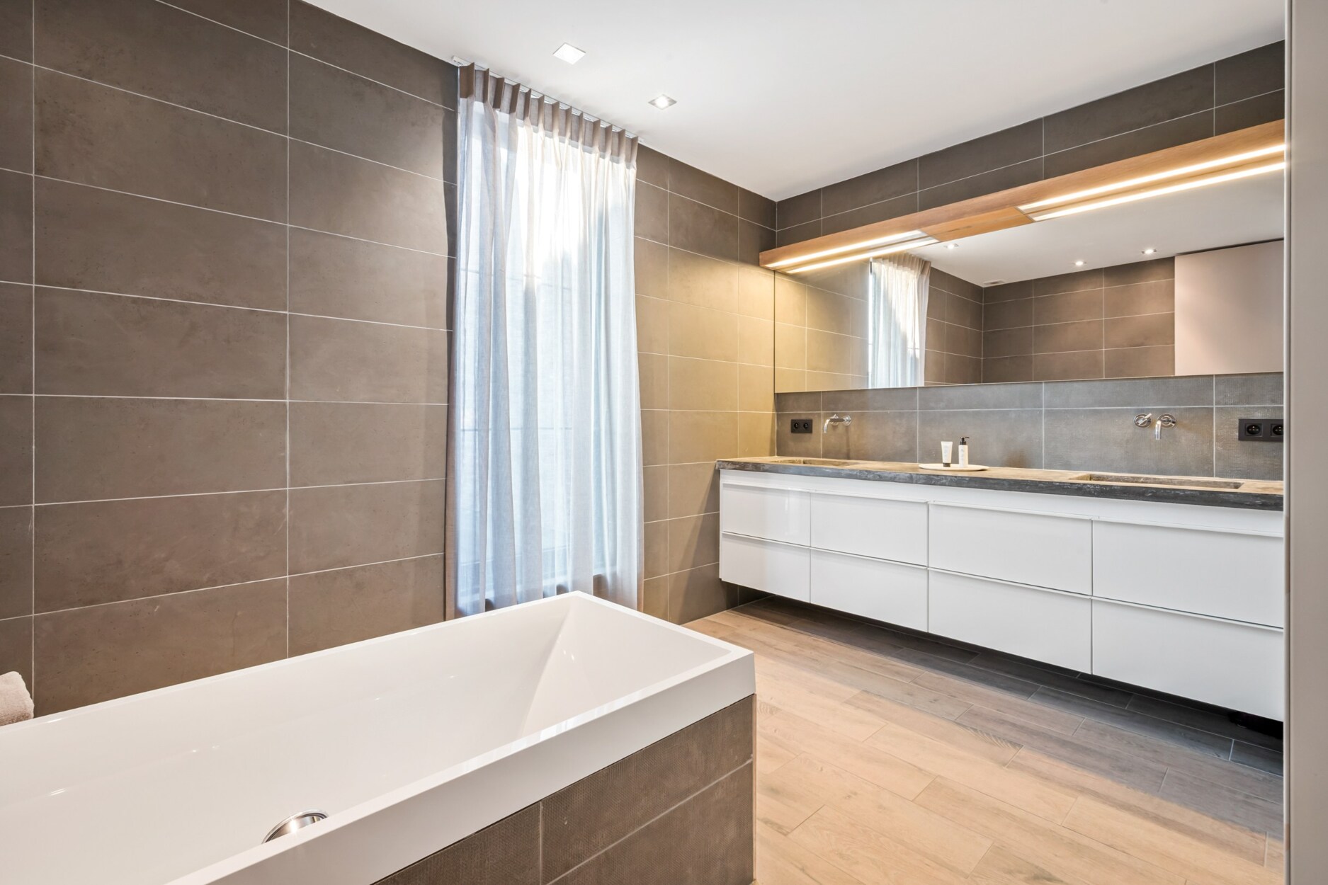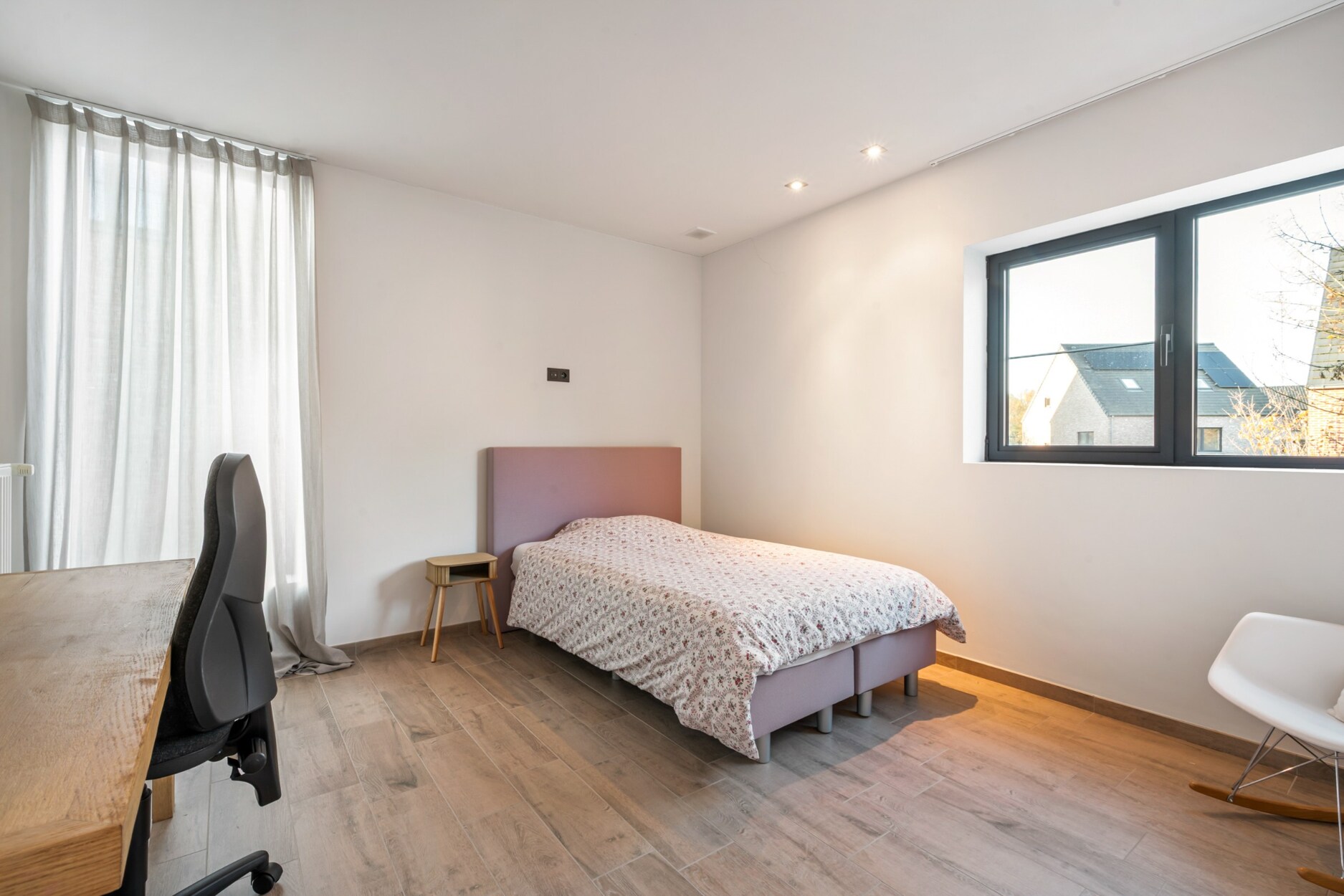 Op de eerste verdieping zijn er 4 slaapkamers voorzien waarbij 2 kinderkamers worden afgescheiden door een ingemaakte kastenwand waardoor het ook mogelijk is deze als 1 grote kamer te gebruiken. Voorts vinden we hier een ruime badkamer terug die is voorzien van ligbad en dubbel lavabomeubel.