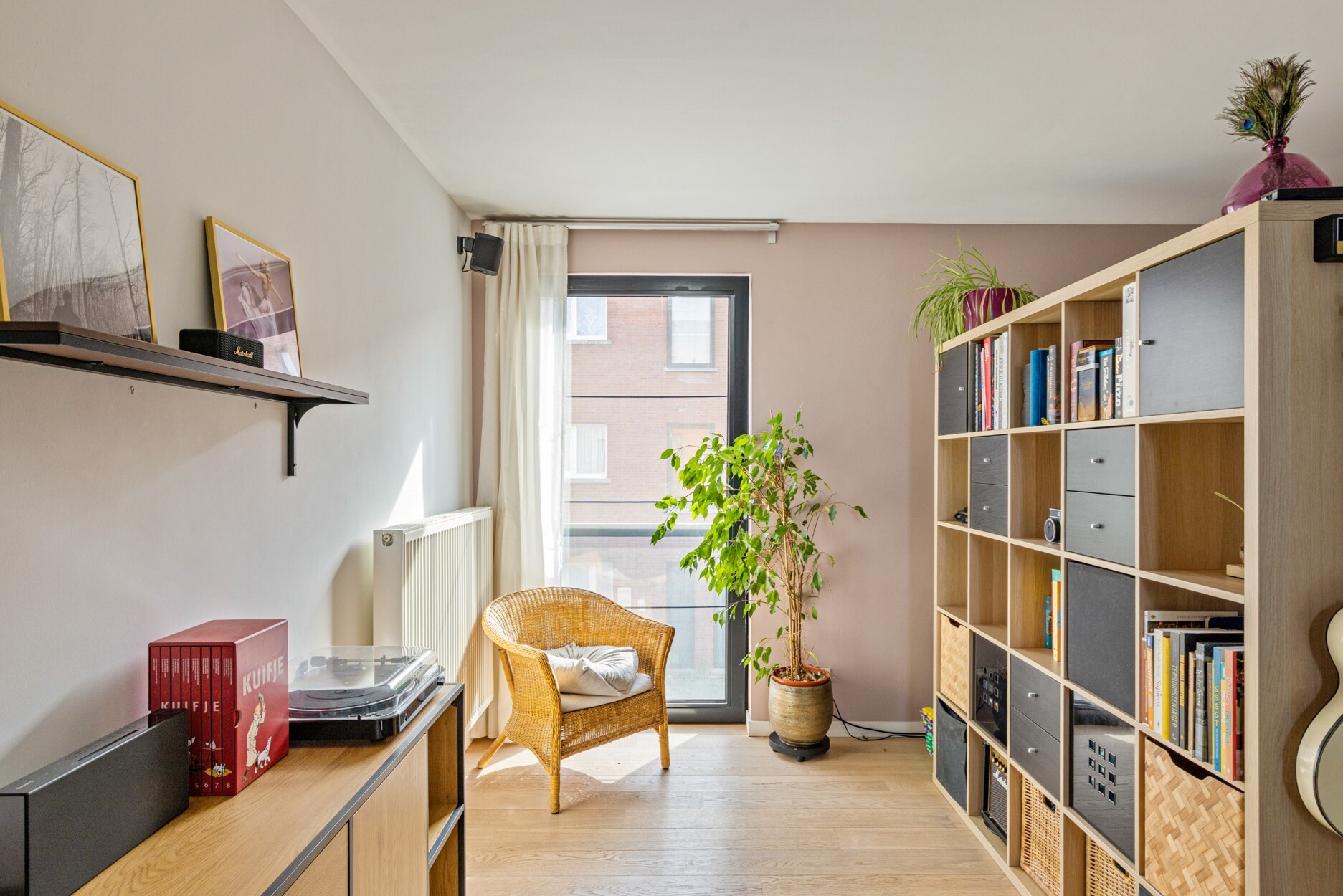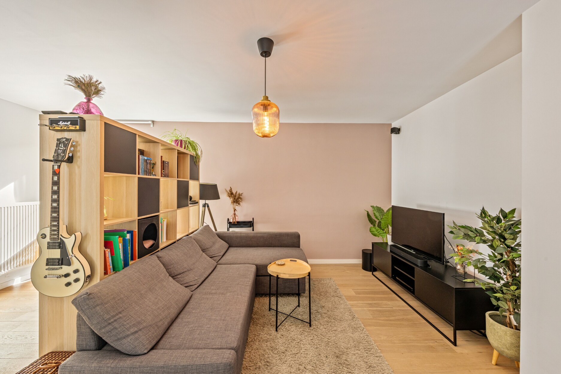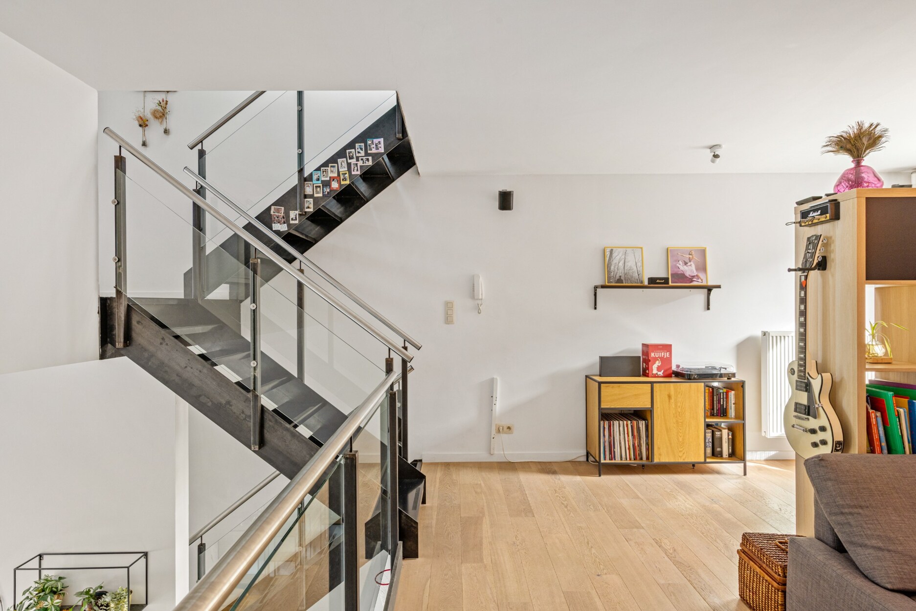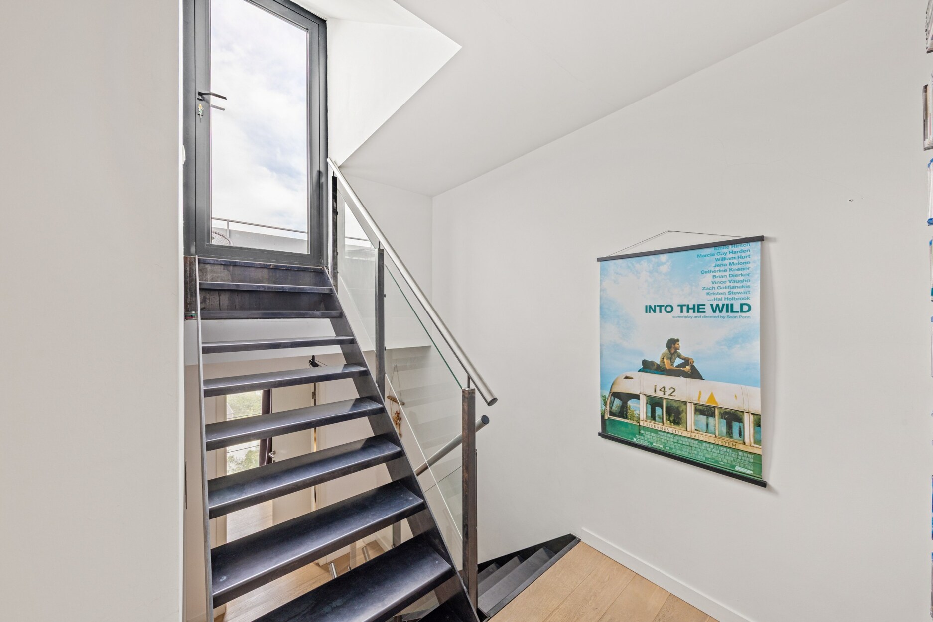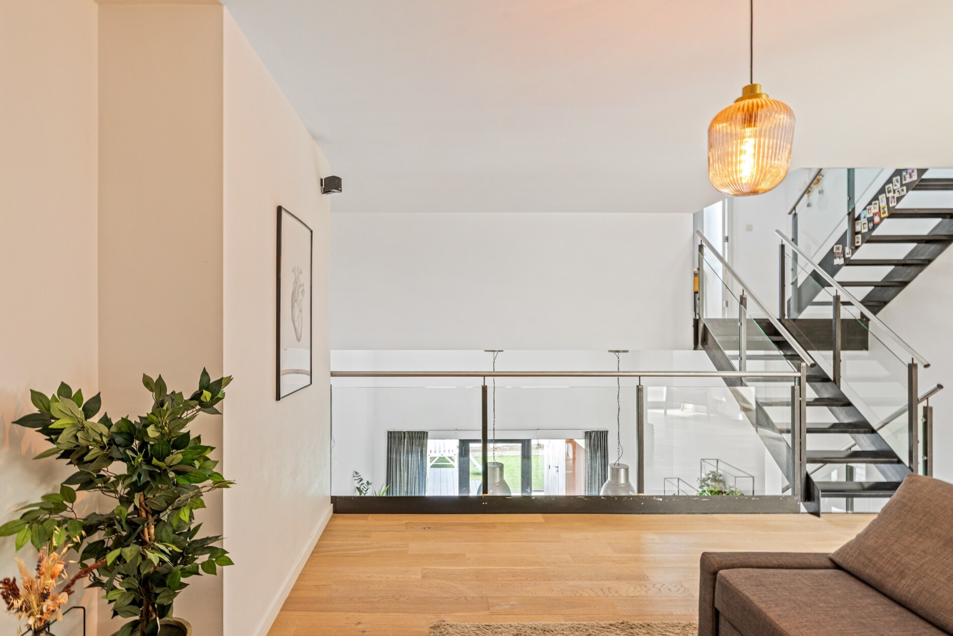De trap vanuit de eetruimte brengt u tot de volgende etage op parket. Hier treft u een gezellige zithoek met open vide zodat u de connectie behoudt met de leefruimte op het gelijkvloers.