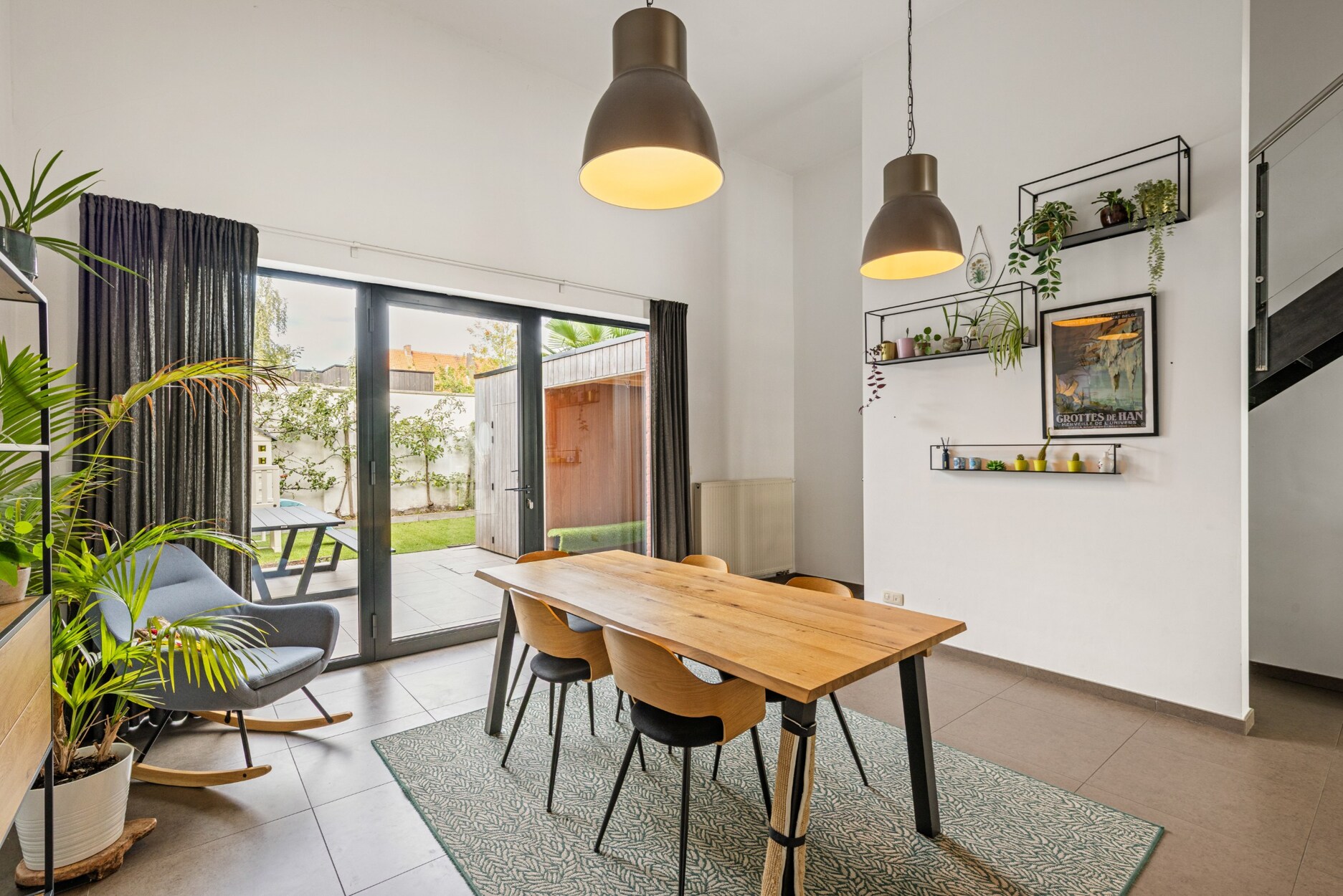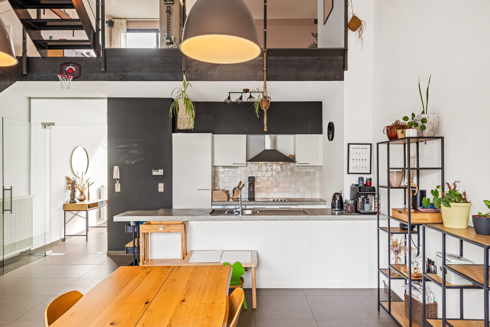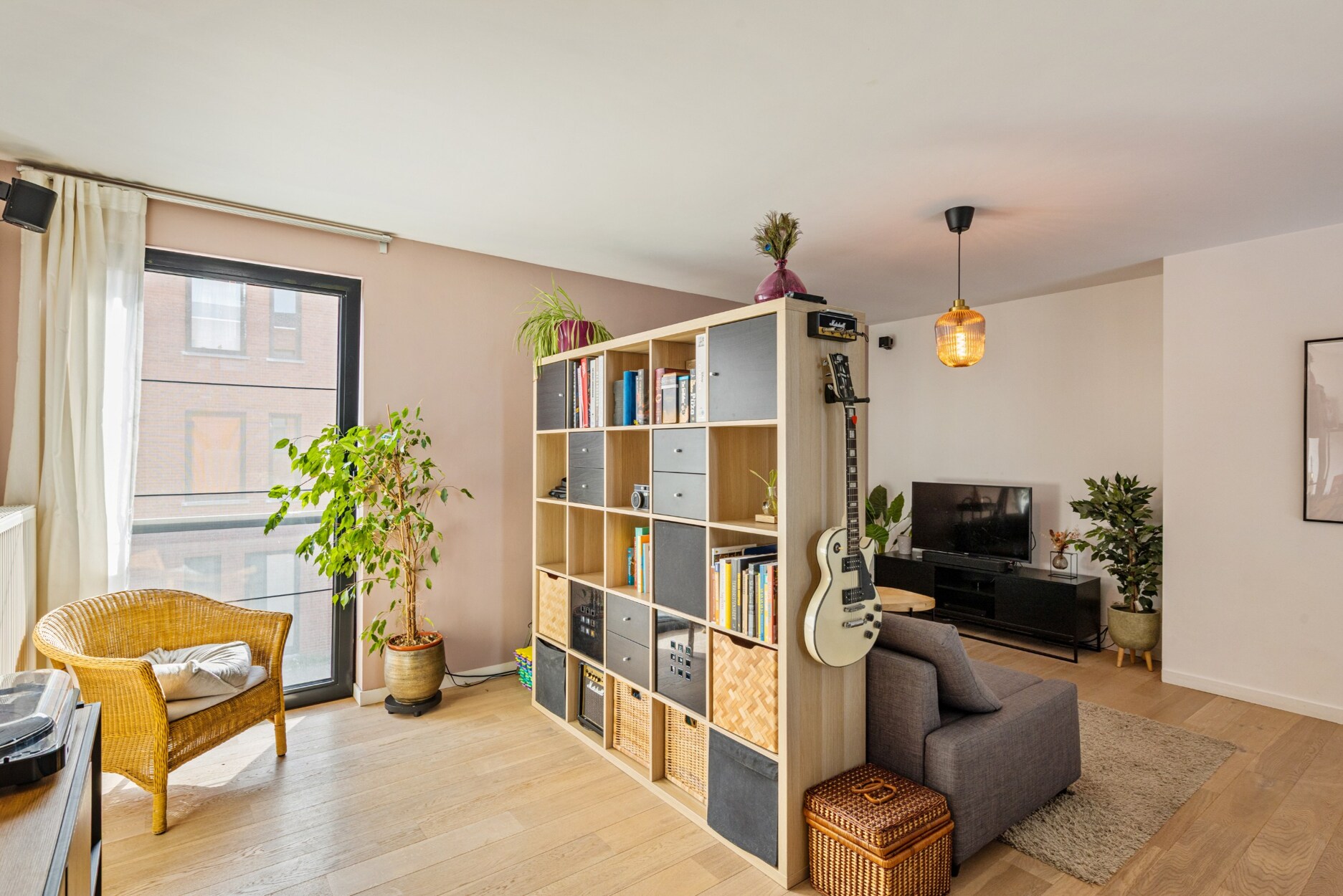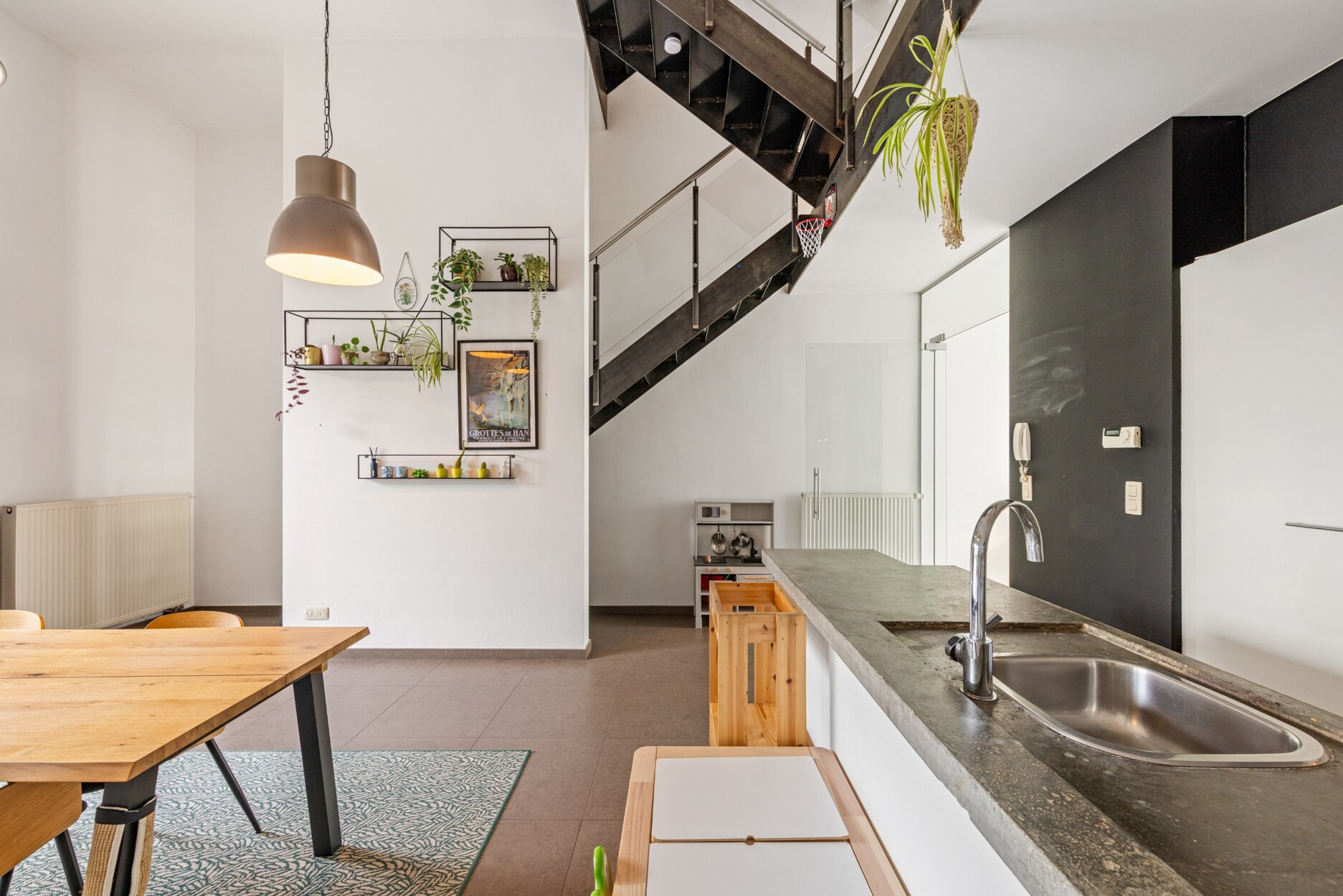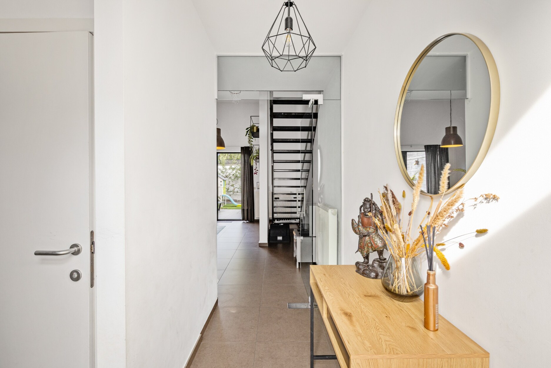 De trap vanuit de eetruimte brengt u tot de volgende etage op parket. Hier treft u een gezellige zithoek met open vide zodat u de connectie behoudt met de leefruimte op het gelijkvloers.