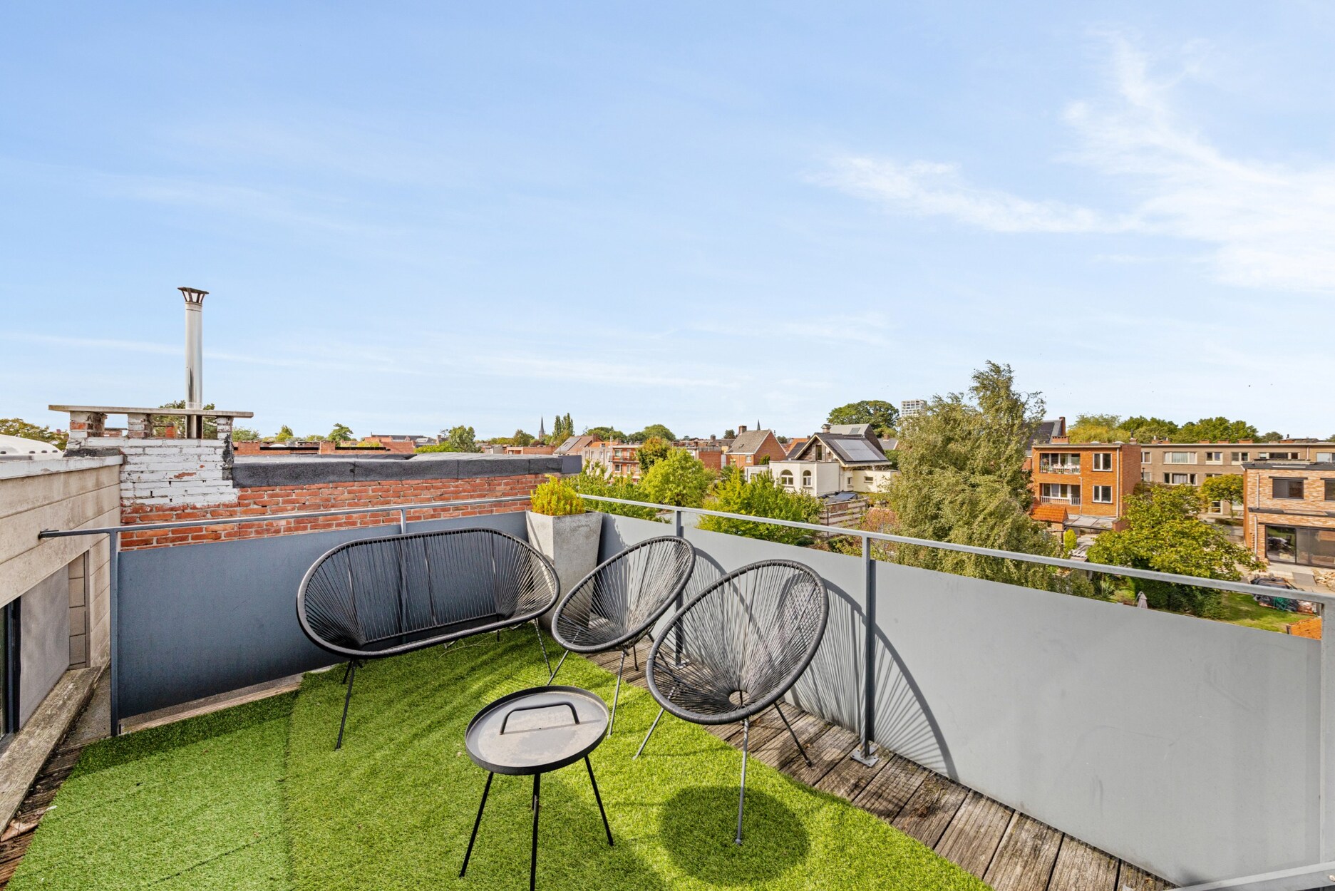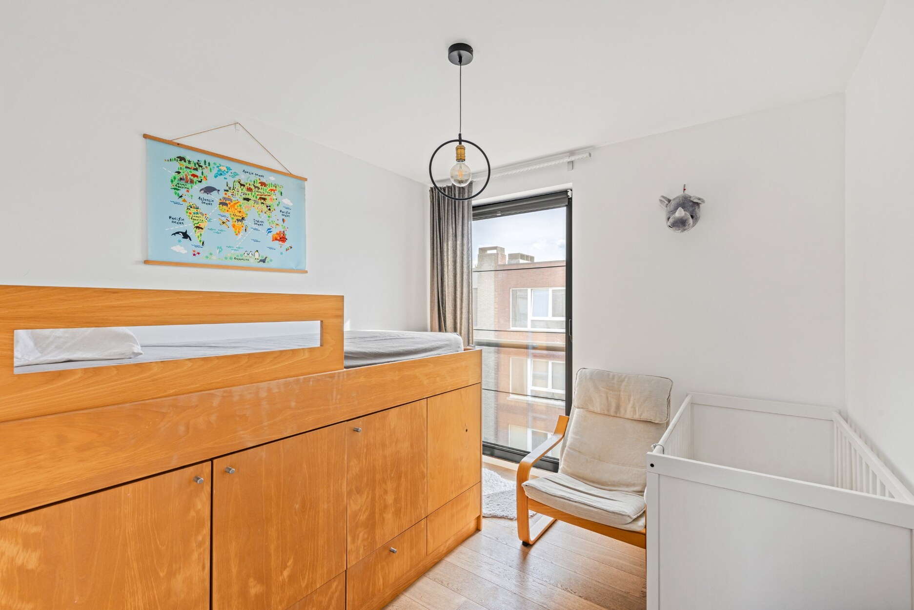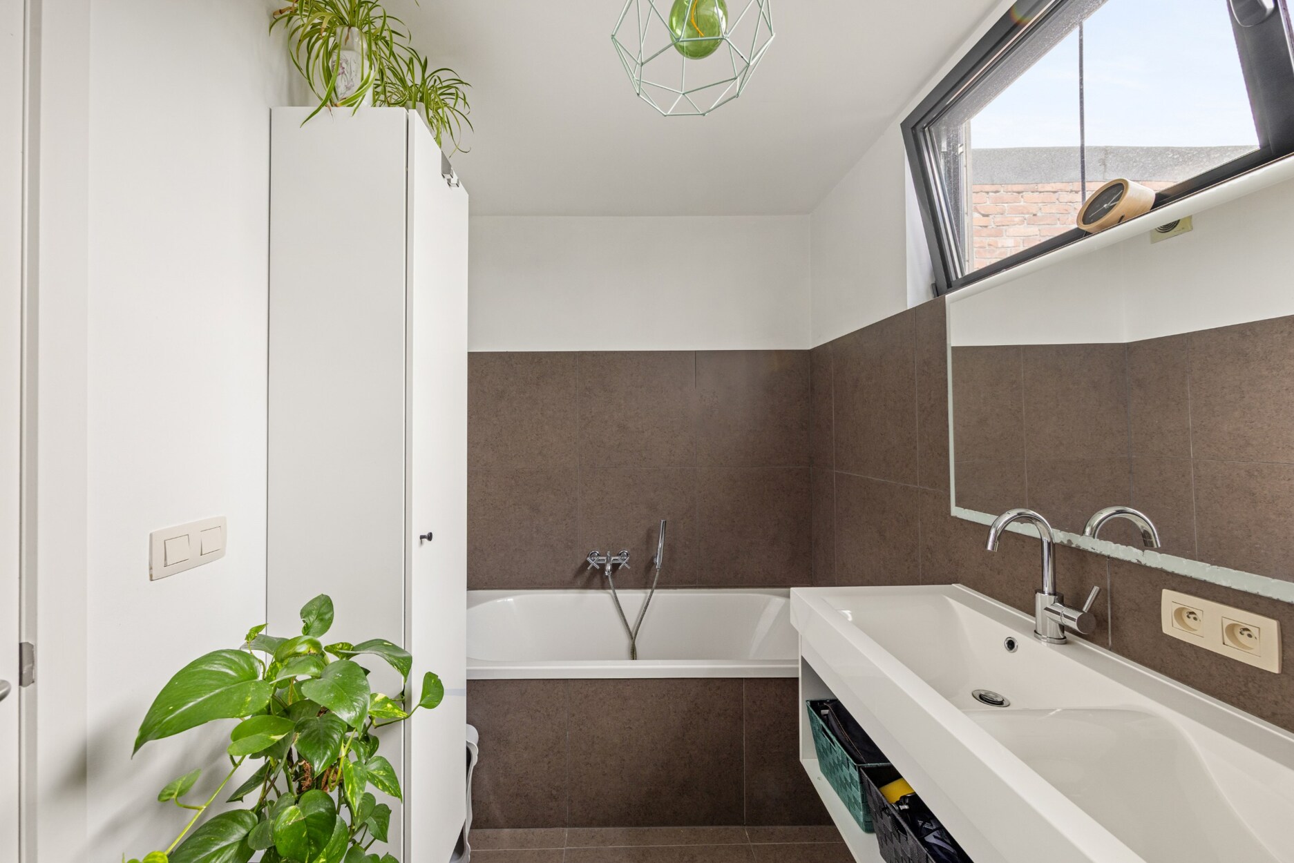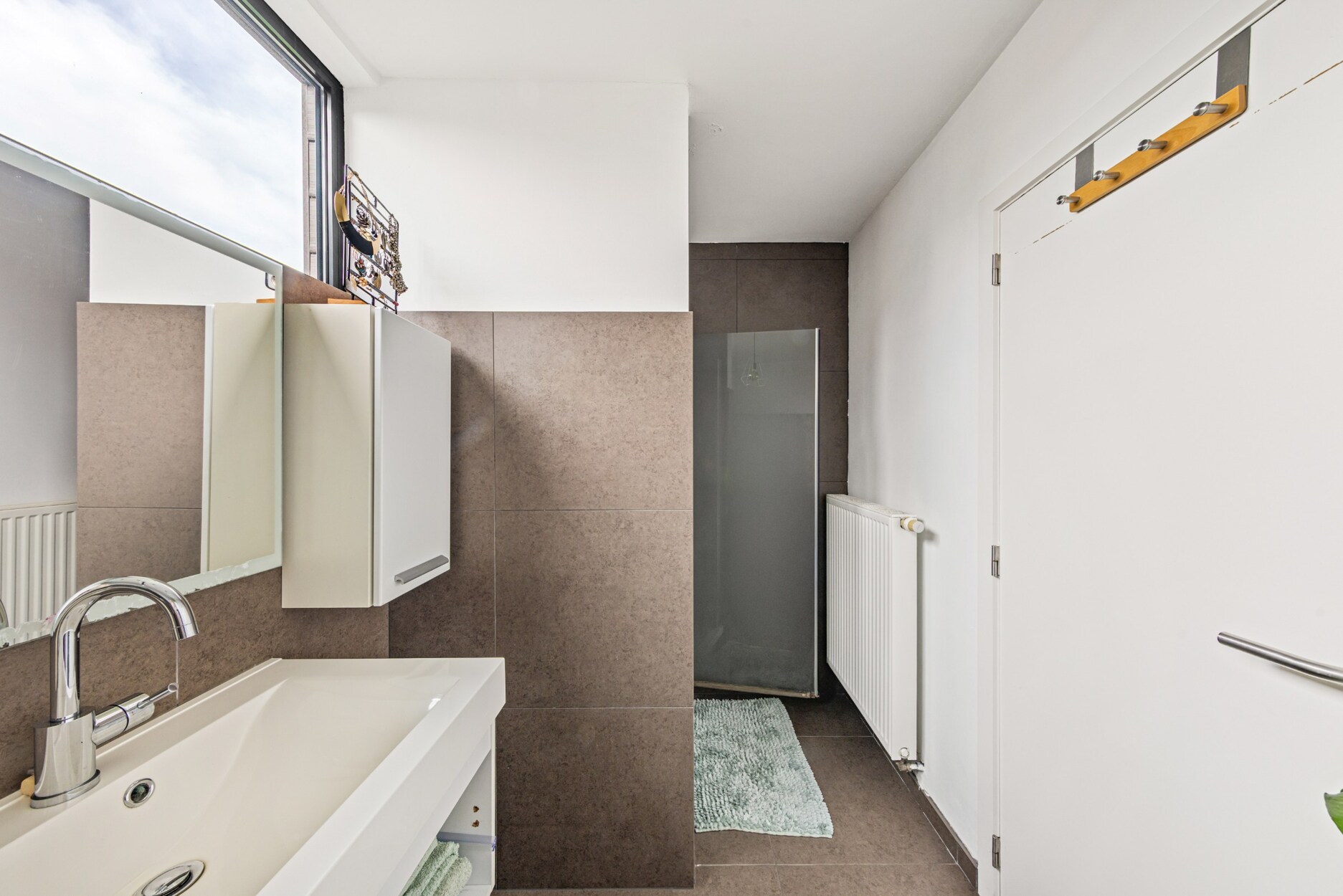 Op de bovenste verdieping treft u de twee overige slaapkamers die dienst kunnen doen als kinderslaapkamer/bureau/... Hier bevindt zich eveneens de badkamer voorzien van ligbad, douche en dubbele lavabo, alsook een apart toilet. Via een trap bereikt u het dakterras op bankirai.