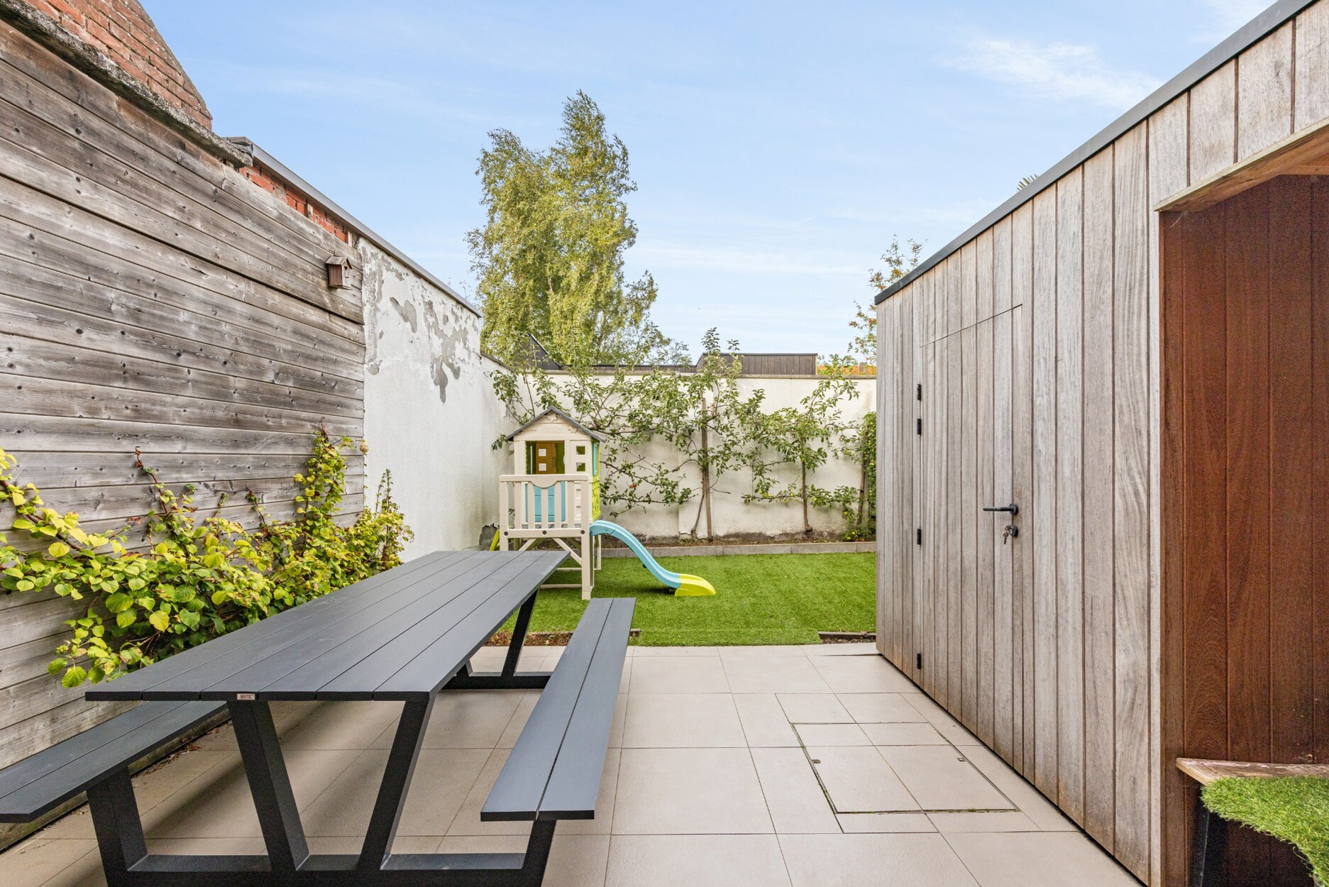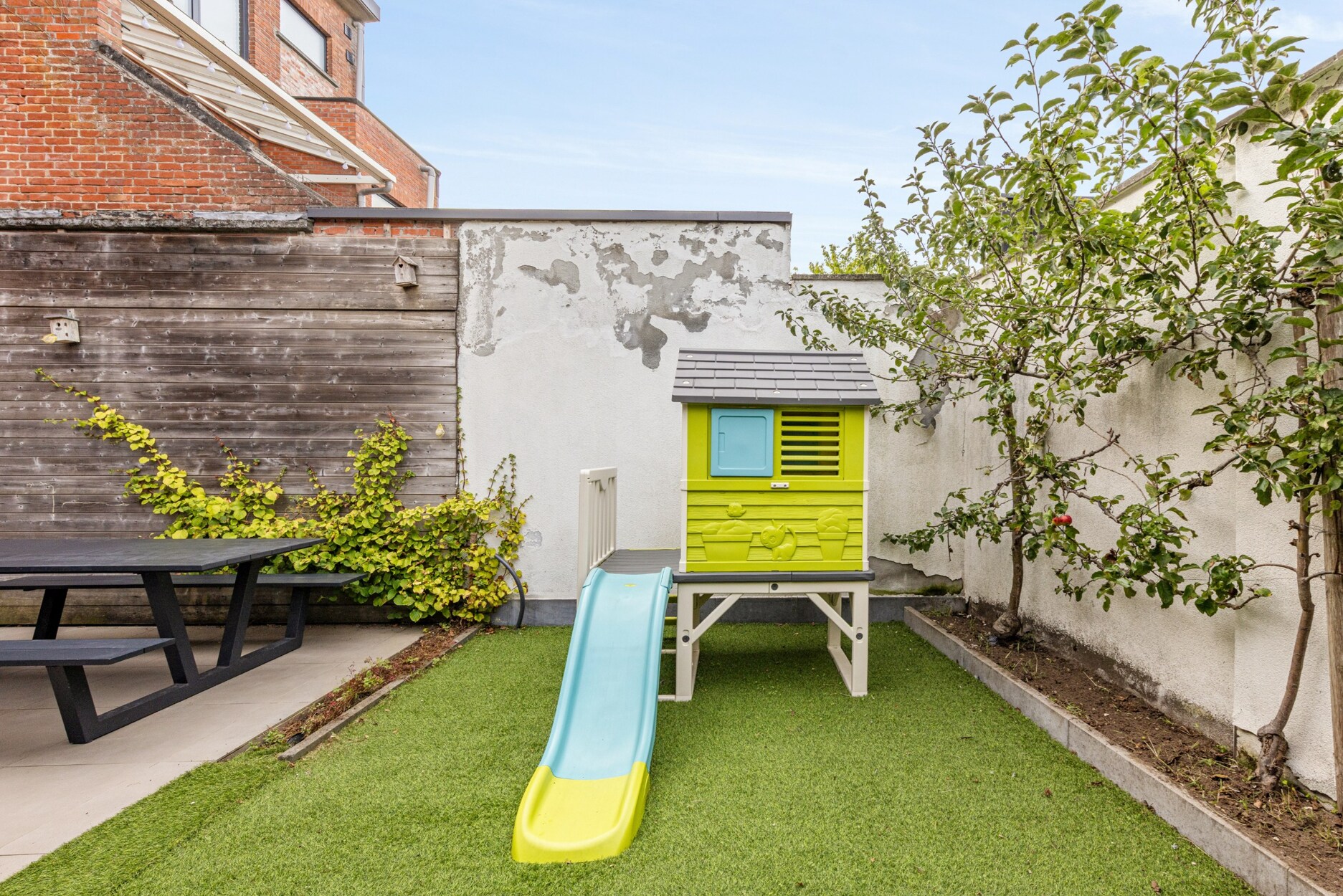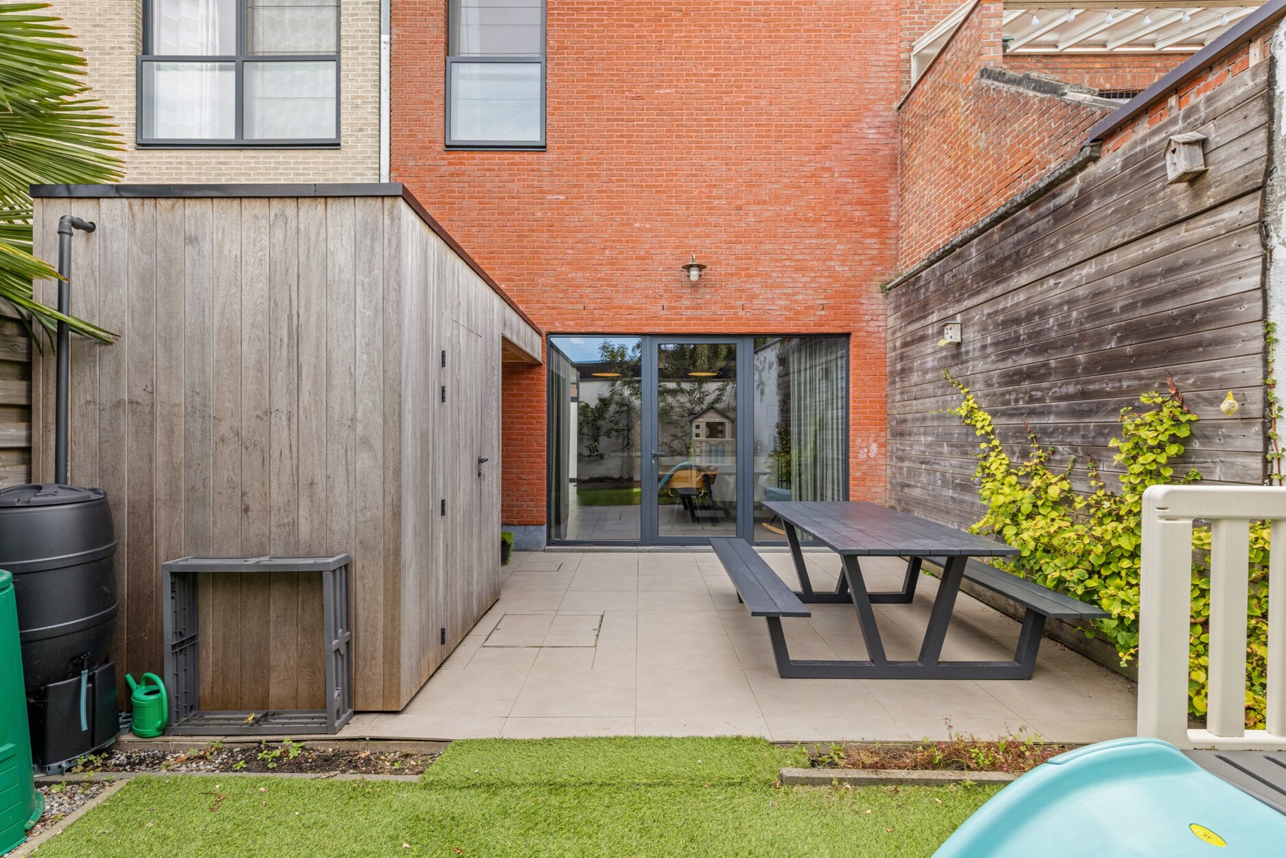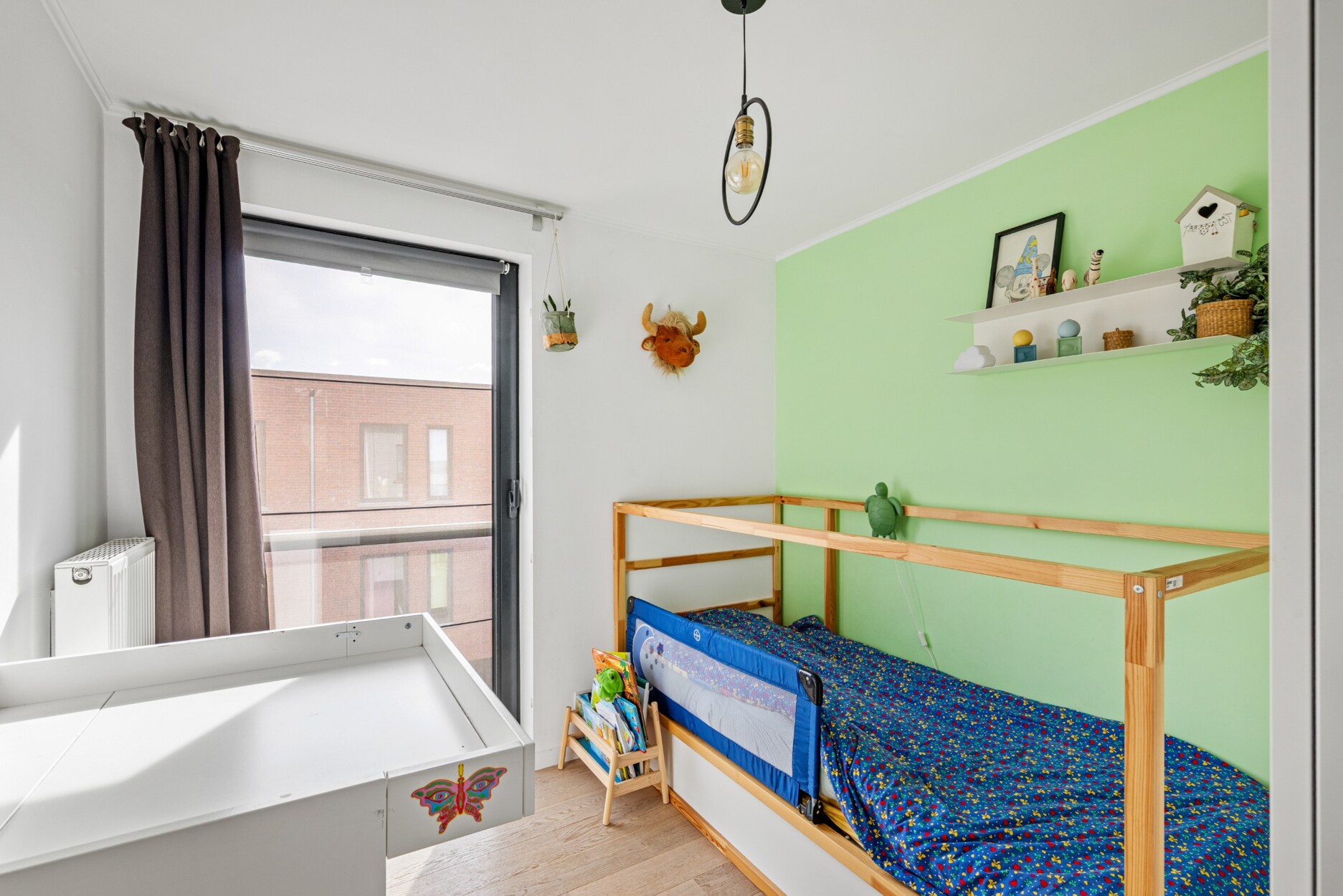Op de bovenste verdieping treft u de twee overige slaapkamers die dienst kunnen doen als kinderslaapkamer/bureau/... Hier bevindt zich eveneens de badkamer voorzien van ligbad, douche en dubbele lavabo, alsook een apart toilet. Via een trap bereikt u het dakterras op bankirai.