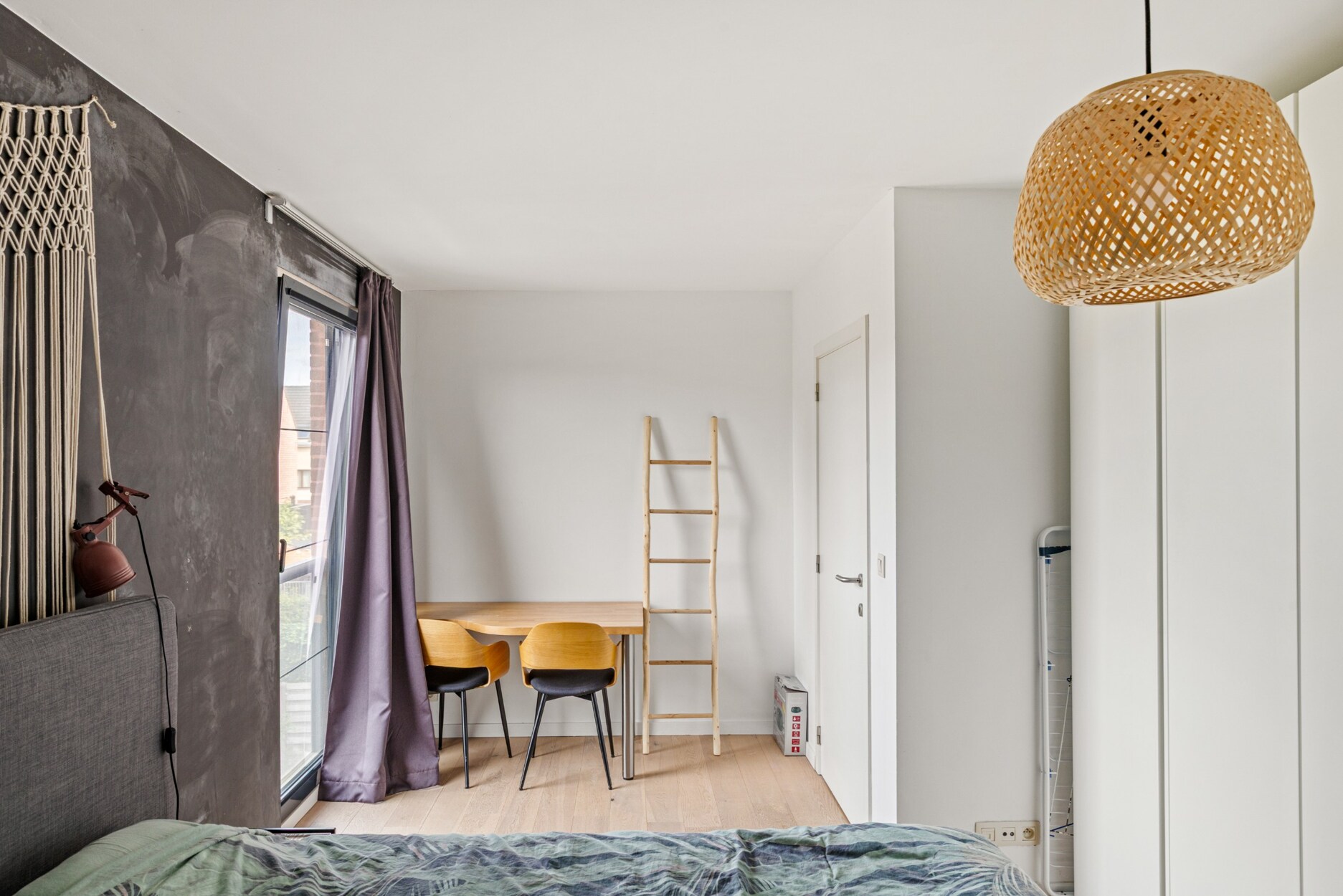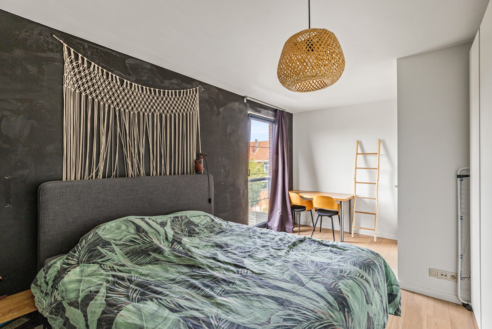 De masterbedroom, tevens op parket, bevindt zich een halve verdieping hoger en is rustig gelegen aan de achterzijde van de woning. Er is voldoende ruimte voor het plaatsen van een grote dressingkast.