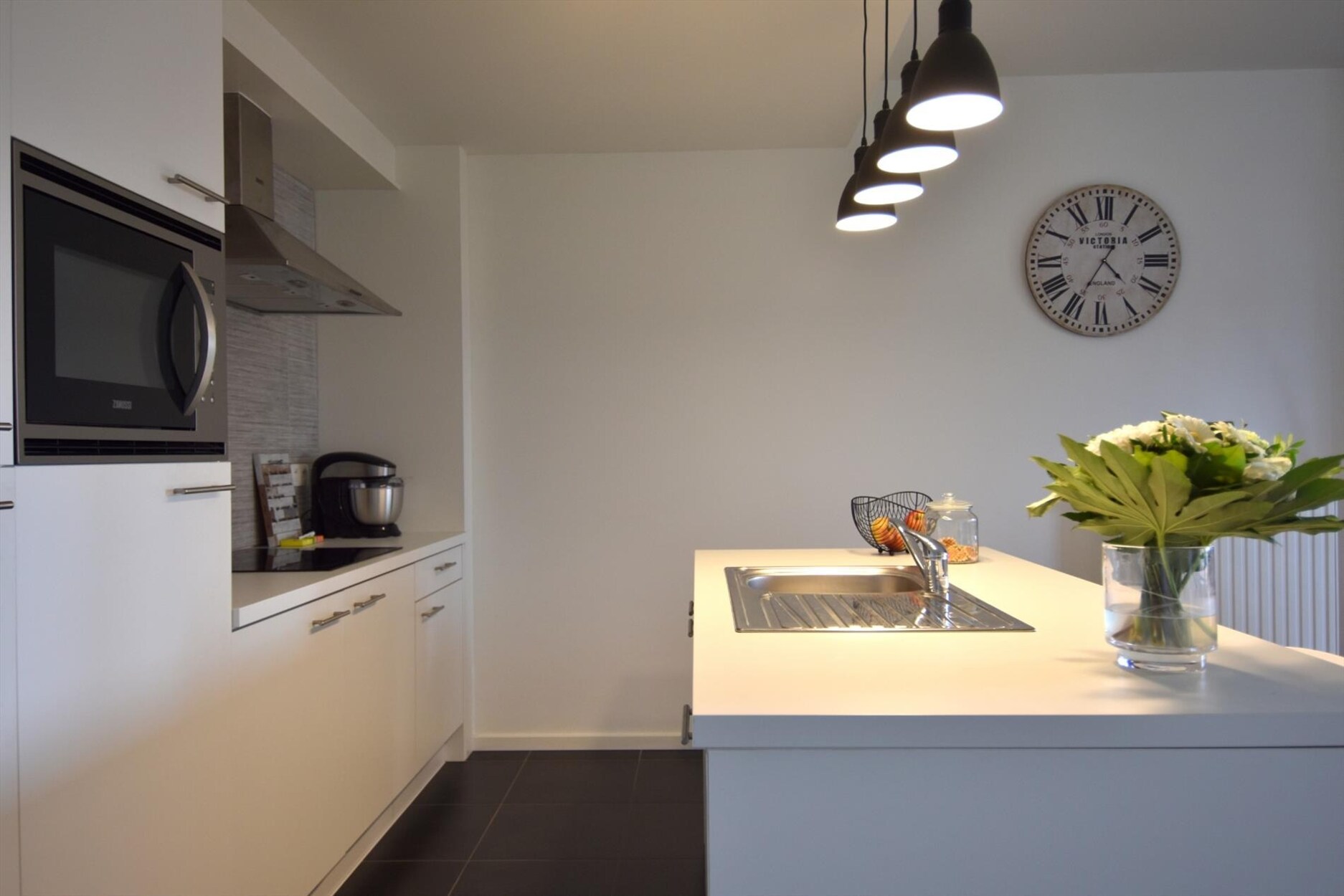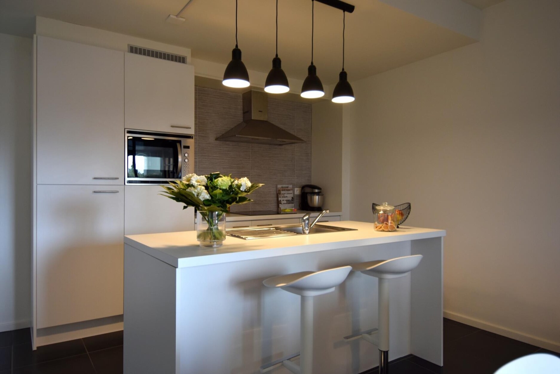 De woonkamer is niet heel erg groot maar wel knus en lekker licht! Van hieruit stap je zo het terras op, waar je een mooi zicht hebt over de stad. Extra leuk: dankzij de schuiframen kan je het terras volledig winddicht maken. Resultaat? Een buitenruimte waar je het hele jaar door kan genieten. De open keuken is ingericht met een inductiekookplaat, koelkast, vaatwasser en combi-oven. Aansluitend vind je nog een ruime berging met plek voor wasmachine, droogkast én je extra voorraad.