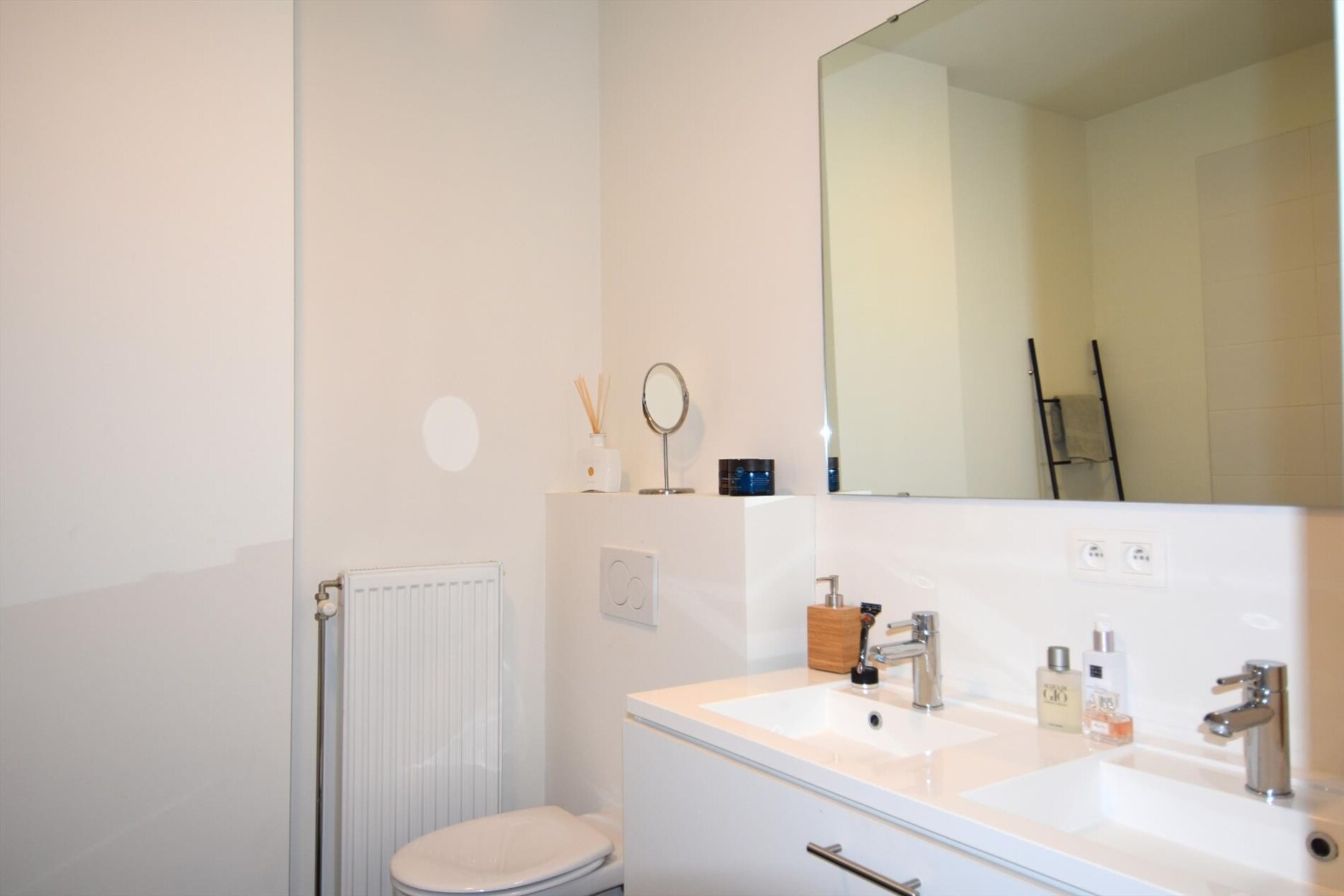 Via de hal bereik je het aparte toilet, de twee slaapkamers en de badkamer. Die laatste is uitgerust met een ligbad met geïntegreerde douche, dubbele wastafel én nog een tweede toilet.