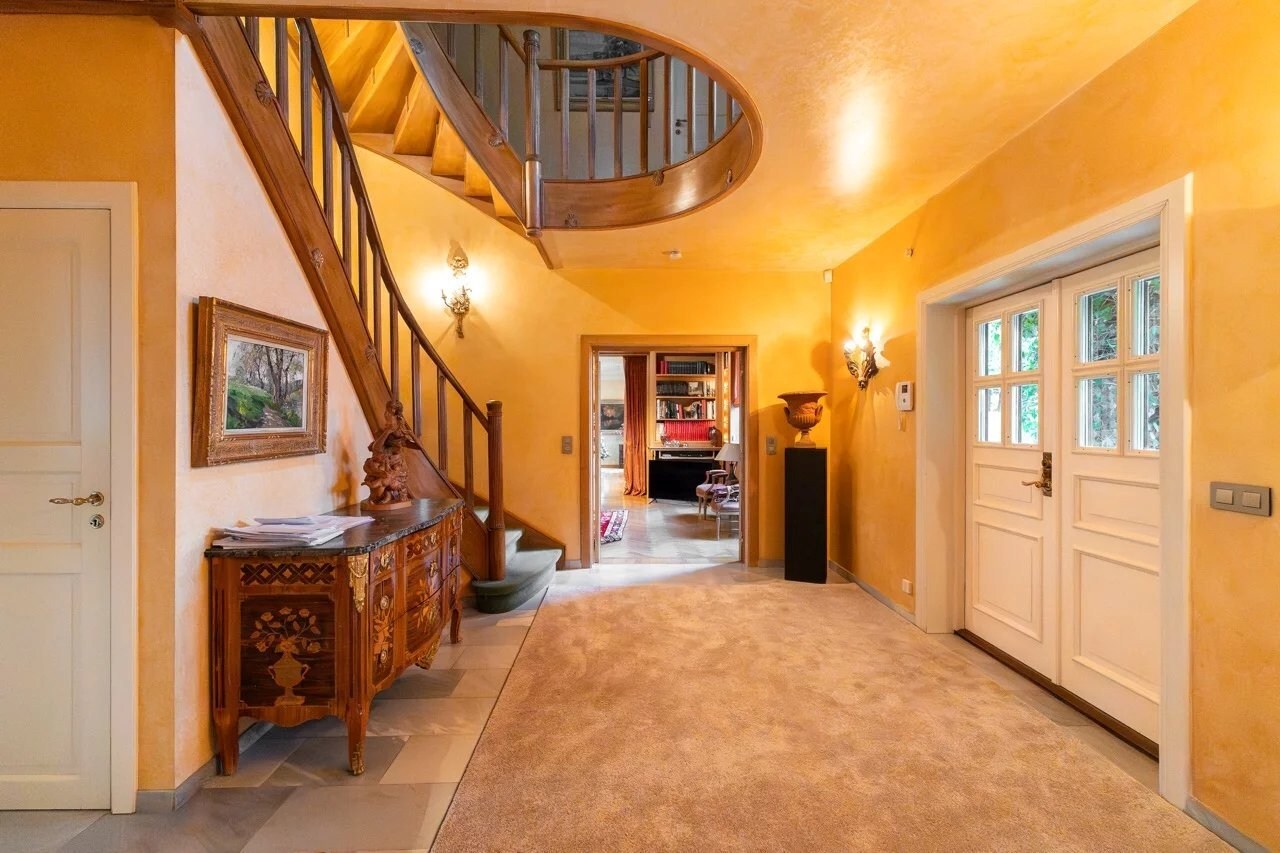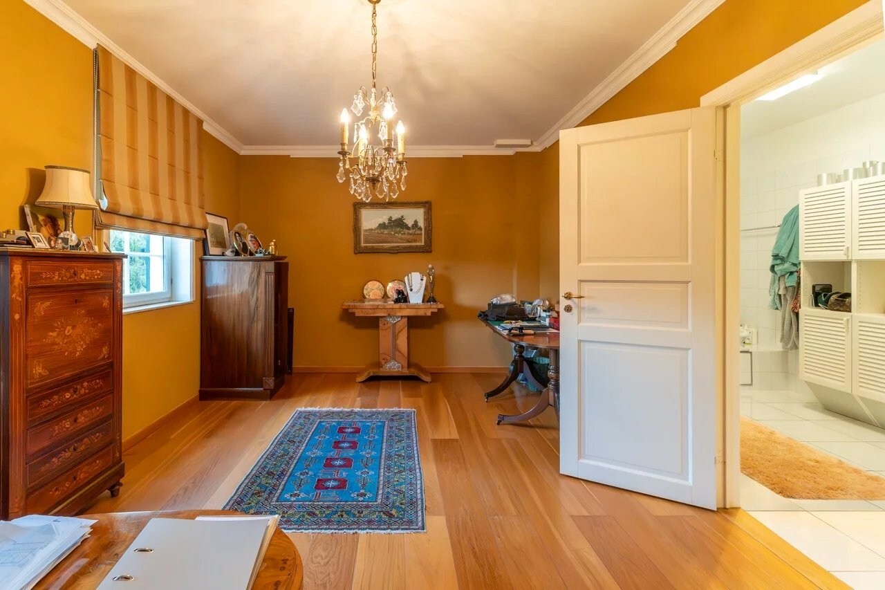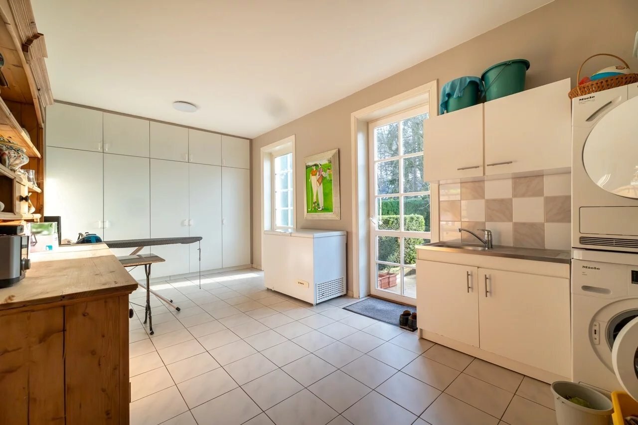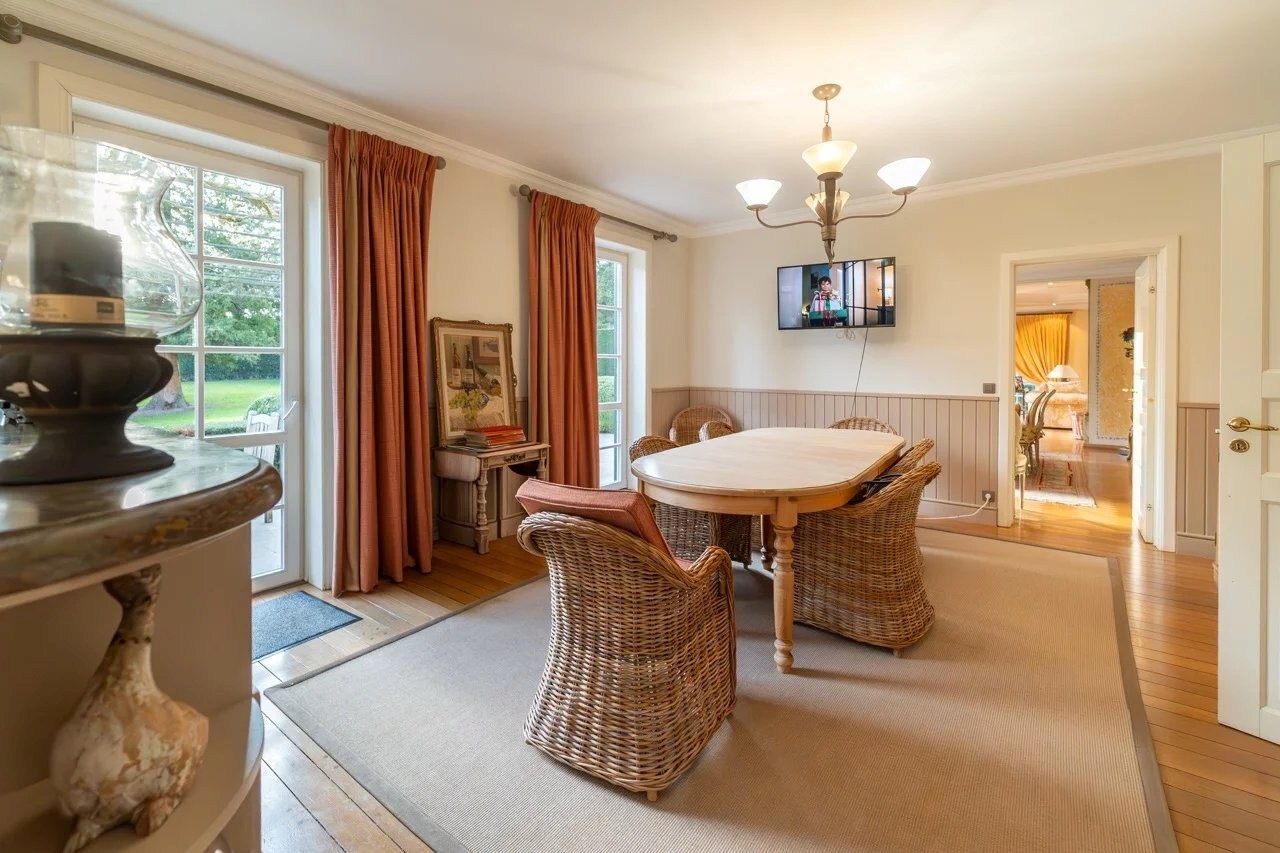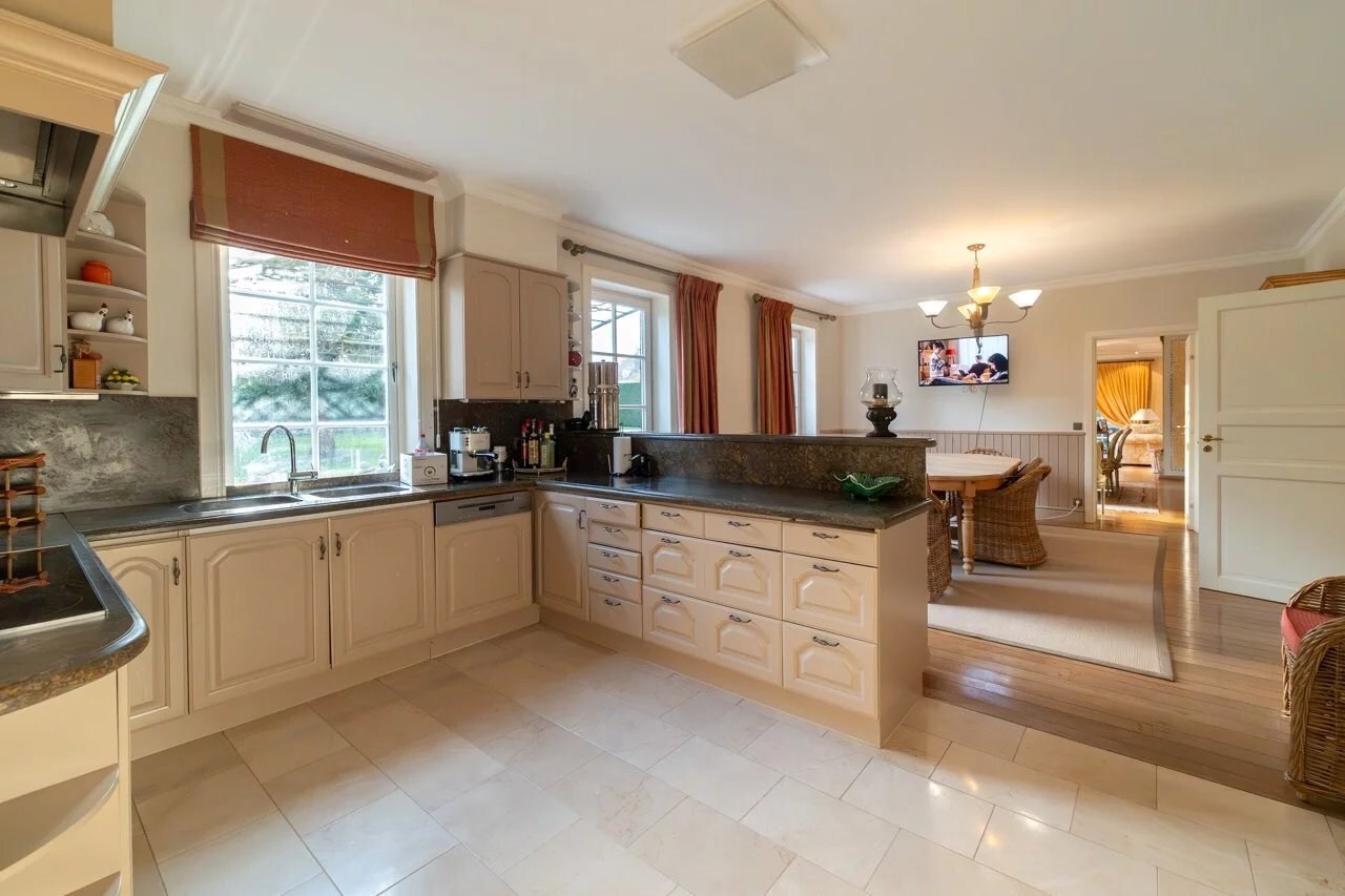 Op de begane grond leidt een ruime inkomhal met vestiaire en gastentoilet naar een gezellige woonkamer, een eetkamer, een volledig uitgeruste keuken met ontbijthoek, een achterkeuken/wasruimte, een kantoor, een bibliotheek en een eerste slaapkamer met en-suite badkamer.