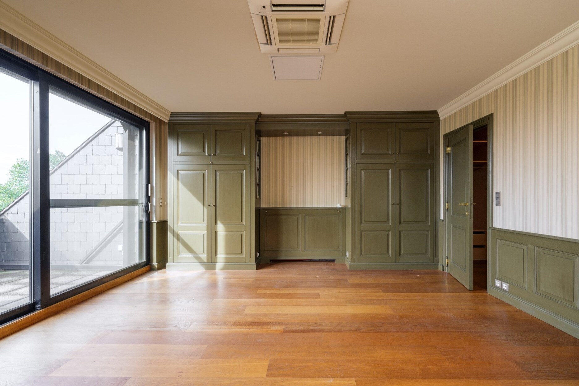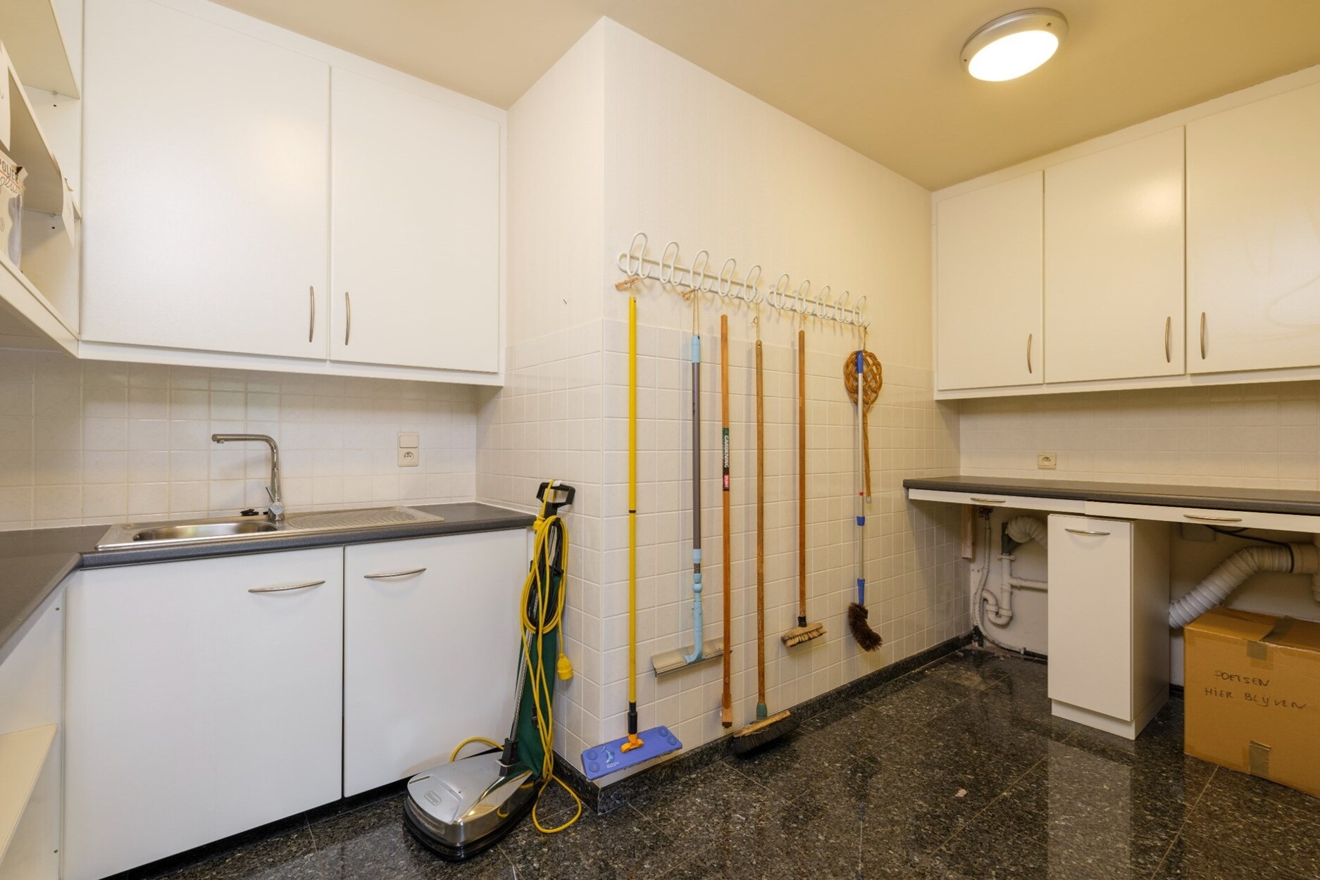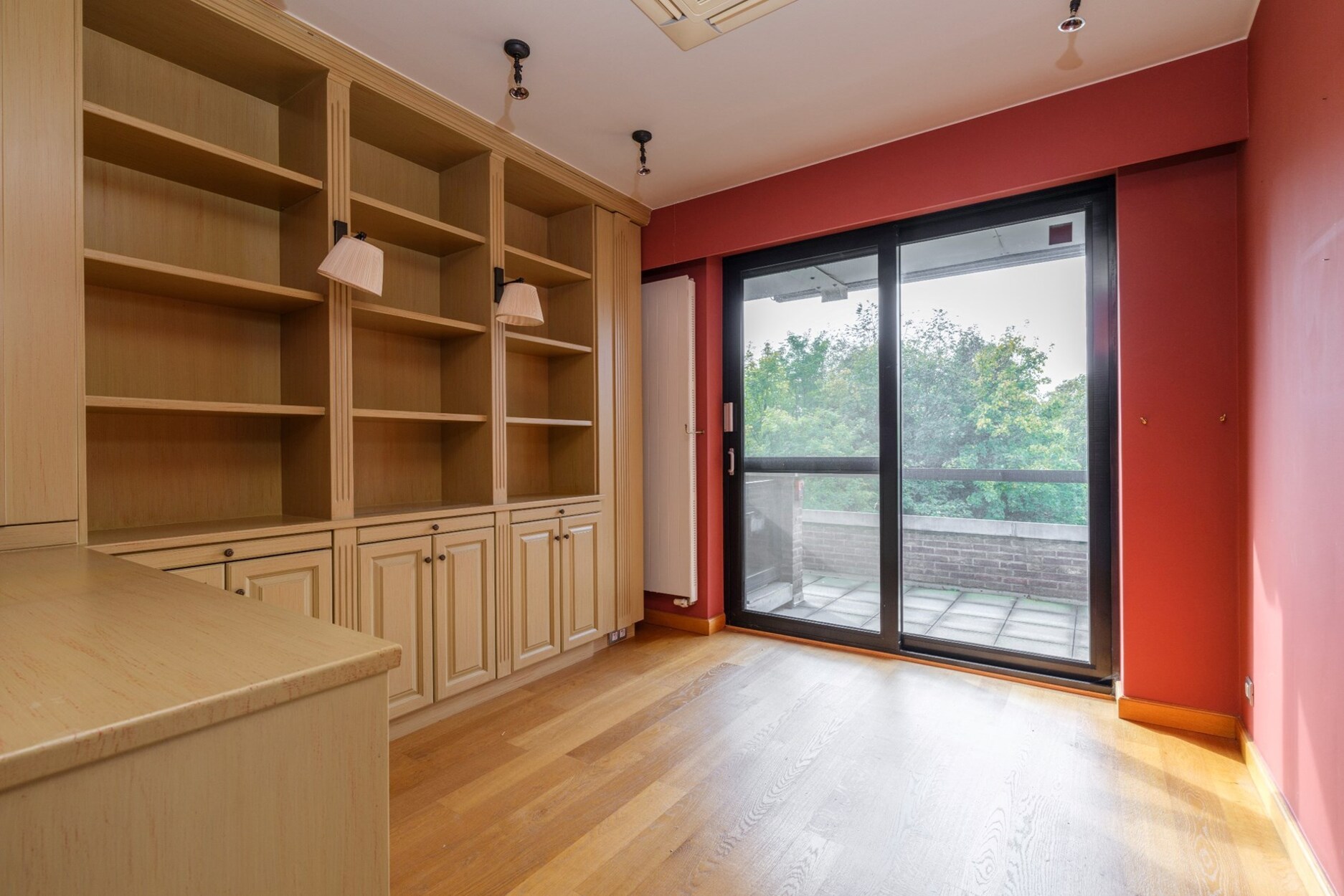 De maatkeuken met gebruik van degelijke en tijdloze materialen is compleet uitgerust en heeft directe toegang tot het terras. Het keukengedeelte is perfect afgestemd op de open eet- en zitruimte. Er is een aansluitende eetruimte met op maat gemaakte kasten en schouwmantel en een achterliggende was/bergruimte voorzien. Buiten het esthetische is er ook volop gekeken naar de praktische kant van dit uitzonderlijk geheel. Via de nachthal bereiken we bureauruimte met op maat gemaakte bibliotheekkasten. Naastliggend is er de ruime suite met dressing en luxe badkamer. Ook hier is er toegang tot het terras met zicht op het eigen "stads"bos. Deze groene oase met achteruitgang behoort tot de residentie.