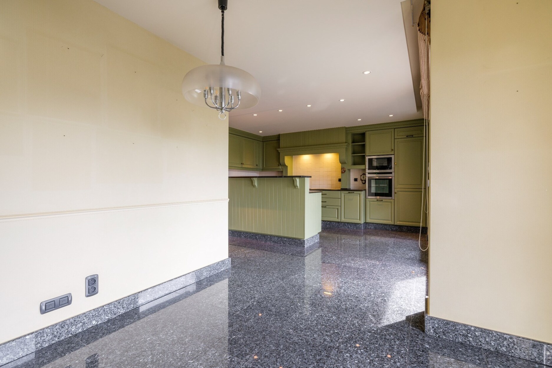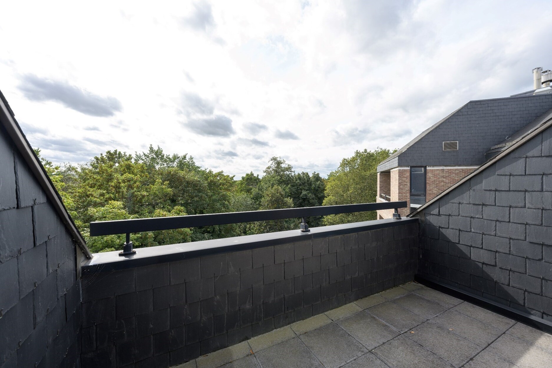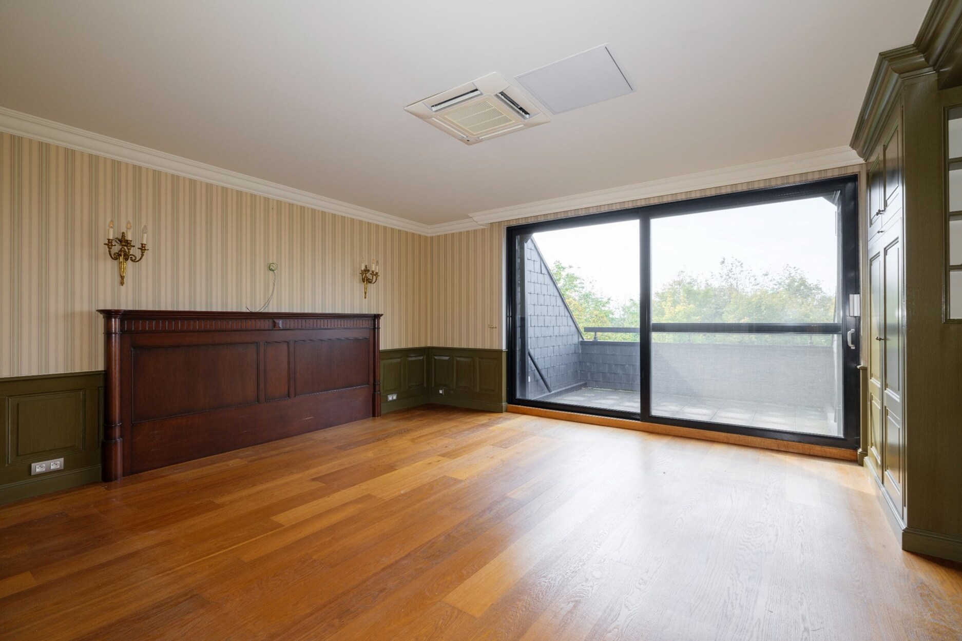 De maatkeuken met gebruik van degelijke en tijdloze materialen is compleet uitgerust en heeft directe toegang tot het terras. Het keukengedeelte is perfect afgestemd op de open eet- en zitruimte. Er is een aansluitende eetruimte met op maat gemaakte kasten en schouwmantel en een achterliggende was/bergruimte voorzien. Buiten het esthetische is er ook volop gekeken naar de praktische kant van dit uitzonderlijk geheel. Via de nachthal bereiken we bureauruimte met op maat gemaakte bibliotheekkasten. Naastliggend is er de ruime suite met dressing en luxe badkamer. Ook hier is er toegang tot het terras met zicht op het eigen "stads"bos. Deze groene oase met achteruitgang behoort tot de residentie.