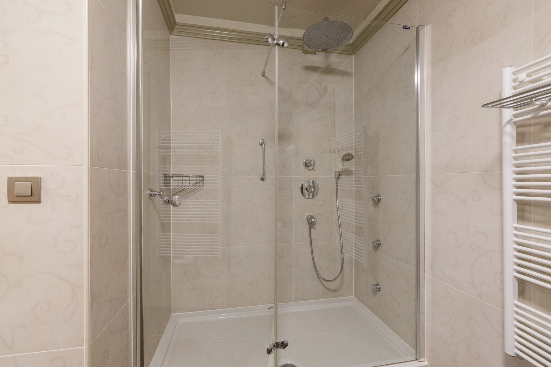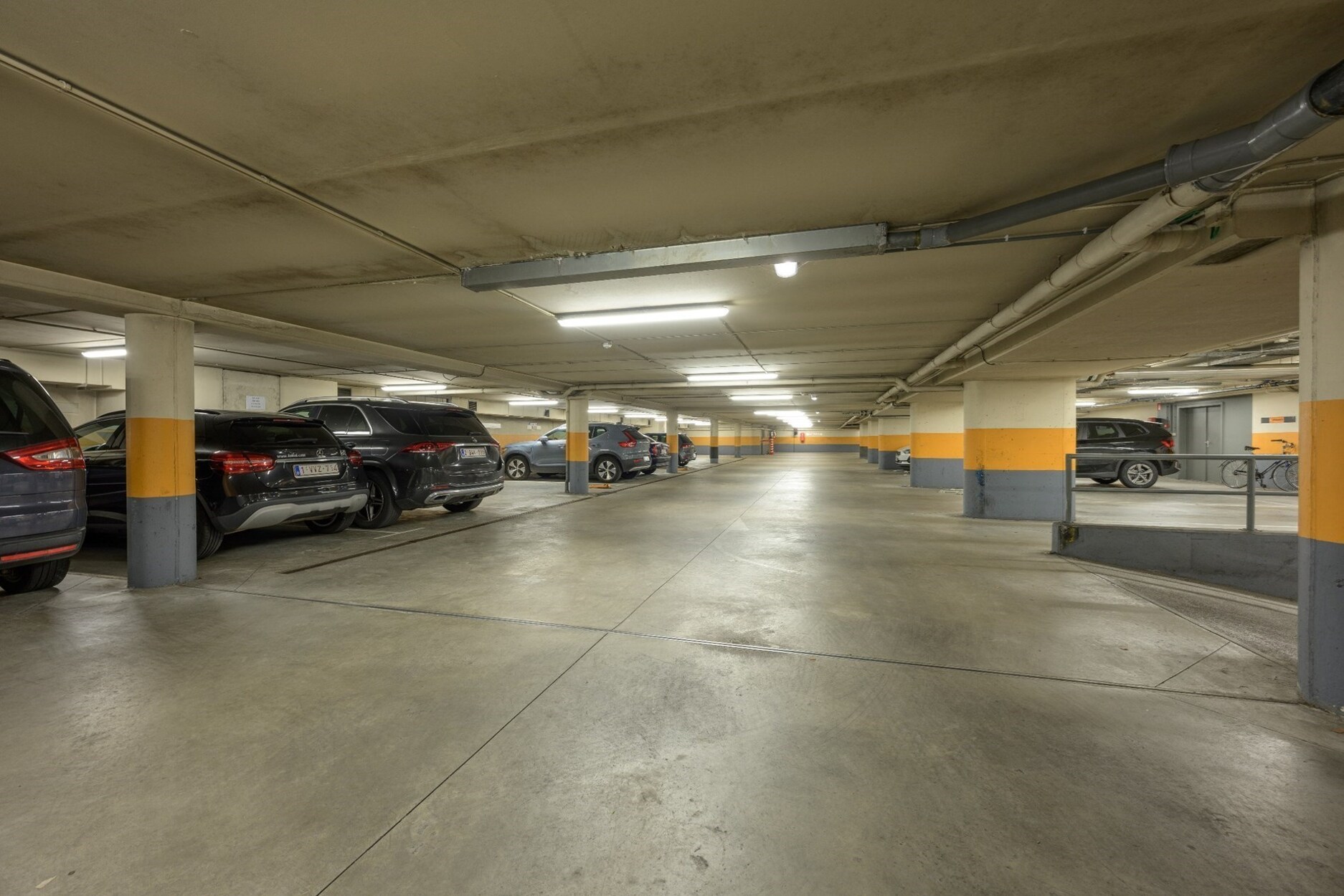 De lift komt toe in een eigen extra beveiligde hal. Bij het betreden van de inpandige centrale hal met gastentoilet merken we de lichtrijke leefruimte van 63m², deze is voorzien van een grote zit - eetruimte. Vanuit deze zone hebben we door de volledige glazen gevel op het terras met zicht op de Stad.