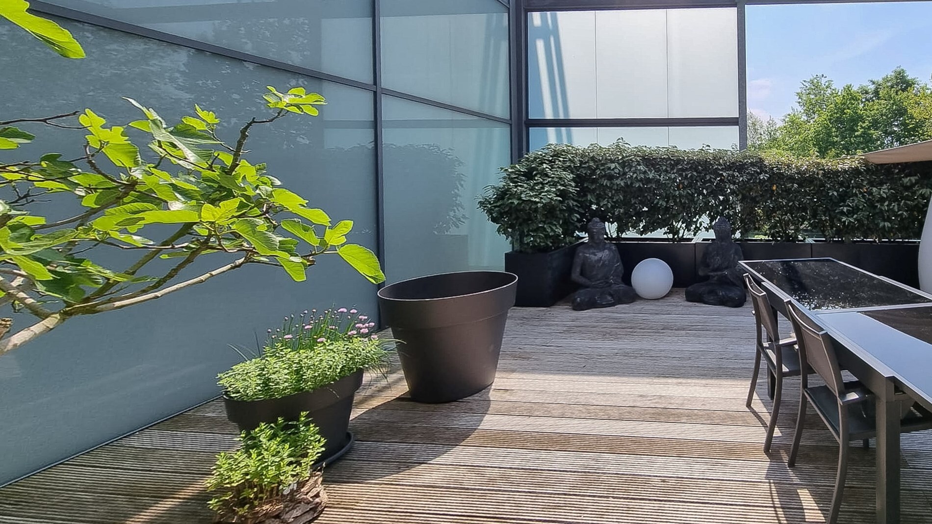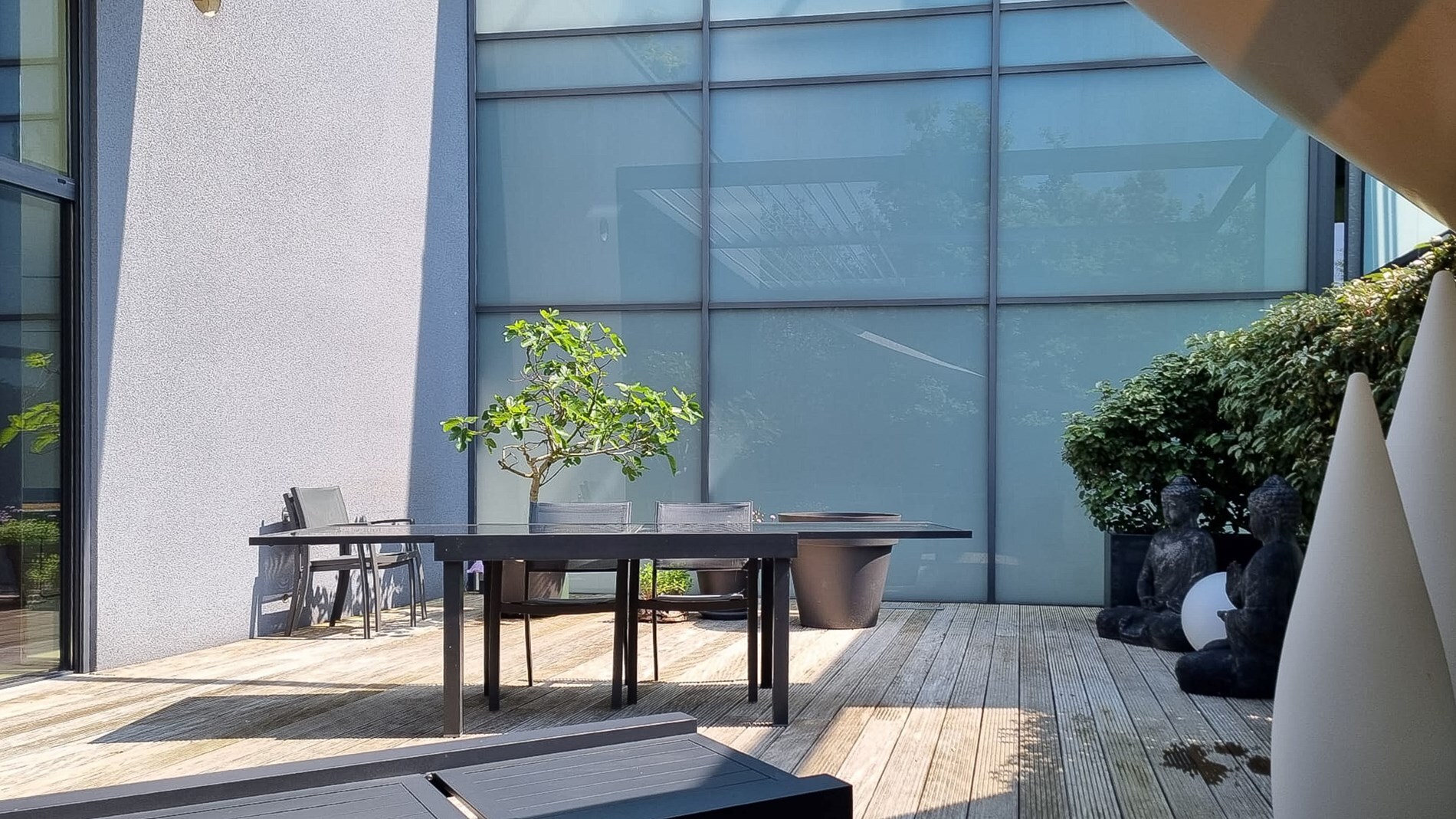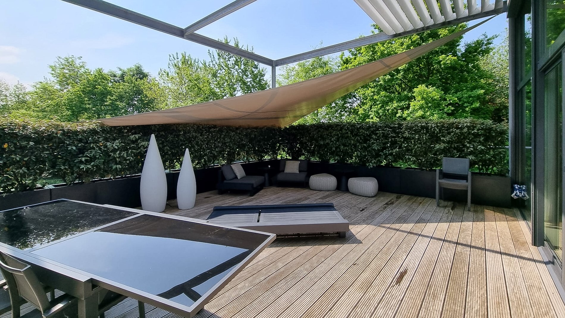 Zeer ruim zuidelijk geörienteerd terras van 67 m2 aan de leefruimte met zicht op groen en het tweede terras heeft een oppervlakte van 32 m2 en ligt aan de achterzijde.
