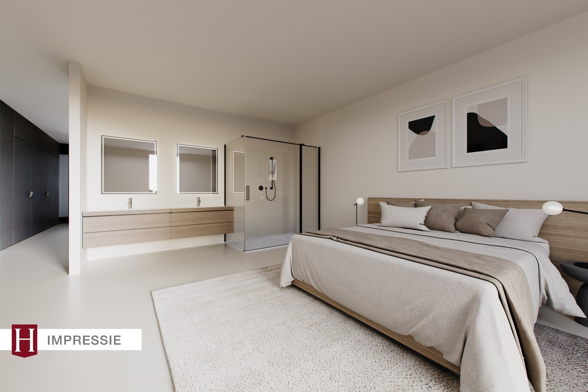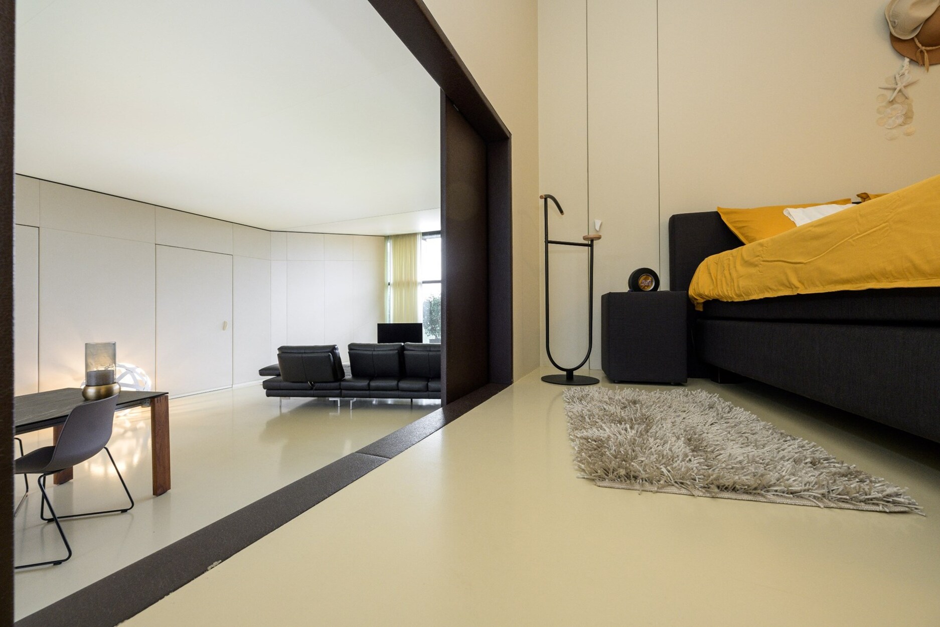 Zeer grote leefruimte met centraal een volledig met leder beklede box met daarin de masterbedroom met dressing en ensuite badkamer. Deze is zeer mooi afgewerkt met inloopdouche en stoomcabine. De box is volledig afsluitbaar van het woongedeelte en heeft ook een aparte toegang vanuit de hal.