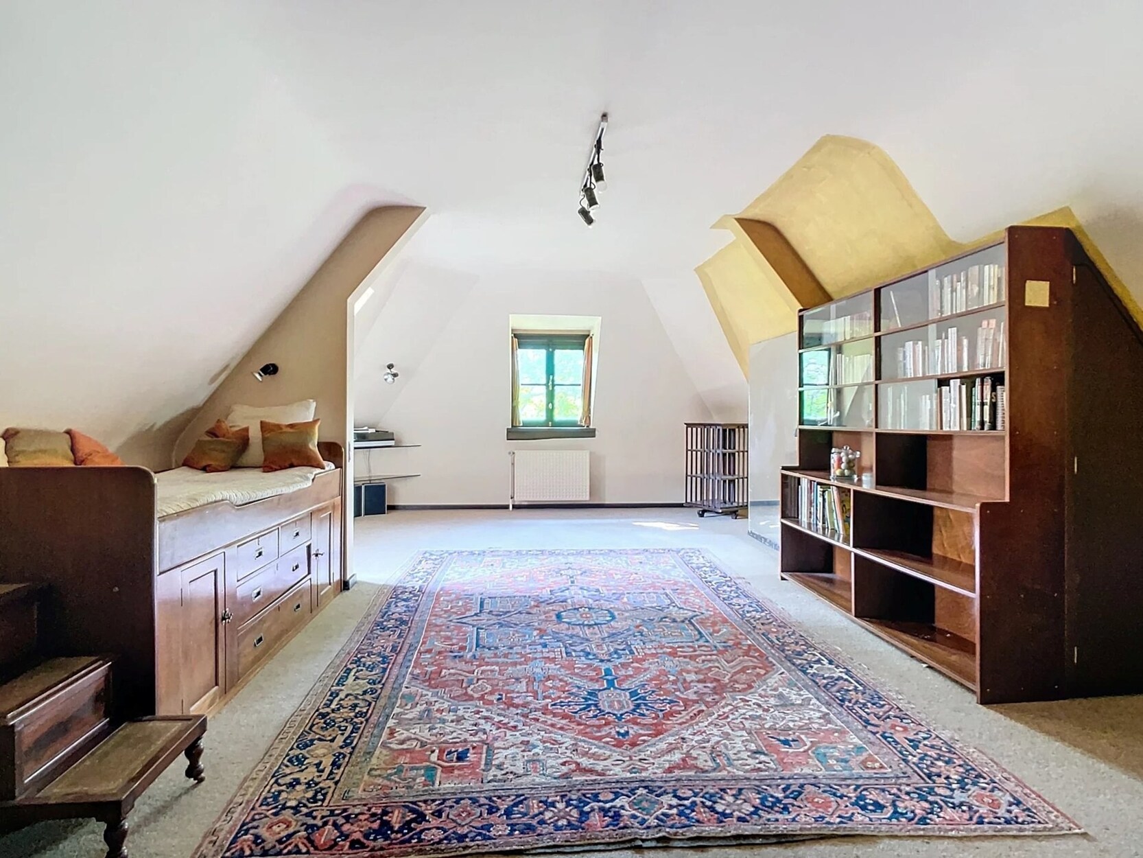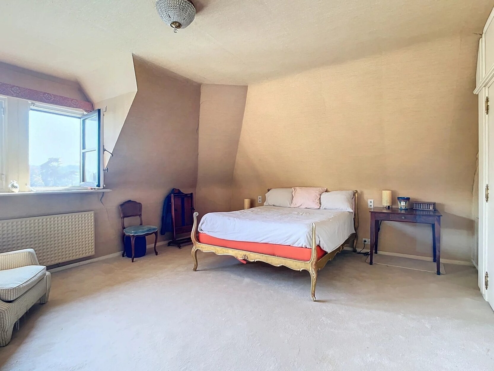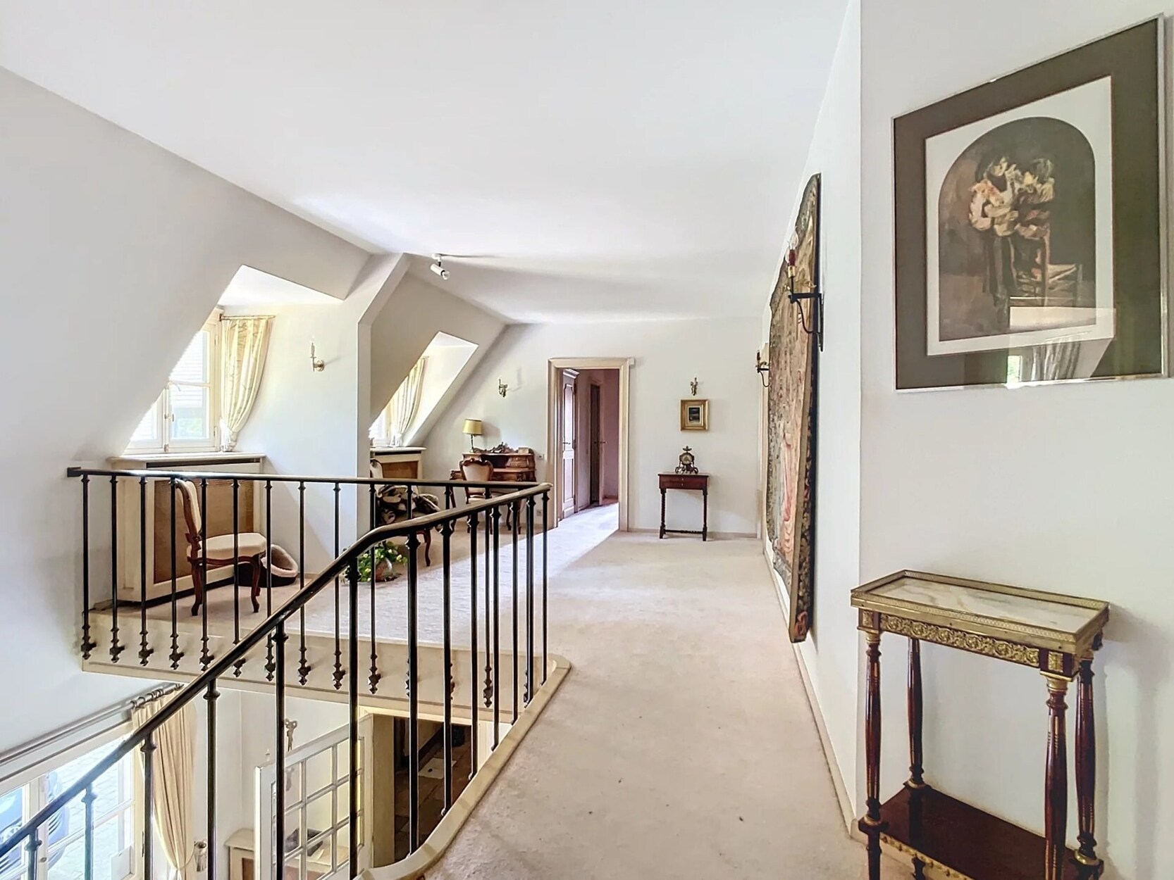 Op de bovenverdieping: vier slaapkamers, een grote studio met terras (om te bouwen tot meerdere slaapkamers), een kleedkamer, drie badkamers en een sauna.