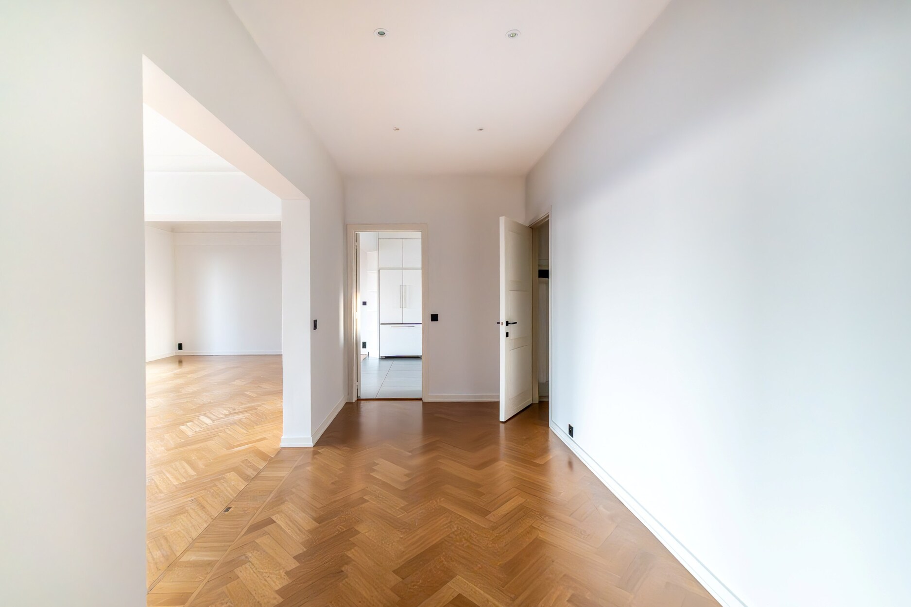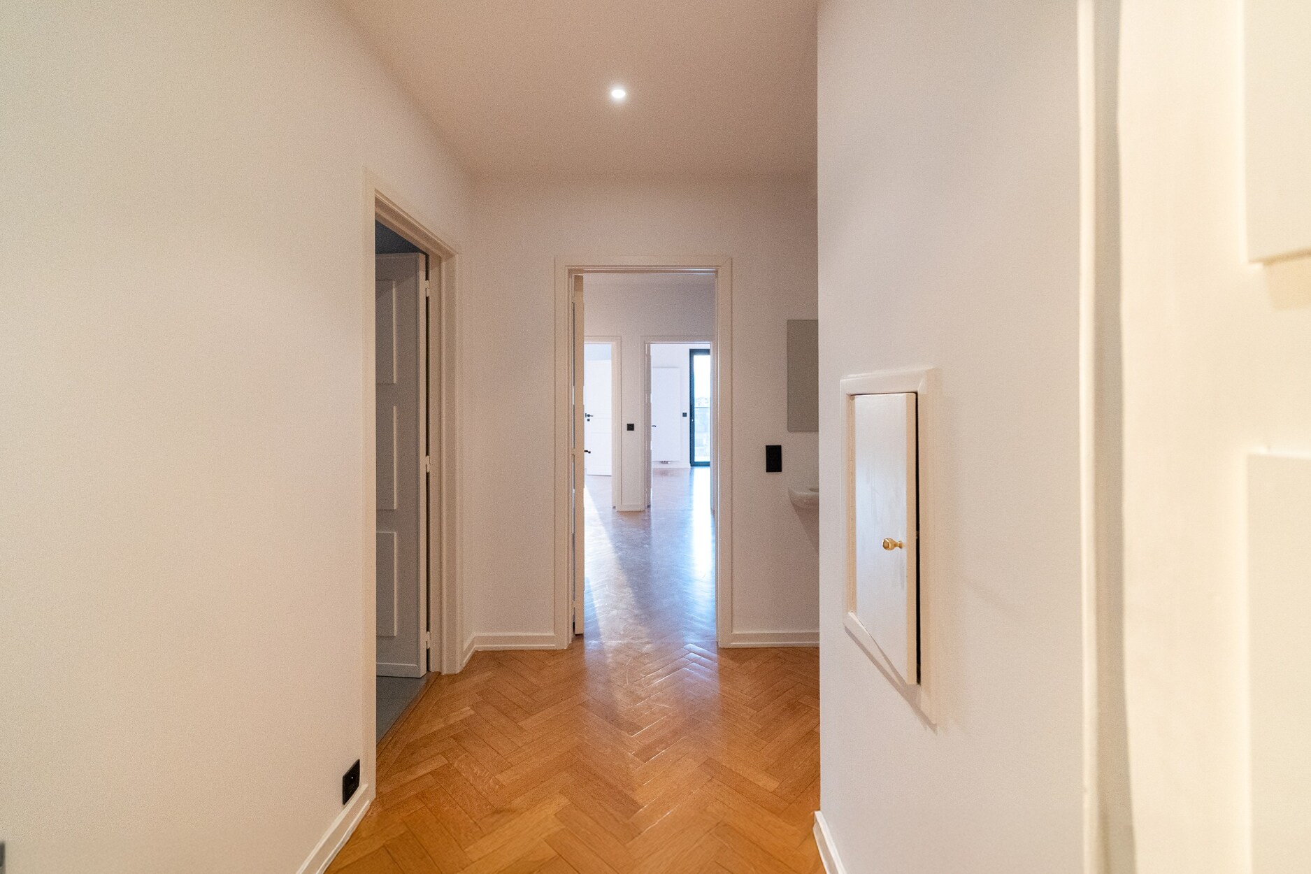 Volledig gerenoveerd in 2020 biedt het appartement een inkomhal die leidt naar de ontvangstruimten aan de voorzijde: salon, eetkamer en halfopen keuken met centraal eiland. Een wasruimte en een dienstlift vervolledigen deze zone. Aan de achterzijde bevindt zich het slaapgedeelte met een hoofdsuite voorzien van terras, dressing en en-suite badkamer, alsook twee bijkomende slaapkamers die een douchekamer delen.