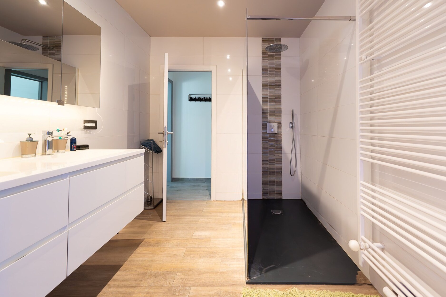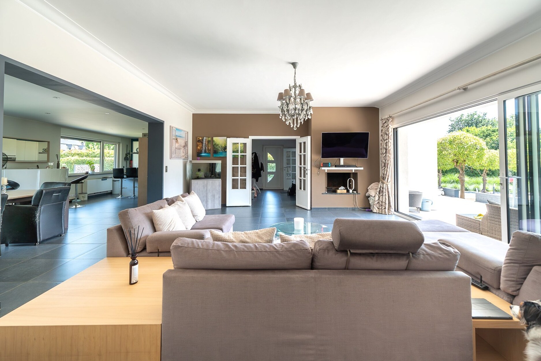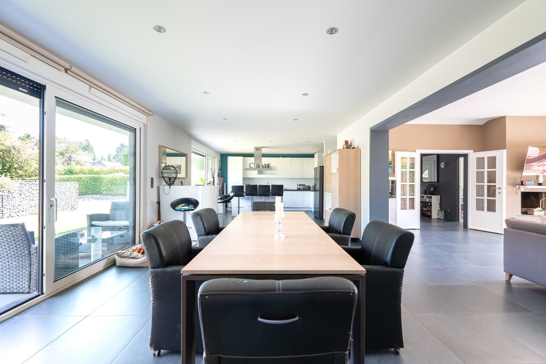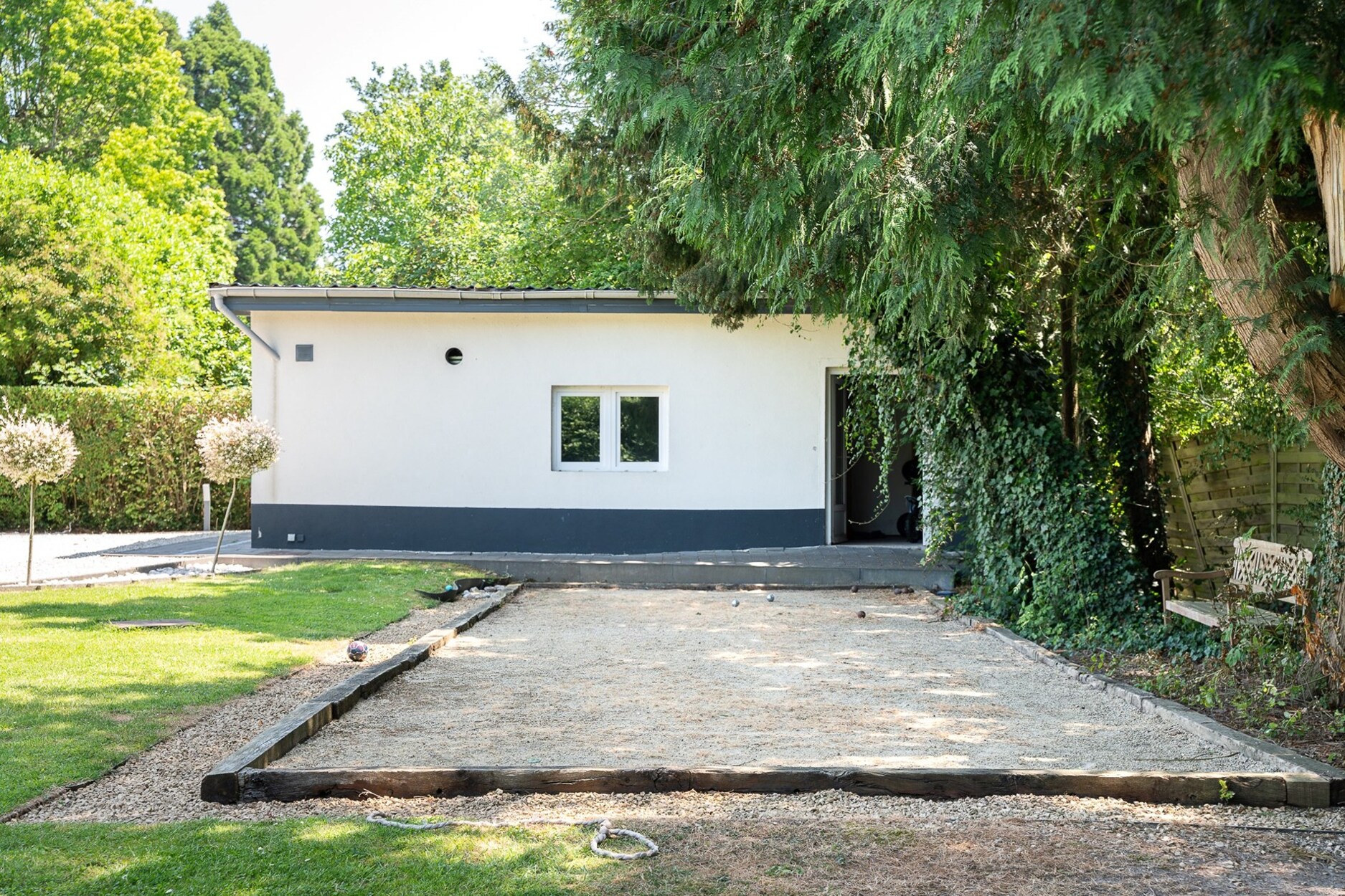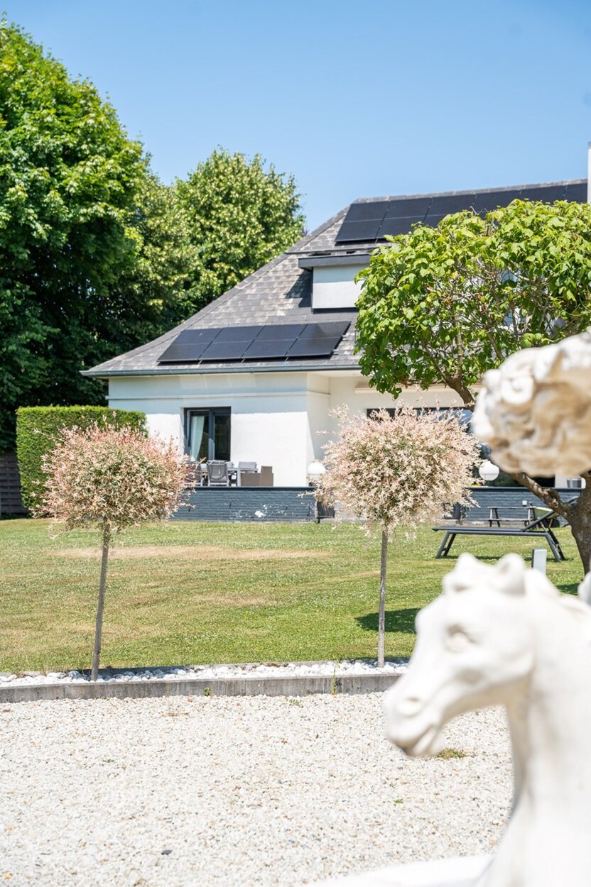 De bovenverdieping, meer klassiek, heeft drie extra slaapkamers en twee badkamers, met verschillende inrichtingsmogelijkheden. De tuin, intiem en verzorgd, vormt een oase van rust, met een jeu de boulesbaan. Het huis heeft 23 zonnepanelen en een stookolieketel.
