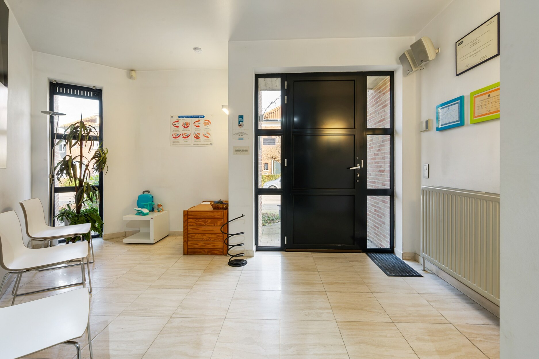 Indeling : Inkomhal met mezzanine, trap en toilet. Leefruimte met mezzanine, TV-hoek, eetplaats, keuken en ontbijthoek, wasplaats/berging, toegang tot praktijkruimte en kelders.Dubbele garage.Tweede inkom/wachtruimte met toilet.