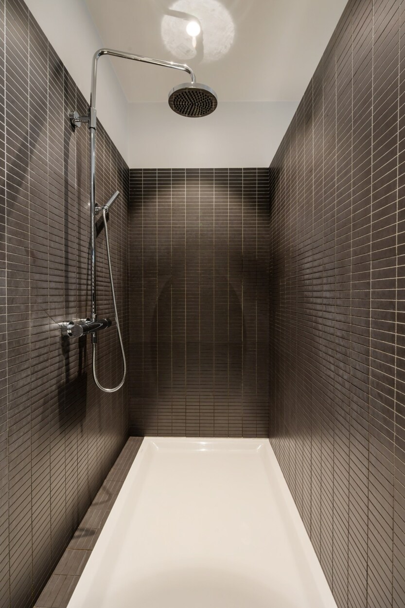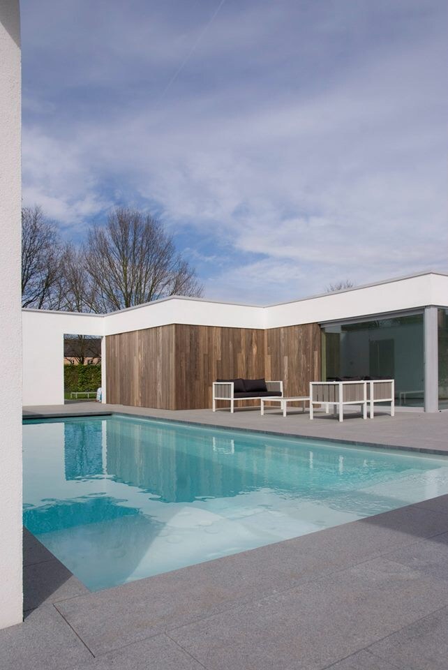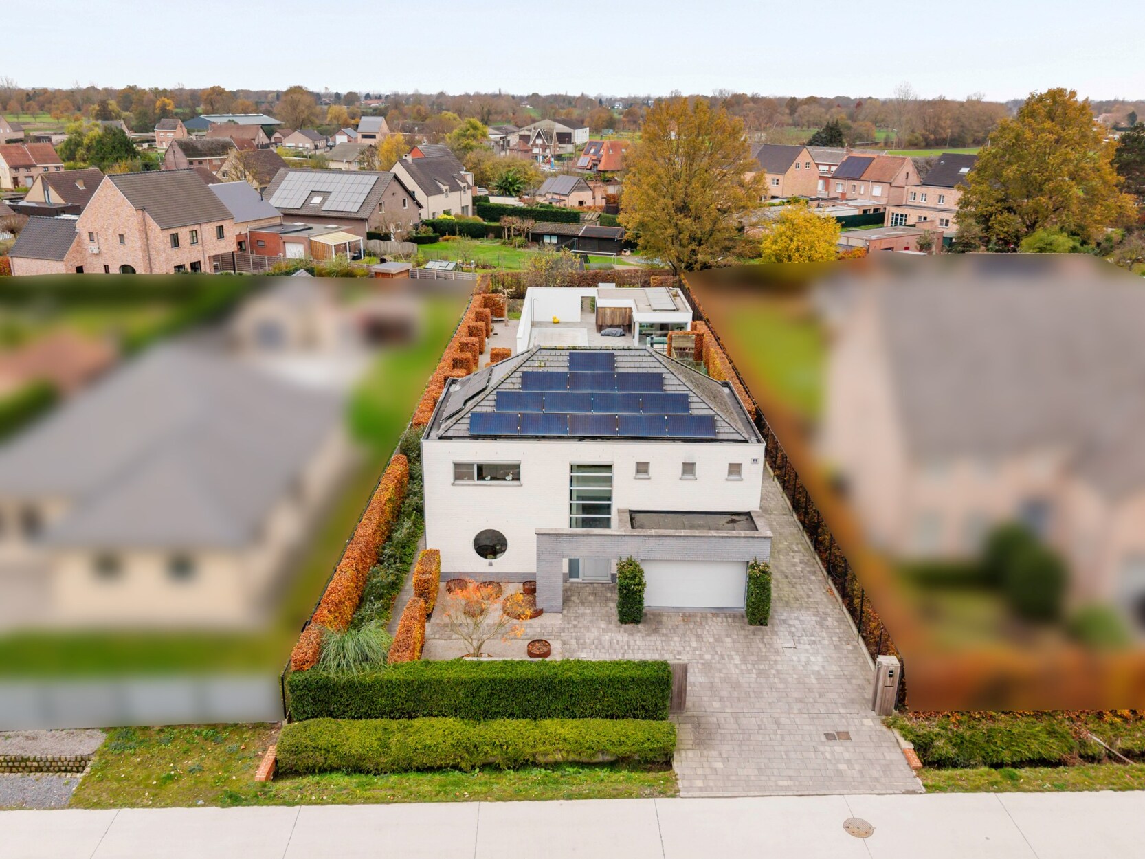 Achteraan de woning bevindt zich een ruim en zonnig terras met lamellen, waar men in alle privacy kan genieten. Het stijlvolle poolhouse is volledig voorzien van vloerverwarming en beschikt over een apart toilet, met bovendien de mogelijkheid om een douche te installeren. Deze ruimte wordt momenteel ingericht als bureau. Aan het zwembad is eveneens een praktische buitendouche voorzien.