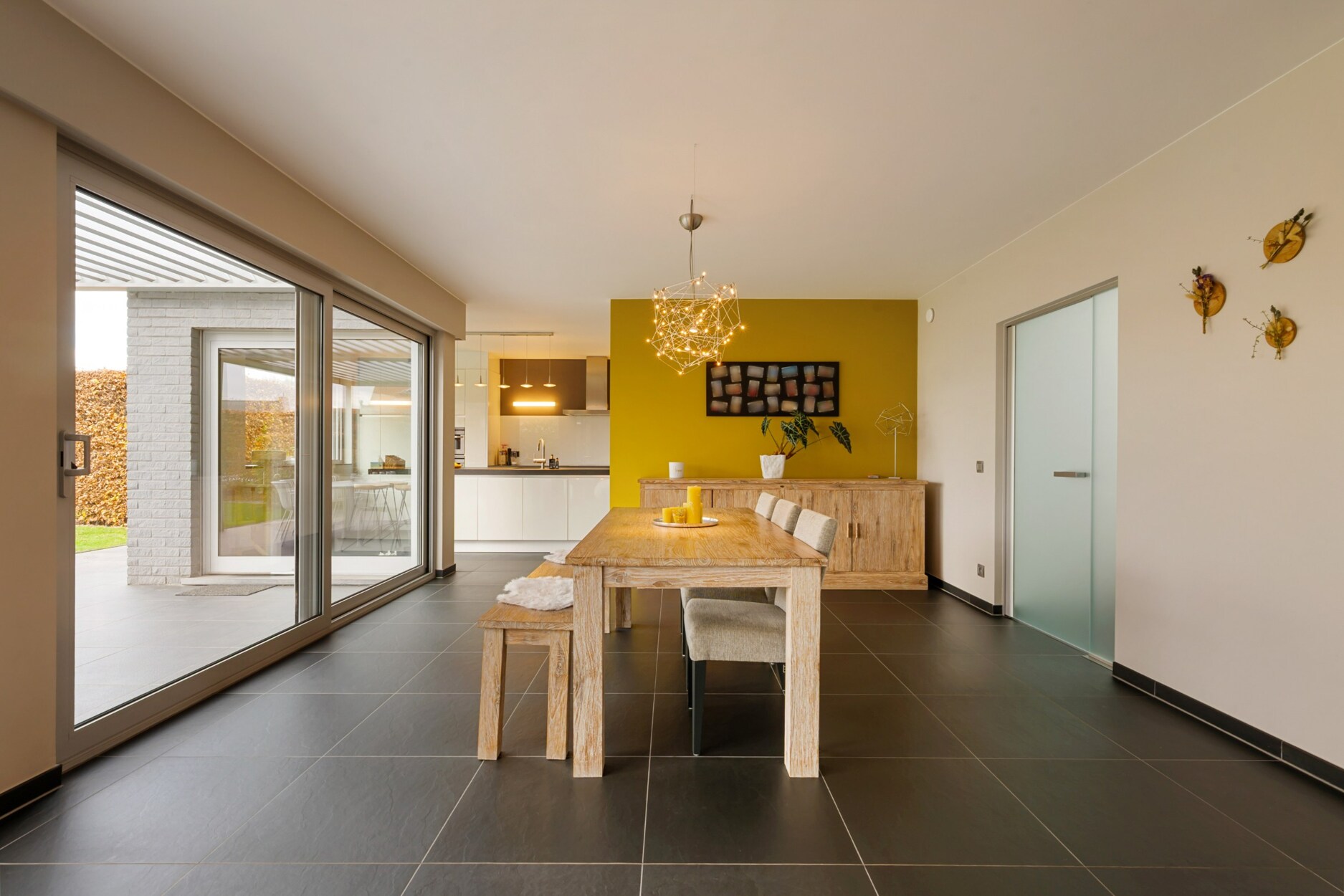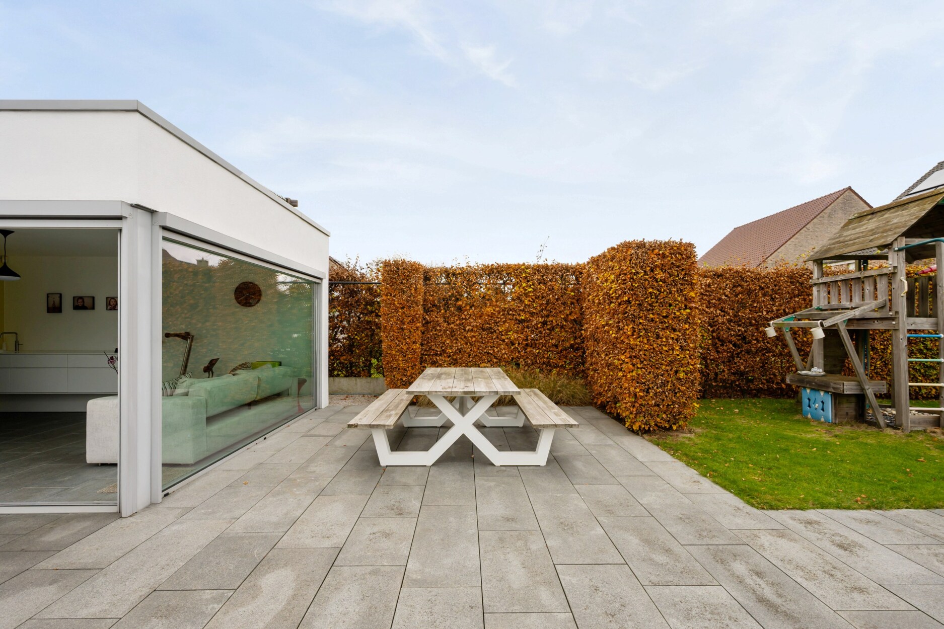 Bij het betreden van de woning komen we in een lichtrijke inkomhal met gastentoilet en handige opbergruimte. De ruime en gezellige leefruimte sluit perfect aan op de volledig ingerichte keuken en biedt een mooi open zicht op de tuin. Aansluitend vinden we een ruime berging met toegang tot de garage, die uitgerust is met een laadpaal voor elektrische wagens.
