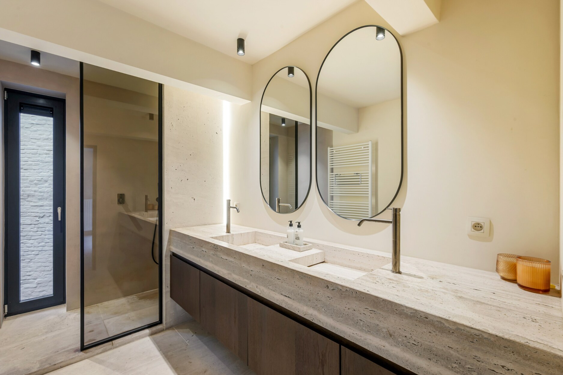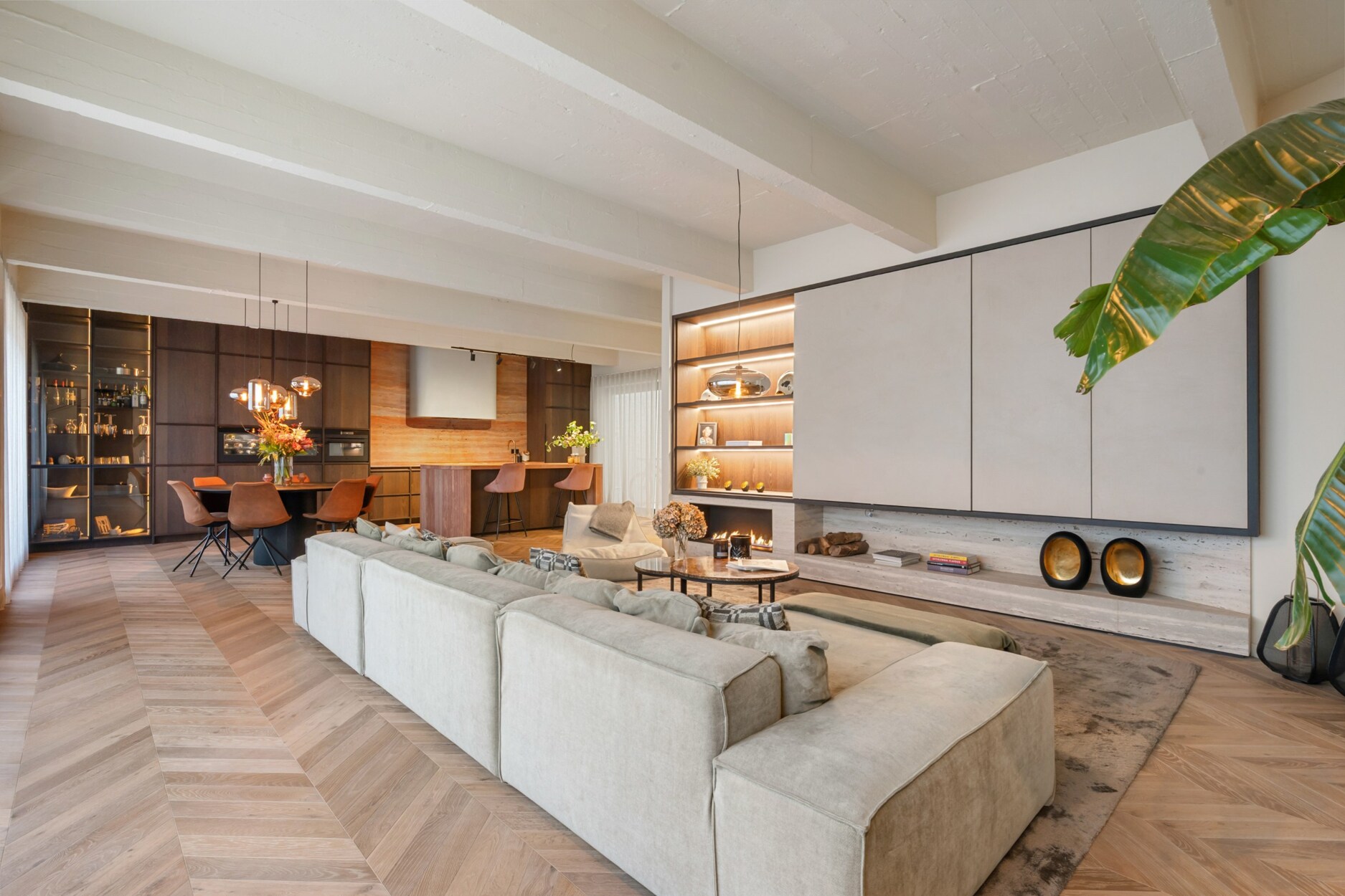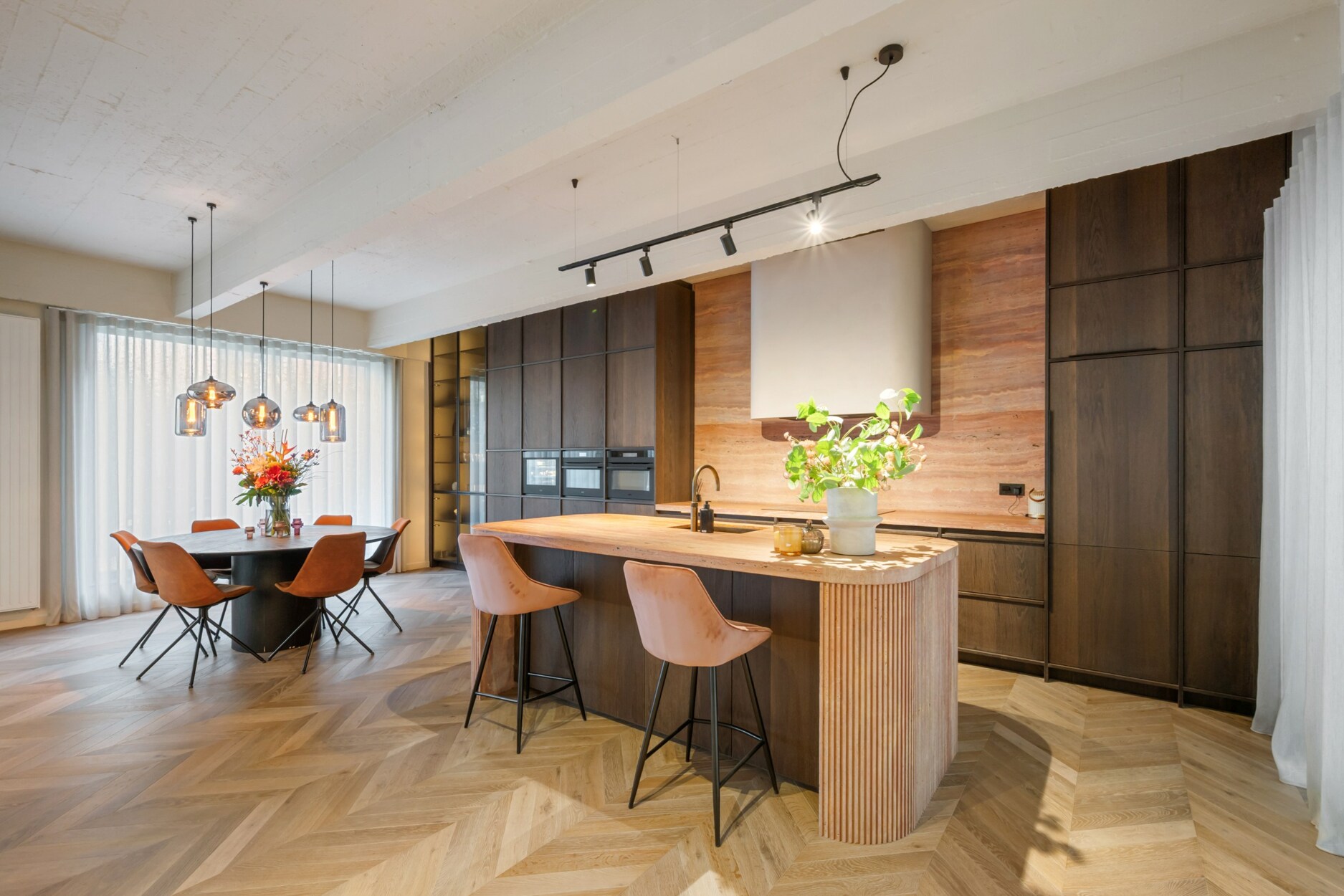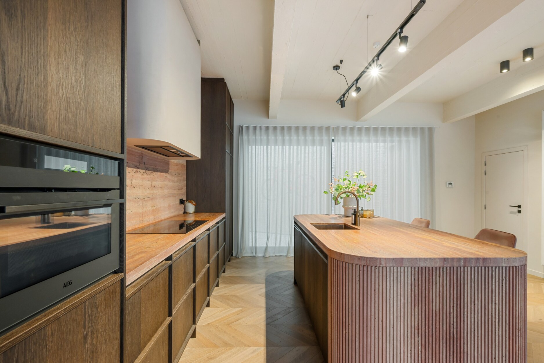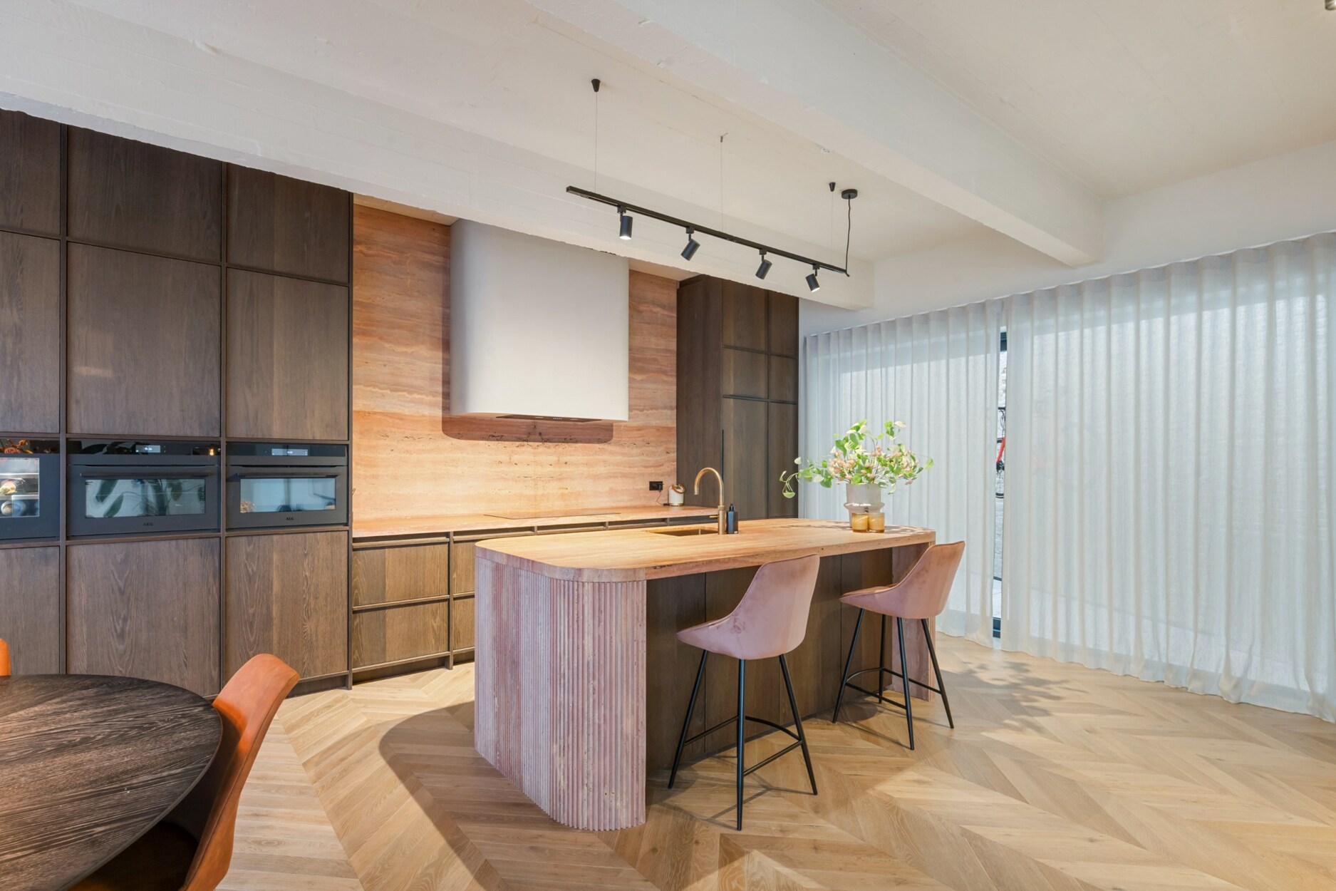 Binnen verwelkomt de inkomhal u met een trap en rechtstreekse toegang tot de kelderverdieping met ondergrondse parkeerplaats. De leefruimte met open keuken werd ingericht met een bijzonder verfijnde smaak: een elegante bio-ethanolhaard, warme fineer houten kasten en luxueuze roze travertin die het geheel een zachte, moderne luxe geeft. De keuken is volledig uitgerust met hoogwaardige toestellen (Quooker, combi-oven, koelkast, diepvries, wijnkoeler en vaatwasser) en beschikt aansluitend over een praktische berging en een knusse koer.